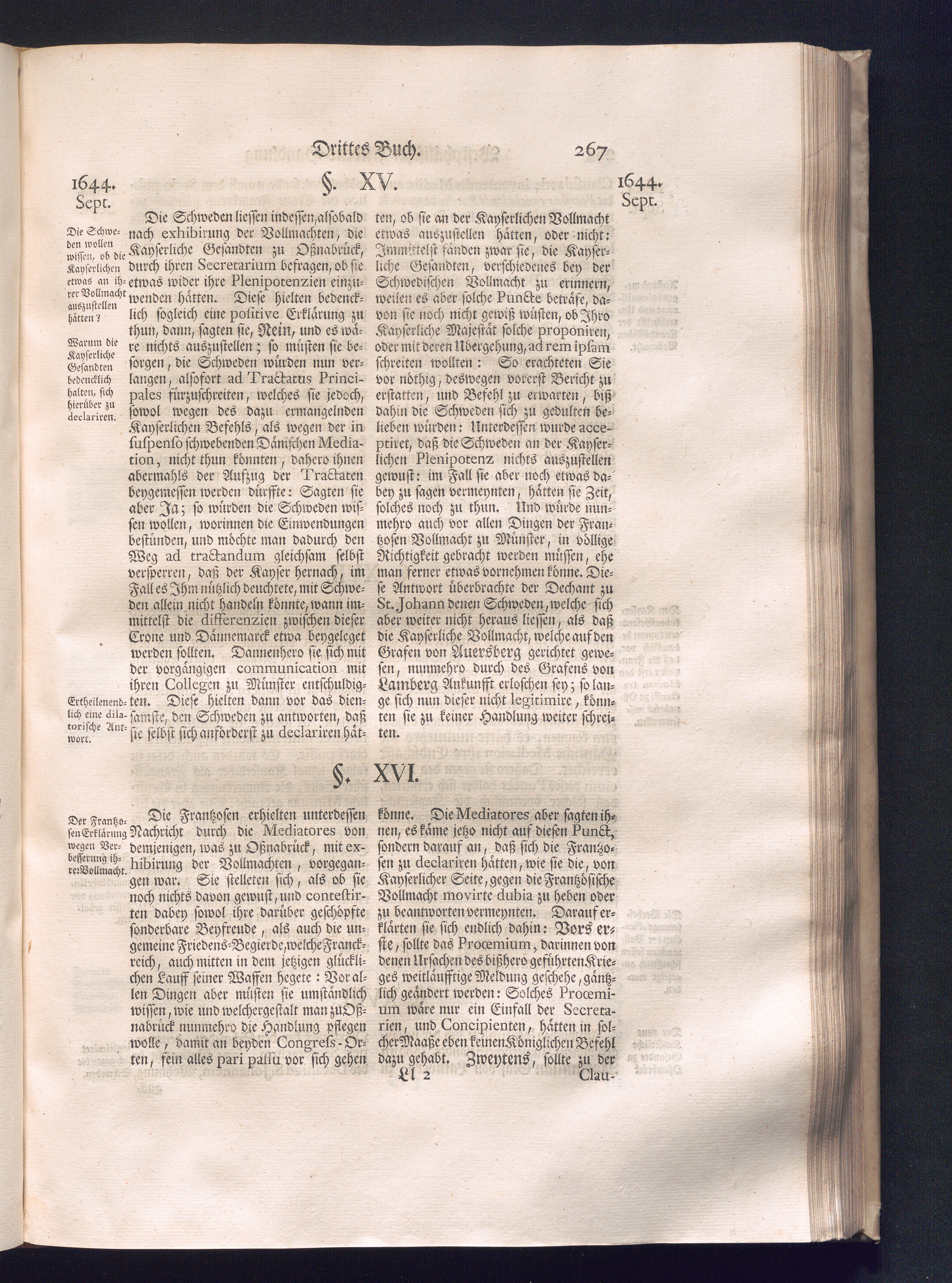 Erster Theil (1734) Worinnen enthalten, was vom Jahr 1643. biß in den Monath October Anno 1645. zwischen Jhro Römisch-Käyserlichen Majestät, dann den Beyden Cronen Franckreich und Schweden, ingleichen des Heiligen Römischen Reichs Chur-Fürsten, Fürsten und Ständen, zu Oßnabrück und Münster gehandelt worden