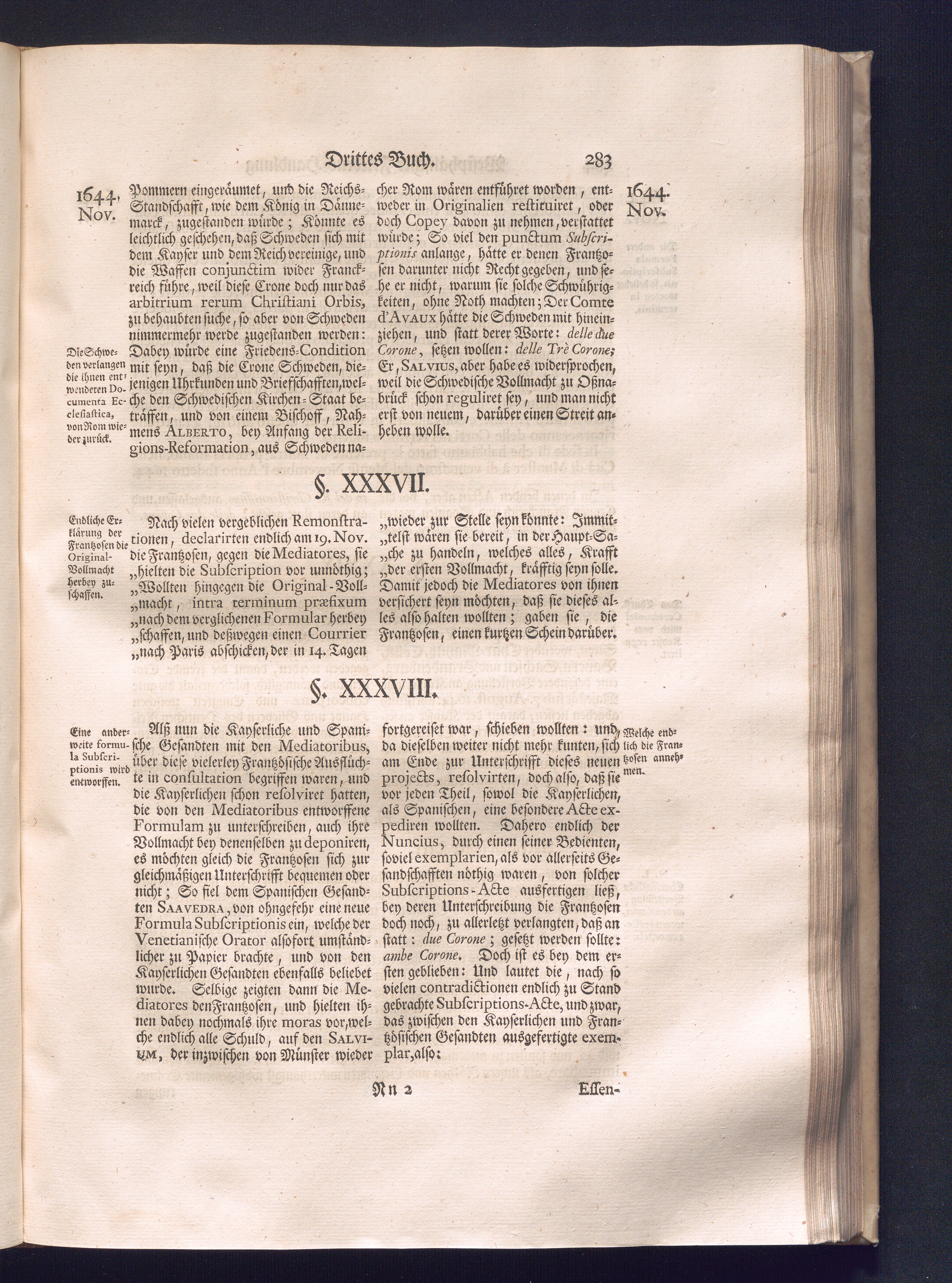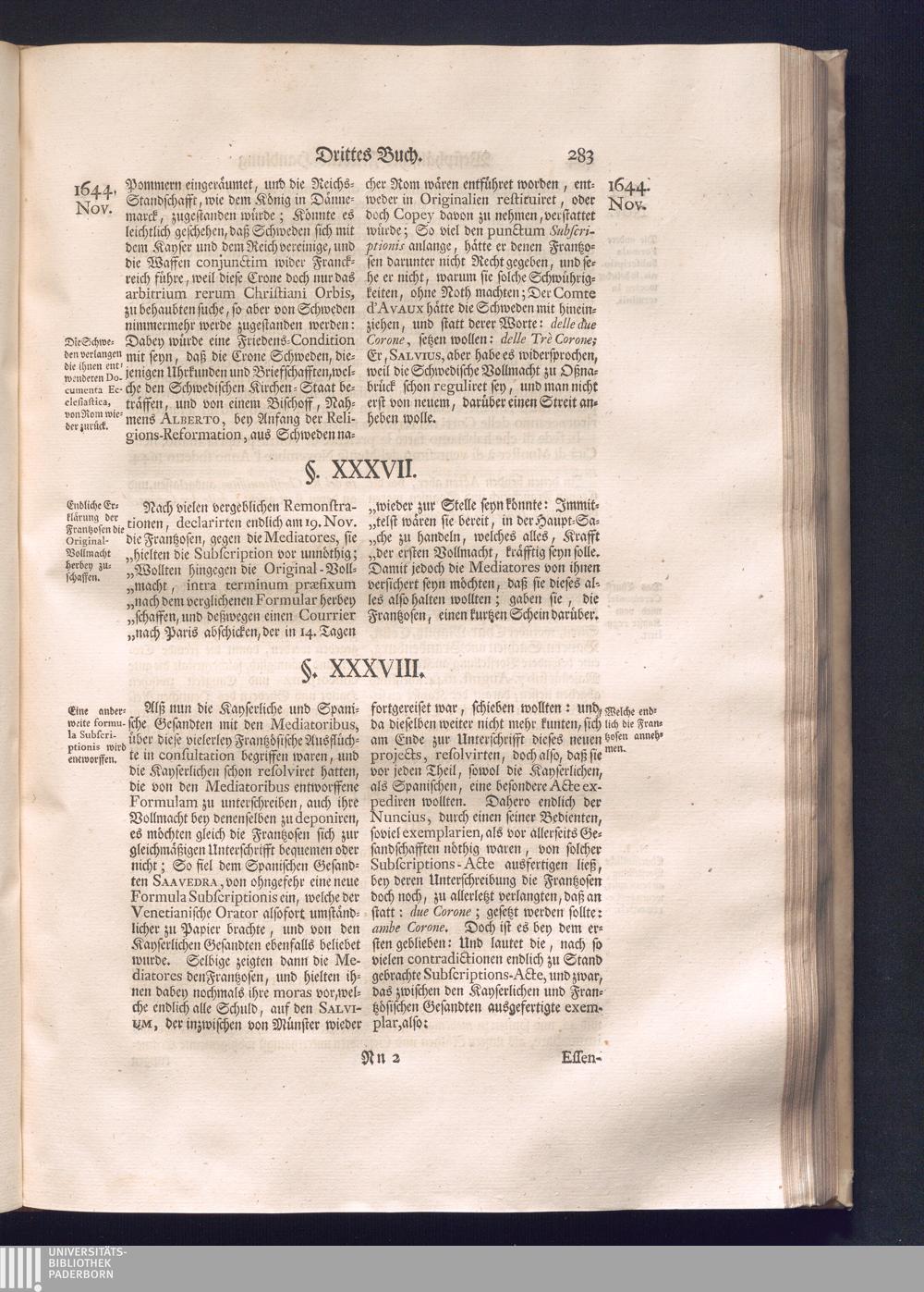 Erster Theil (1734) Worinnen enthalten, was vom Jahr 1643. biß in den Monath October Anno 1645. zwischen Jhro Römisch-Käyserlichen Majestät, dann den Beyden Cronen Franckreich und Schweden, ingleichen des Heiligen Römischen Reichs Chur-Fürsten, Fürsten und Ständen, zu Oßnabrück und Münster gehandelt worden