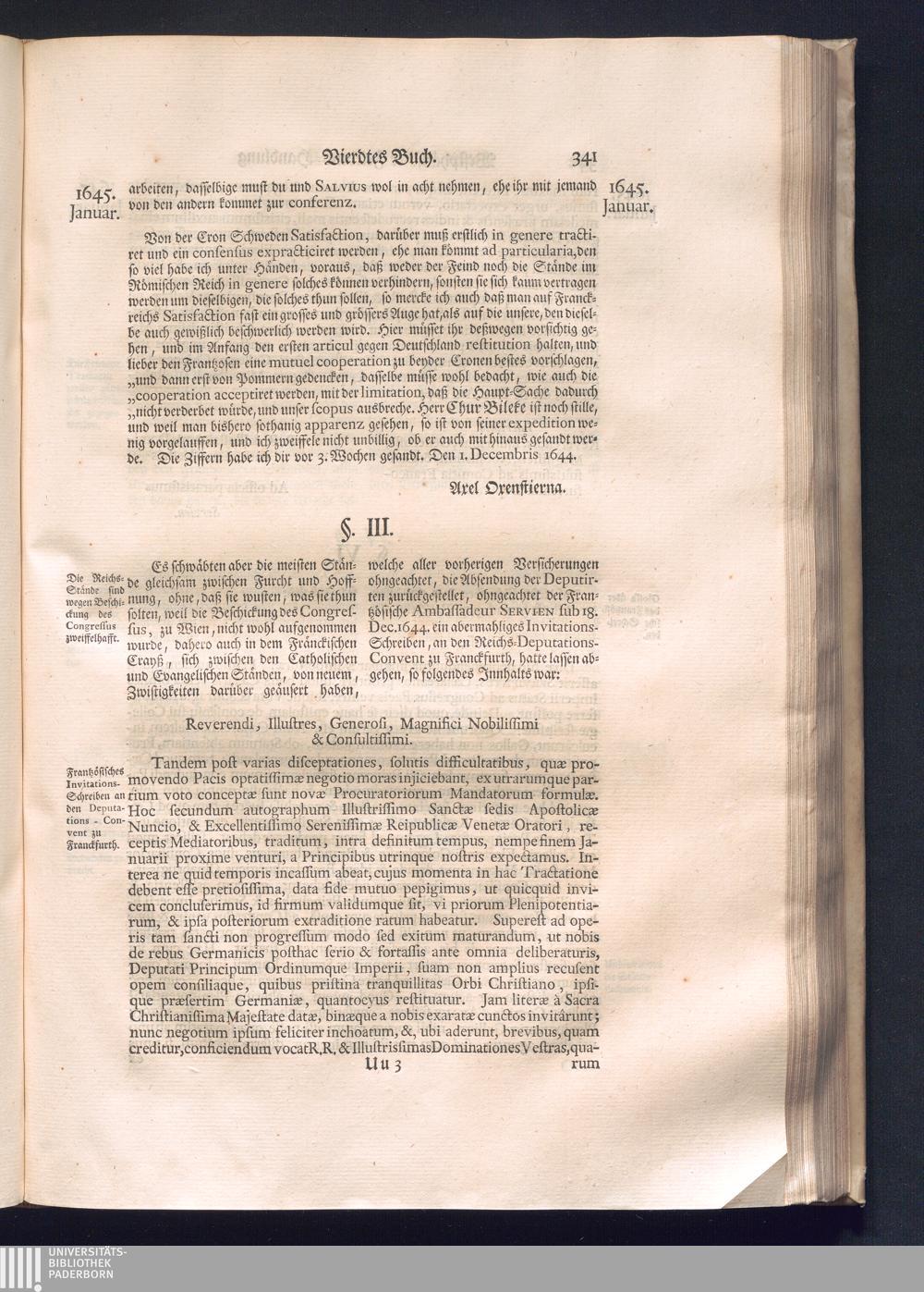 Erster Theil (1734) Worinnen enthalten, was vom Jahr 1643. biß in den Monath October Anno 1645. zwischen Jhro Römisch-Käyserlichen Majestät, dann den Beyden Cronen Franckreich und Schweden, ingleichen des Heiligen Römischen Reichs Chur-Fürsten, Fürsten und Ständen, zu Oßnabrück und Münster gehandelt worden
