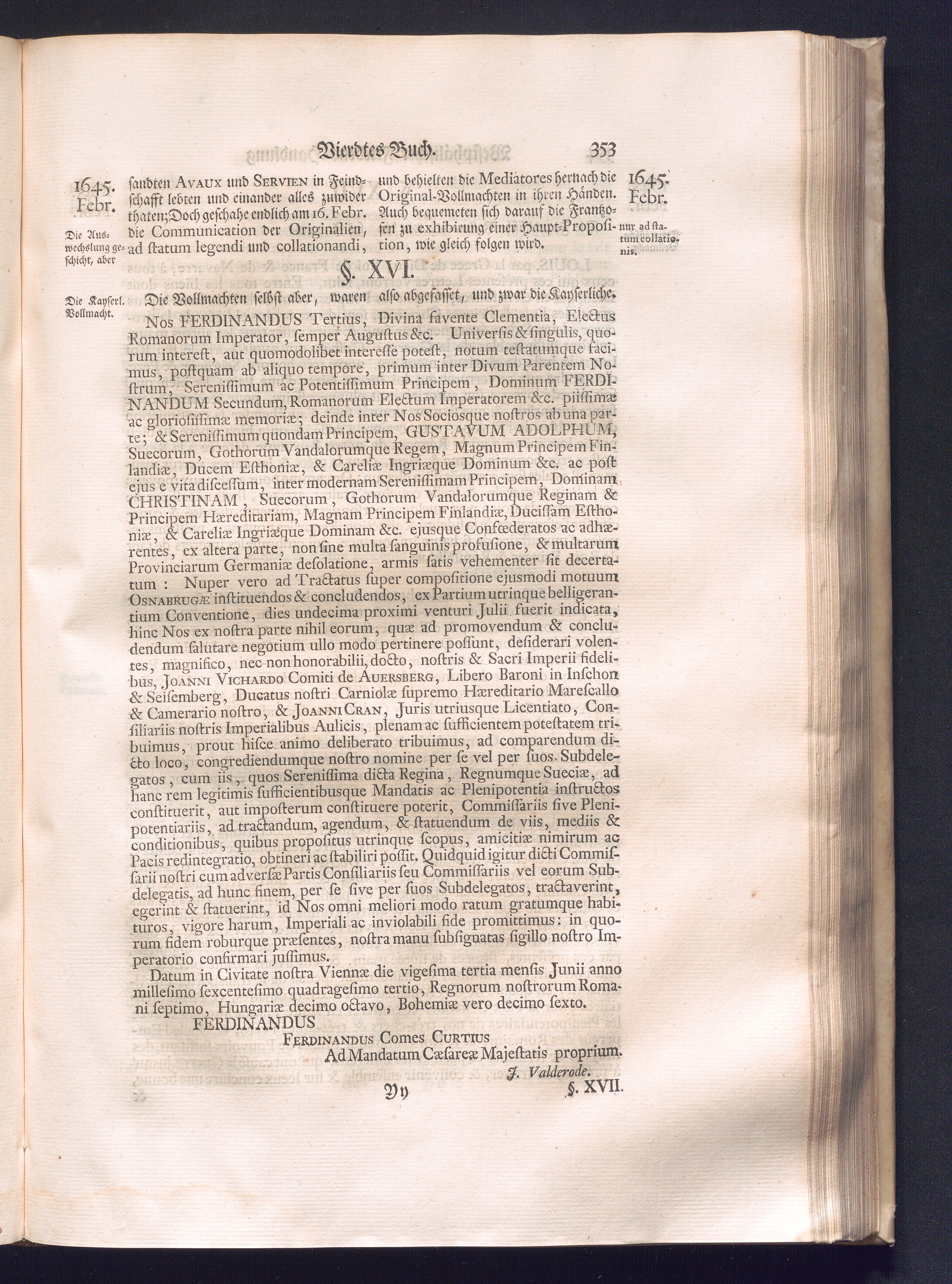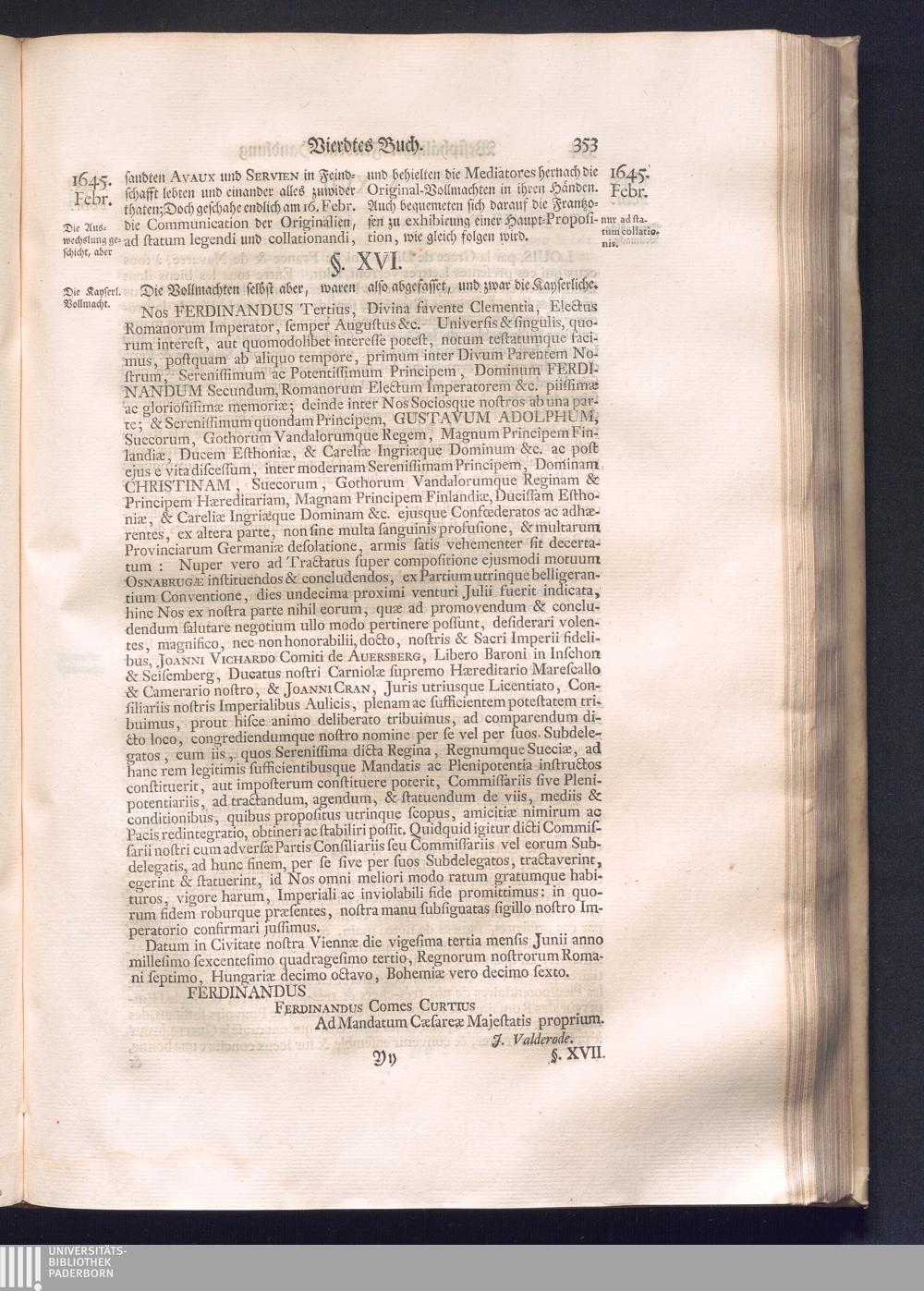 Erster Theil (1734) Worinnen enthalten, was vom Jahr 1643. biß in den Monath October Anno 1645. zwischen Jhro Römisch-Käyserlichen Majestät, dann den Beyden Cronen Franckreich und Schweden, ingleichen des Heiligen Römischen Reichs Chur-Fürsten, Fürsten und Ständen, zu Oßnabrück und Münster gehandelt worden
