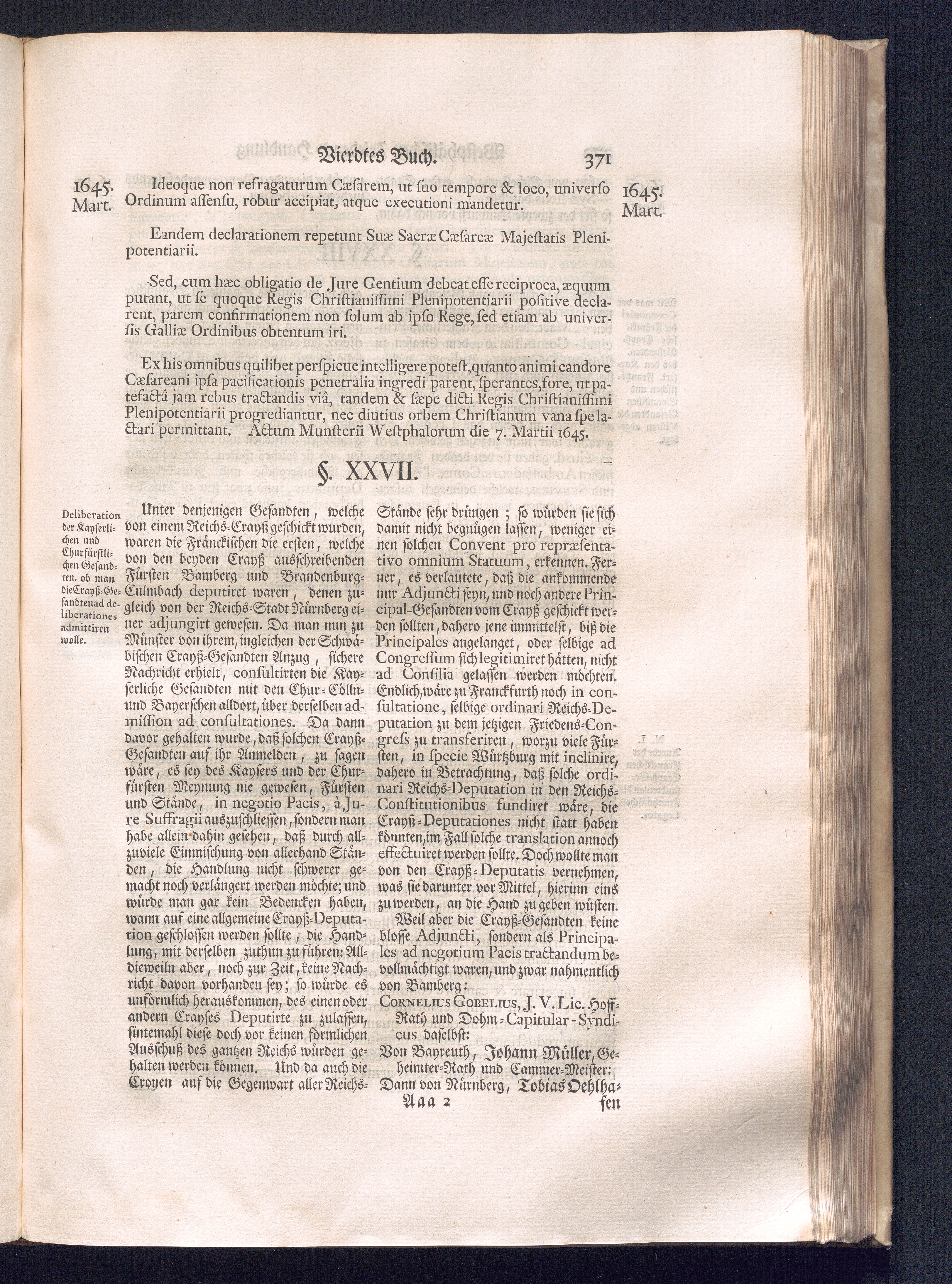 Erster Theil (1734) Worinnen enthalten, was vom Jahr 1643. biß in den Monath October Anno 1645. zwischen Jhro Römisch-Käyserlichen Majestät, dann den Beyden Cronen Franckreich und Schweden, ingleichen des Heiligen Römischen Reichs Chur-Fürsten, Fürsten und Ständen, zu Oßnabrück und Münster gehandelt worden