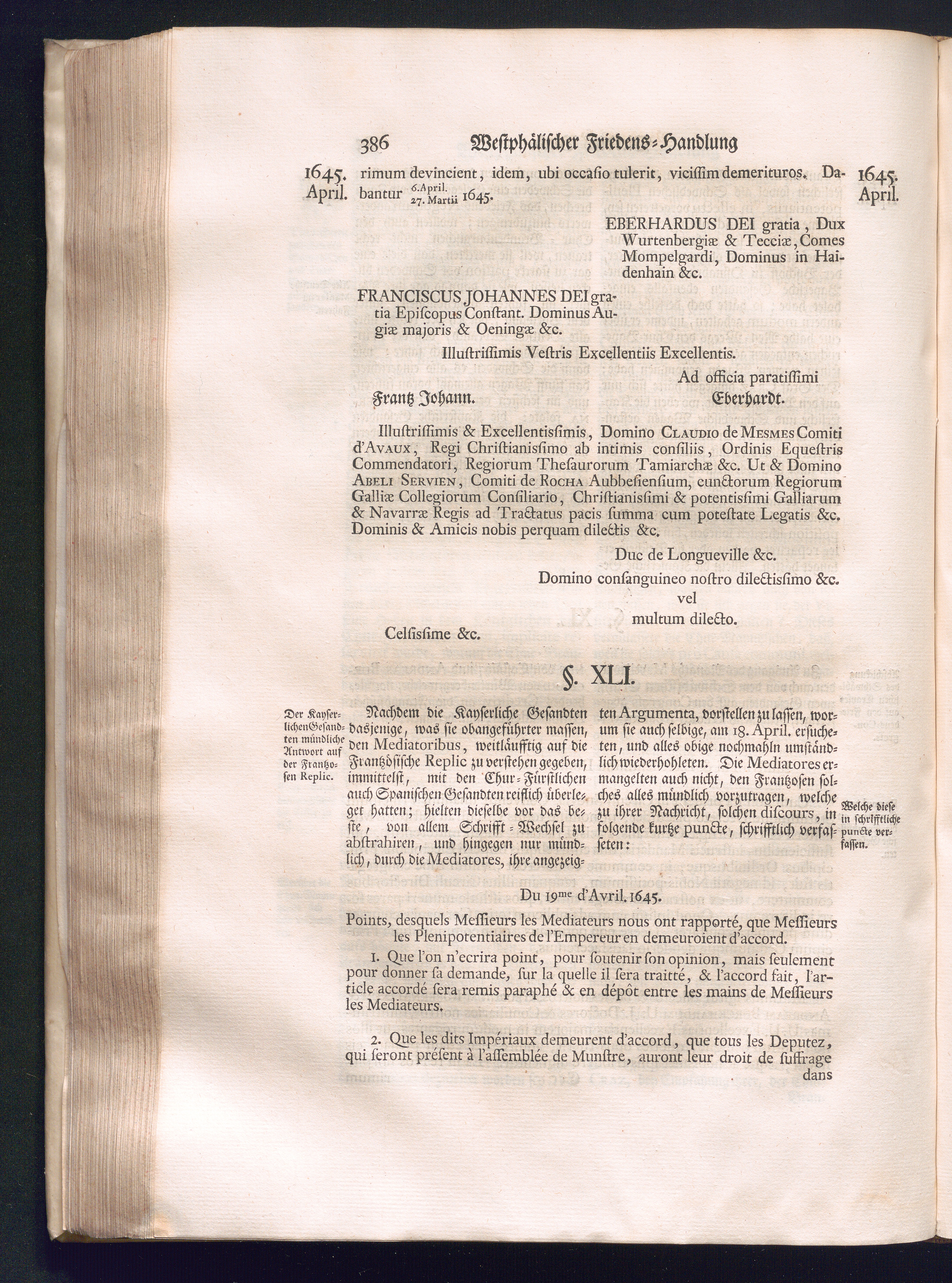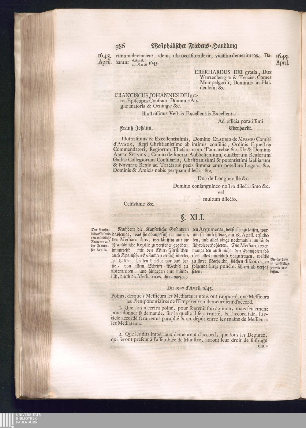 Erster Theil (1734) Worinnen enthalten, was vom Jahr 1643. biß in den Monath October Anno 1645. zwischen Jhro Römisch-Käyserlichen Majestät, dann den Beyden Cronen Franckreich und Schweden, ingleichen des Heiligen Römischen Reichs Chur-Fürsten, Fürsten und Ständen, zu Oßnabrück und Münster gehandelt worden