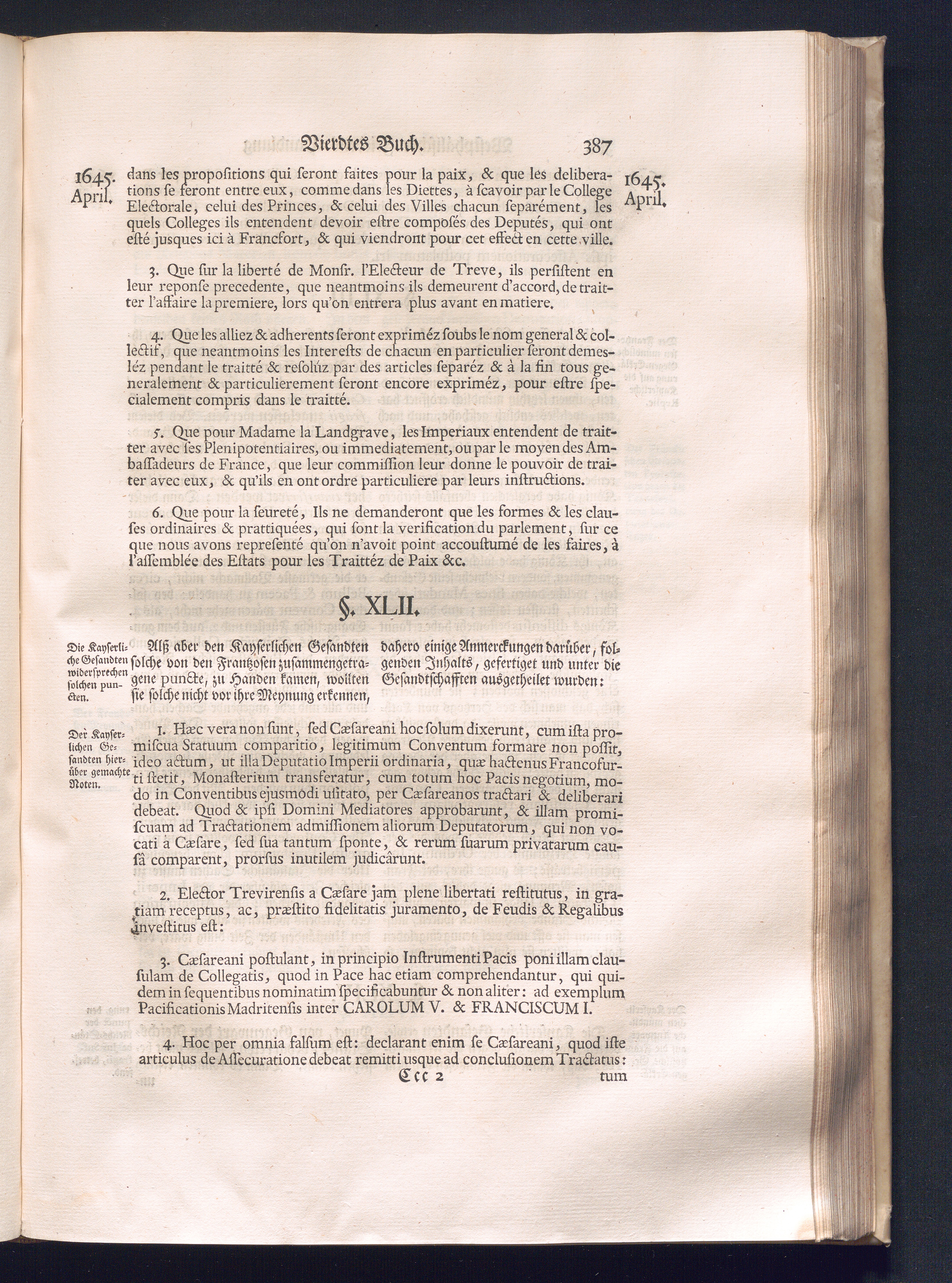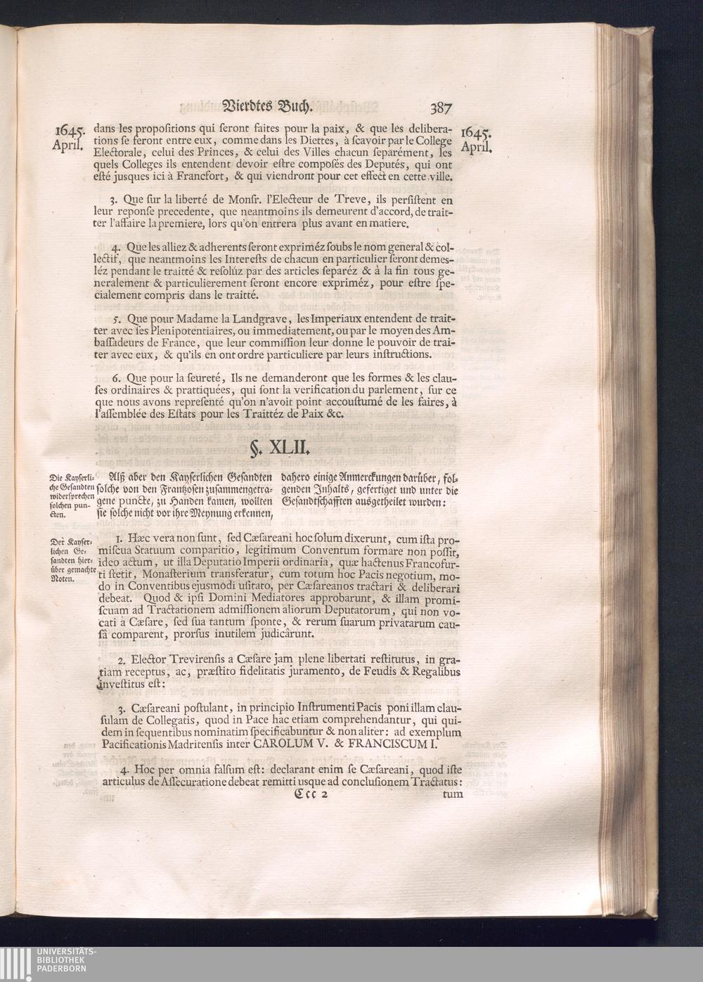 Erster Theil (1734) Worinnen enthalten, was vom Jahr 1643. biß in den Monath October Anno 1645. zwischen Jhro Römisch-Käyserlichen Majestät, dann den Beyden Cronen Franckreich und Schweden, ingleichen des Heiligen Römischen Reichs Chur-Fürsten, Fürsten und Ständen, zu Oßnabrück und Münster gehandelt worden