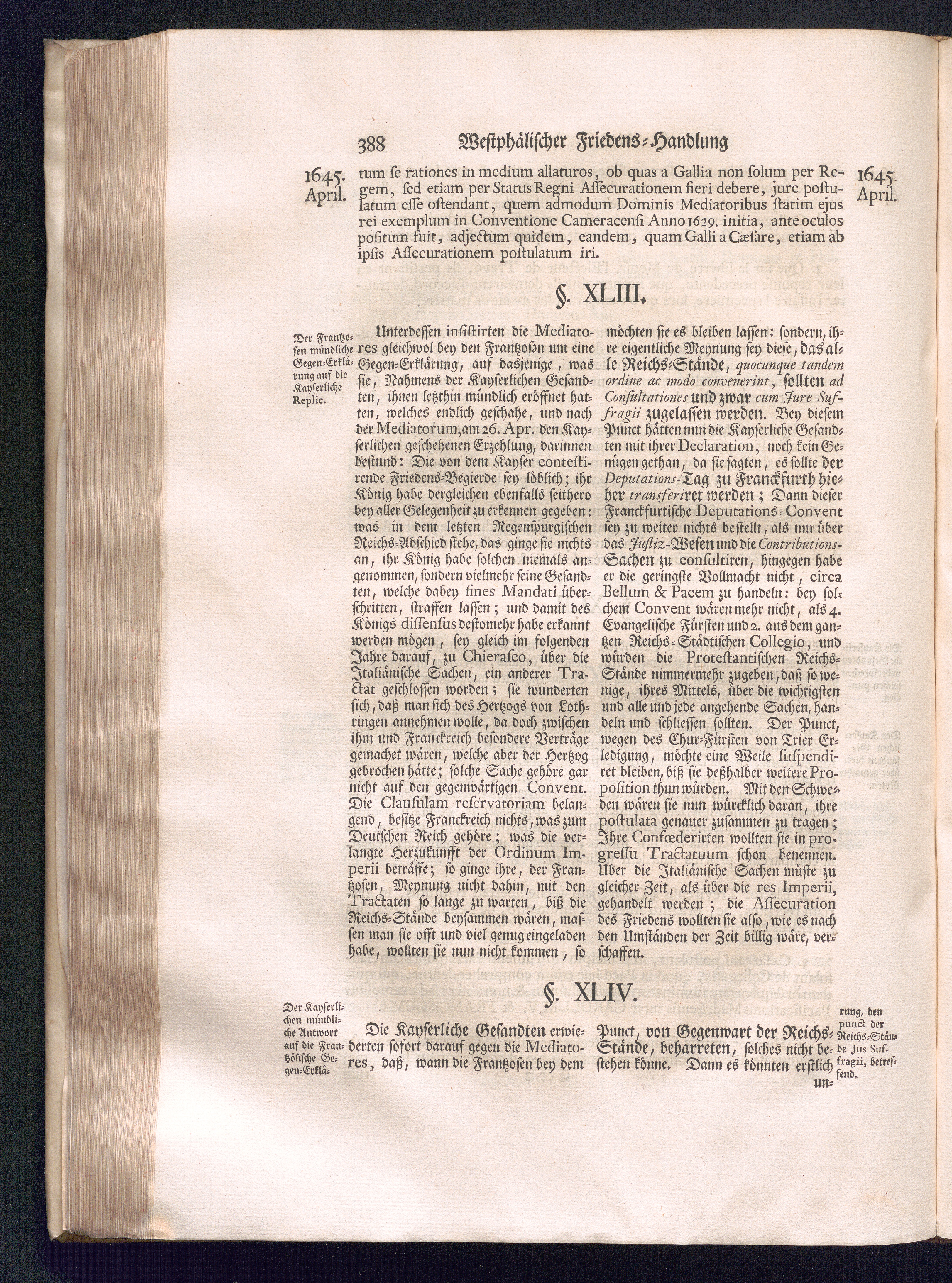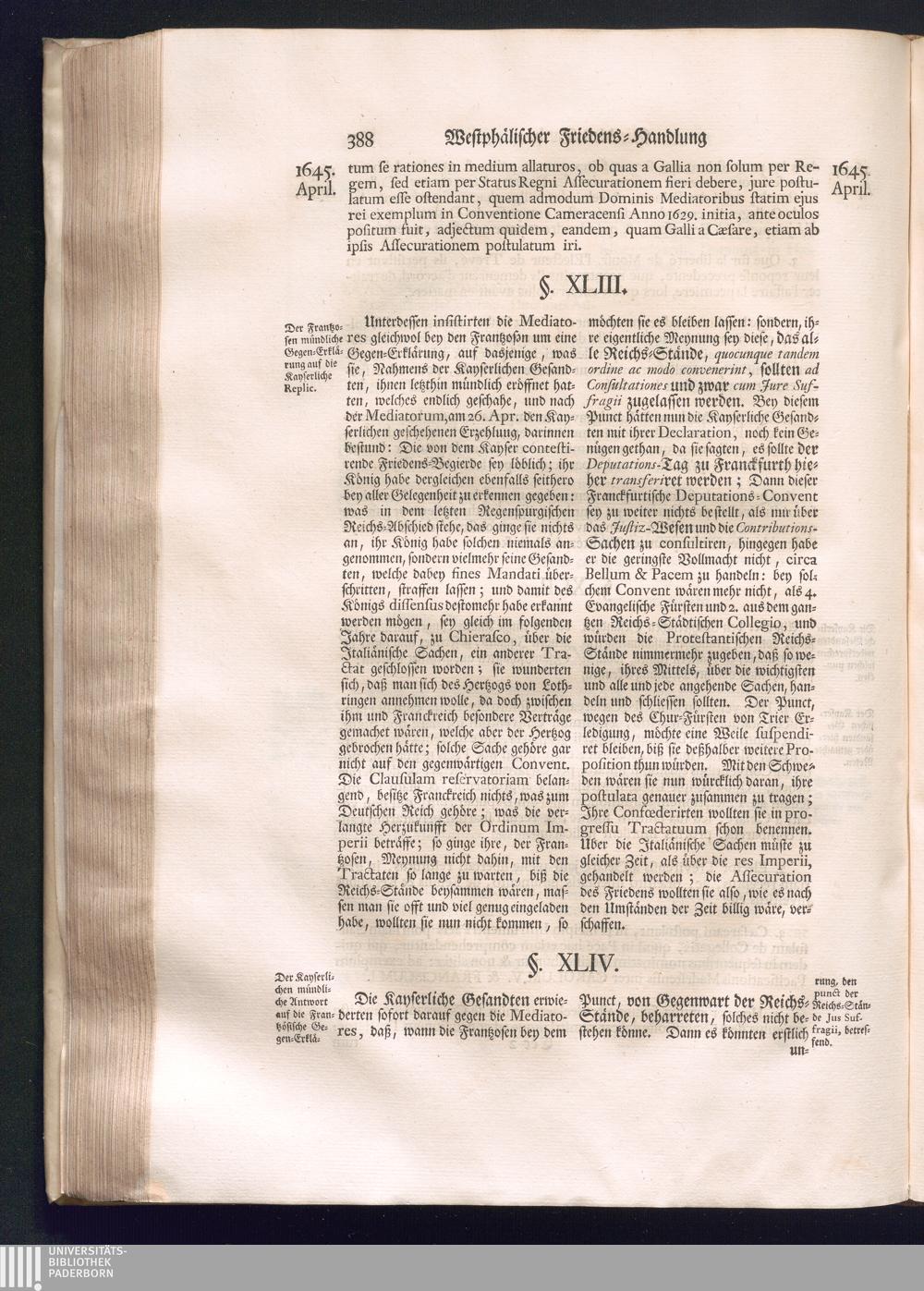 Erster Theil (1734) Worinnen enthalten, was vom Jahr 1643. biß in den Monath October Anno 1645. zwischen Jhro Römisch-Käyserlichen Majestät, dann den Beyden Cronen Franckreich und Schweden, ingleichen des Heiligen Römischen Reichs Chur-Fürsten, Fürsten und Ständen, zu Oßnabrück und Münster gehandelt worden
