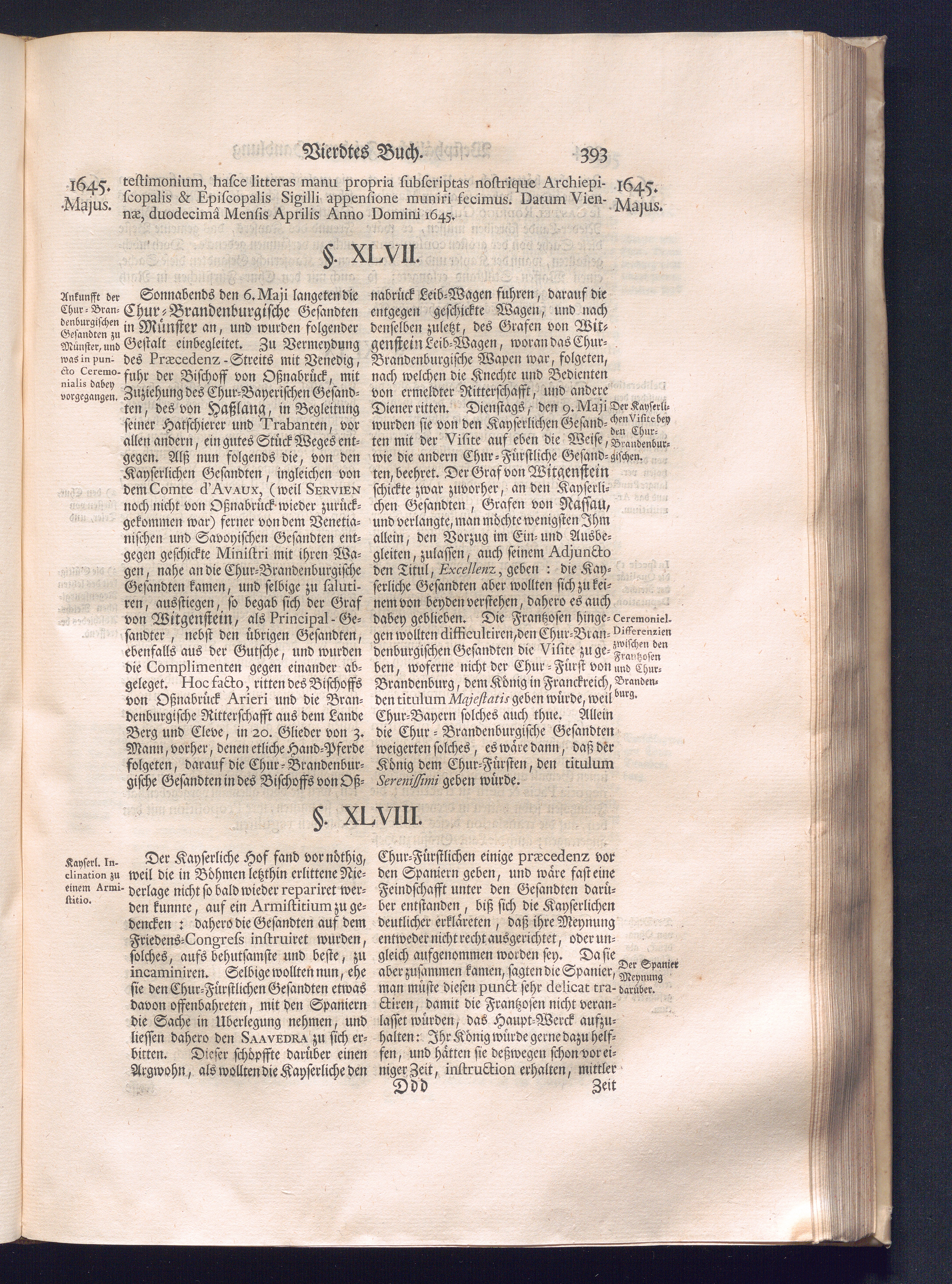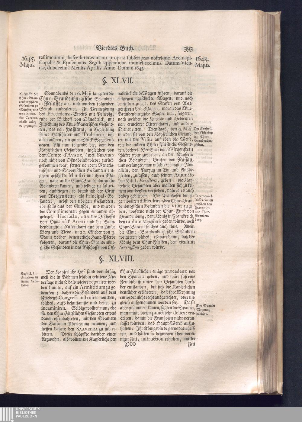 Erster Theil (1734) Worinnen enthalten, was vom Jahr 1643. biß in den Monath October Anno 1645. zwischen Jhro Römisch-Käyserlichen Majestät, dann den Beyden Cronen Franckreich und Schweden, ingleichen des Heiligen Römischen Reichs Chur-Fürsten, Fürsten und Ständen, zu Oßnabrück und Münster gehandelt worden