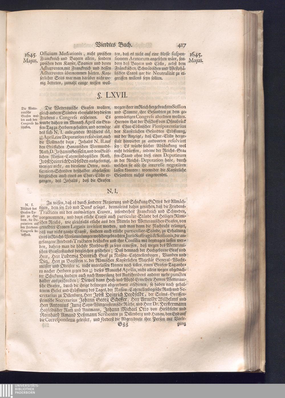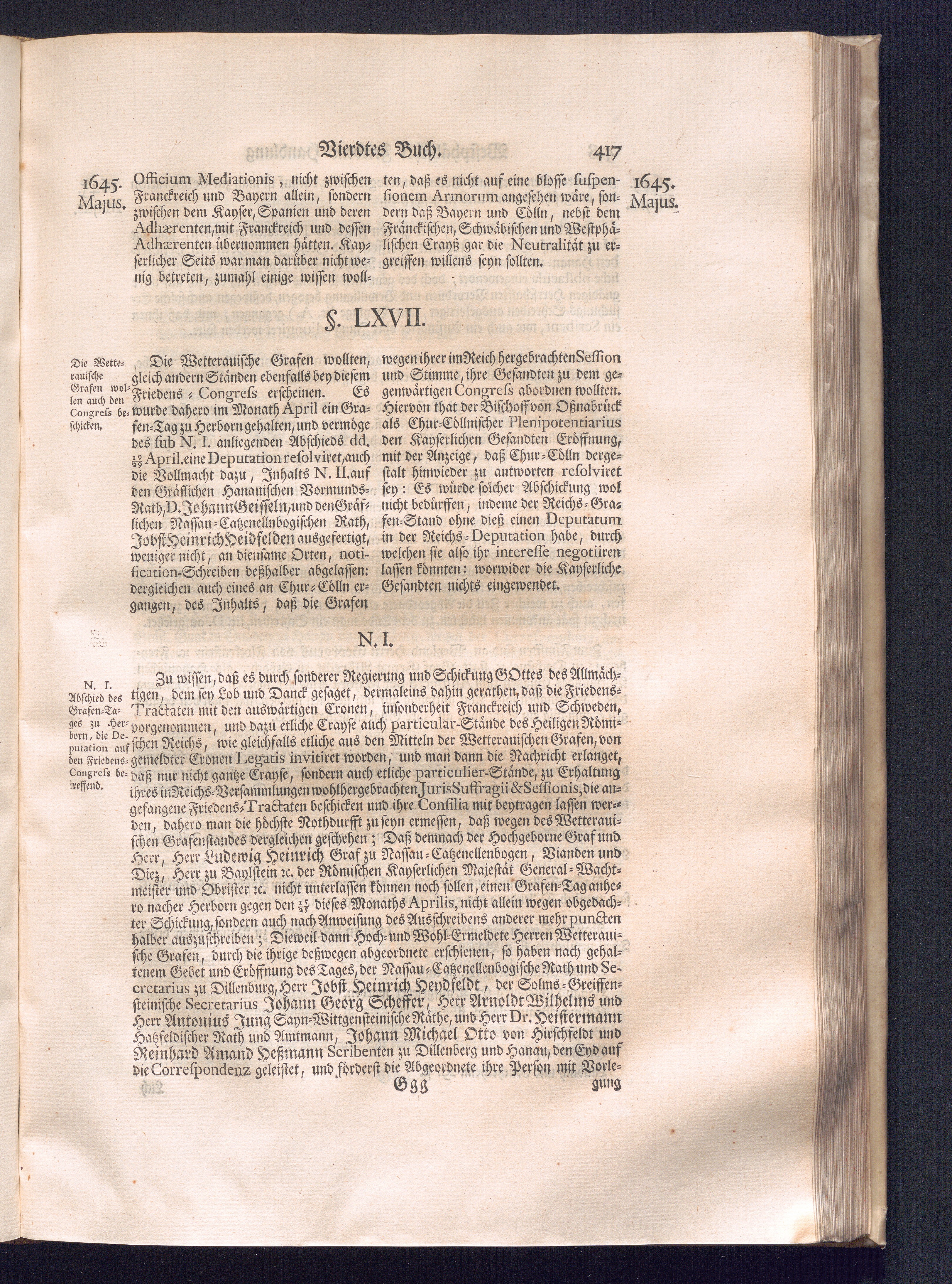 Erster Theil (1734) Worinnen enthalten, was vom Jahr 1643. biß in den Monath October Anno 1645. zwischen Jhro Römisch-Käyserlichen Majestät, dann den Beyden Cronen Franckreich und Schweden, ingleichen des Heiligen Römischen Reichs Chur-Fürsten, Fürsten und Ständen, zu Oßnabrück und Münster gehandelt worden