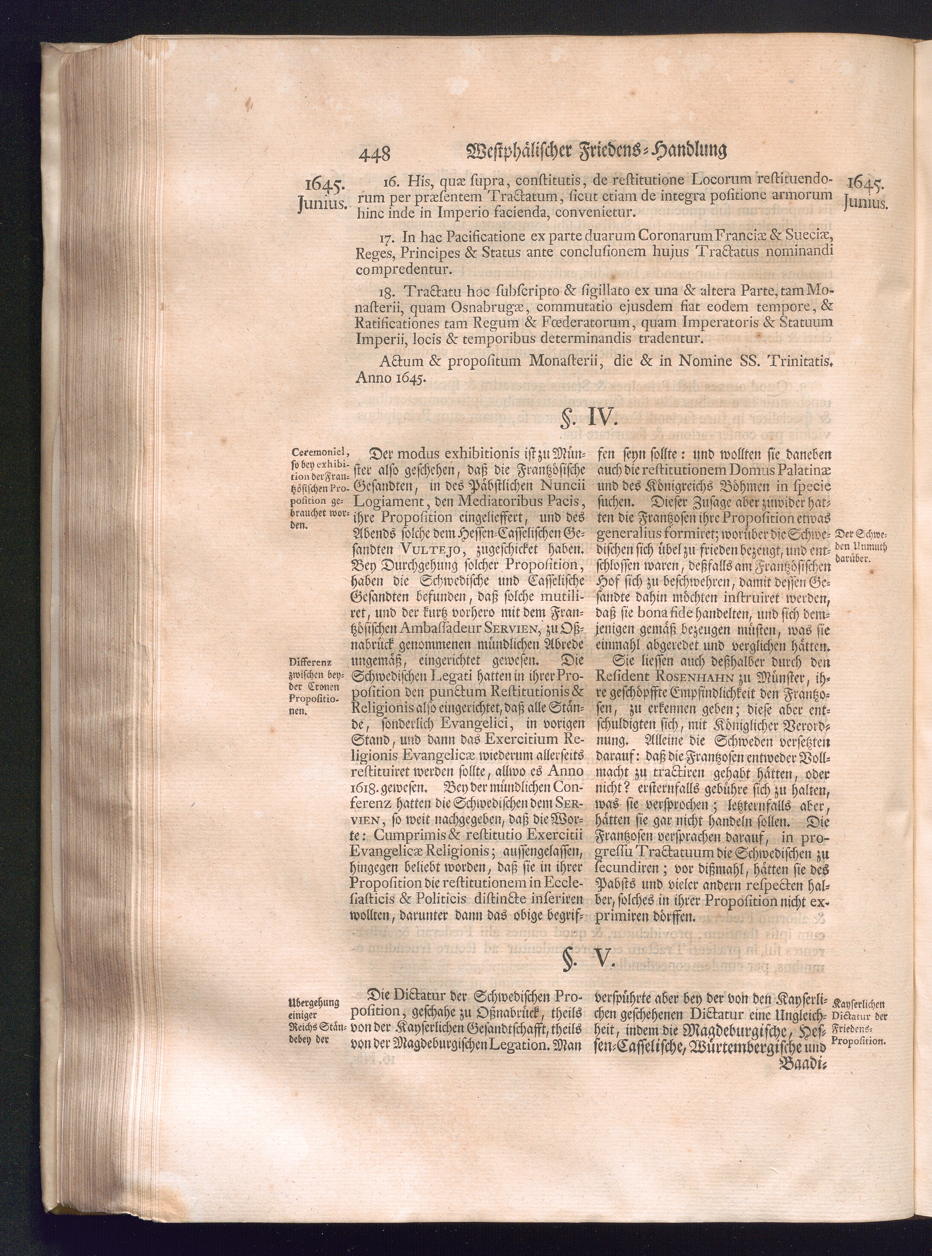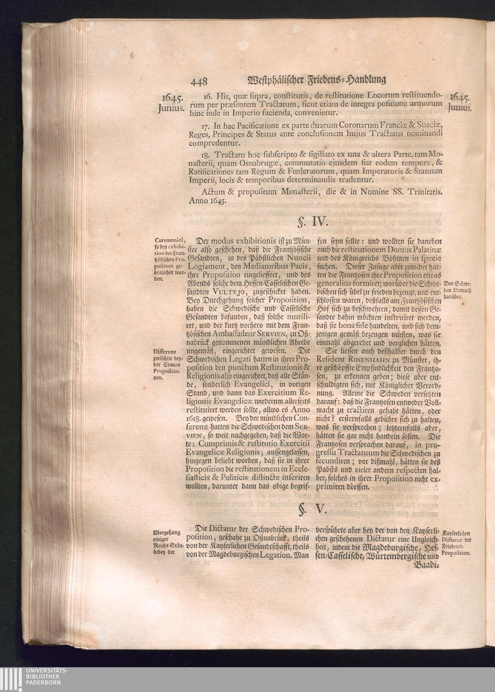 Erster Theil (1734) Worinnen enthalten, was vom Jahr 1643. biß in den Monath October Anno 1645. zwischen Jhro Römisch-Käyserlichen Majestät, dann den Beyden Cronen Franckreich und Schweden, ingleichen des Heiligen Römischen Reichs Chur-Fürsten, Fürsten und Ständen, zu Oßnabrück und Münster gehandelt worden