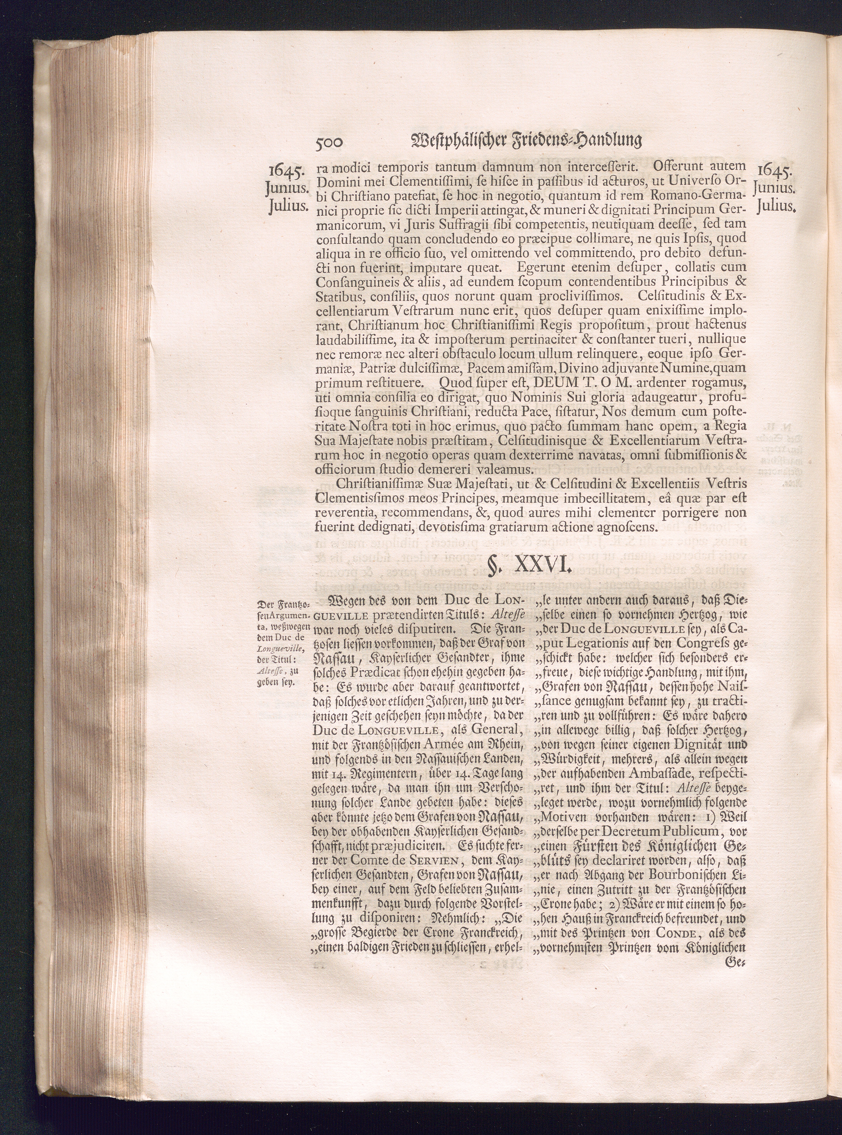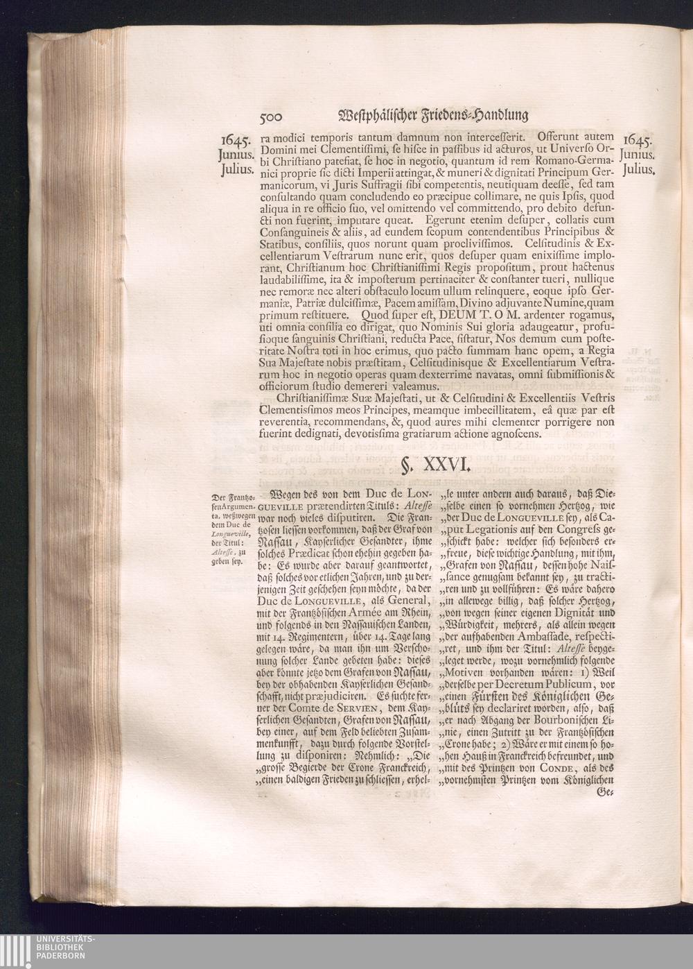 Erster Theil (1734) Worinnen enthalten, was vom Jahr 1643. biß in den Monath October Anno 1645. zwischen Jhro Römisch-Käyserlichen Majestät, dann den Beyden Cronen Franckreich und Schweden, ingleichen des Heiligen Römischen Reichs Chur-Fürsten, Fürsten und Ständen, zu Oßnabrück und Münster gehandelt worden
