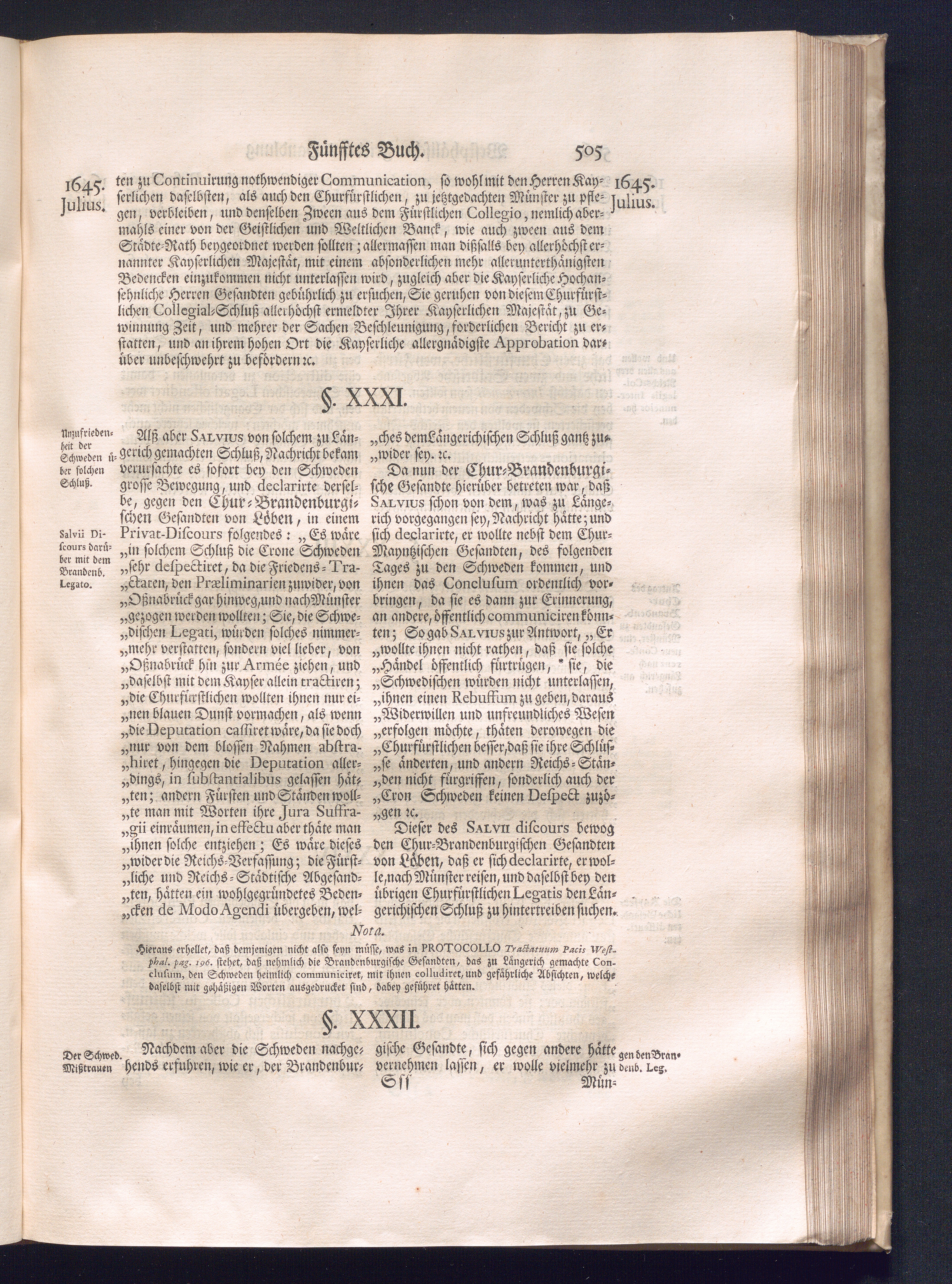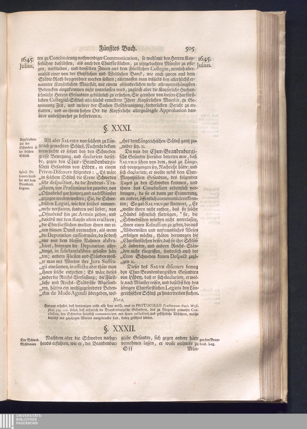 Erster Theil (1734) Worinnen enthalten, was vom Jahr 1643. biß in den Monath October Anno 1645. zwischen Jhro Römisch-Käyserlichen Majestät, dann den Beyden Cronen Franckreich und Schweden, ingleichen des Heiligen Römischen Reichs Chur-Fürsten, Fürsten und Ständen, zu Oßnabrück und Münster gehandelt worden