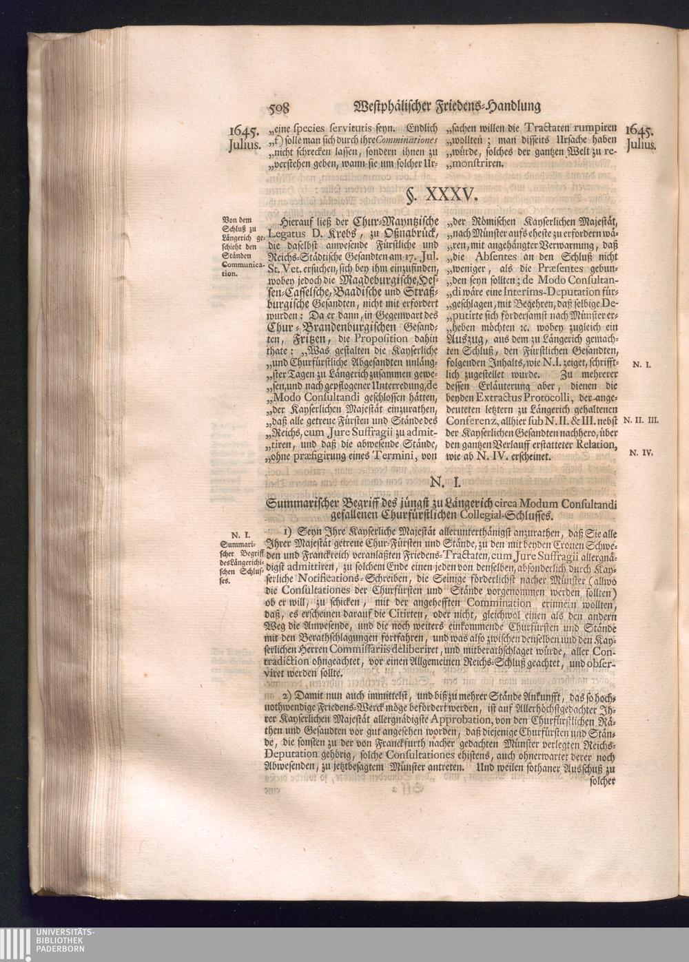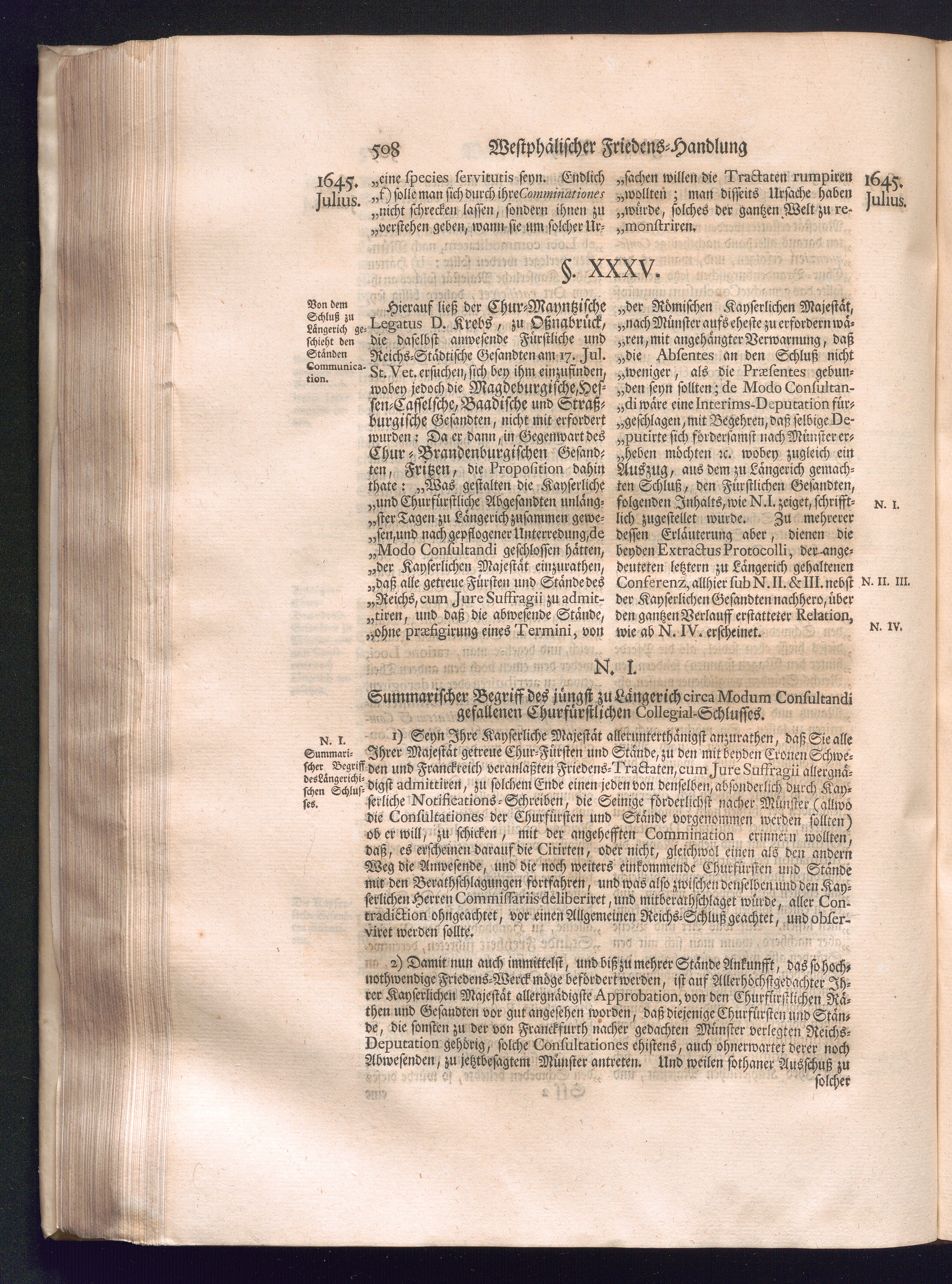 Erster Theil (1734) Worinnen enthalten, was vom Jahr 1643. biß in den Monath October Anno 1645. zwischen Jhro Römisch-Käyserlichen Majestät, dann den Beyden Cronen Franckreich und Schweden, ingleichen des Heiligen Römischen Reichs Chur-Fürsten, Fürsten und Ständen, zu Oßnabrück und Münster gehandelt worden