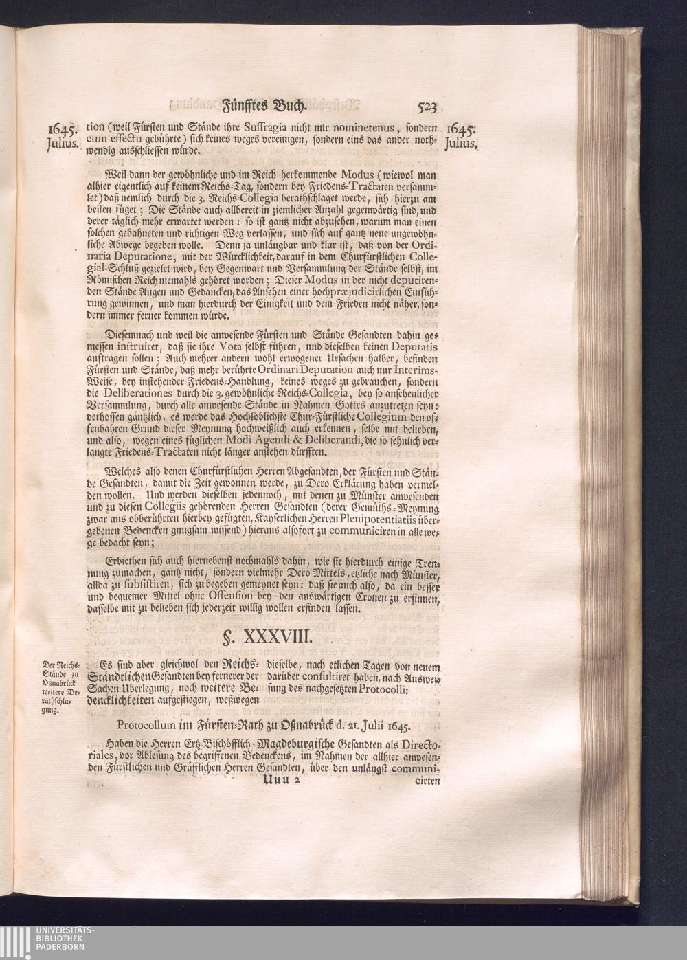 Erster Theil (1734) Worinnen enthalten, was vom Jahr 1643. biß in den Monath October Anno 1645. zwischen Jhro Römisch-Käyserlichen Majestät, dann den Beyden Cronen Franckreich und Schweden, ingleichen des Heiligen Römischen Reichs Chur-Fürsten, Fürsten und Ständen, zu Oßnabrück und Münster gehandelt worden