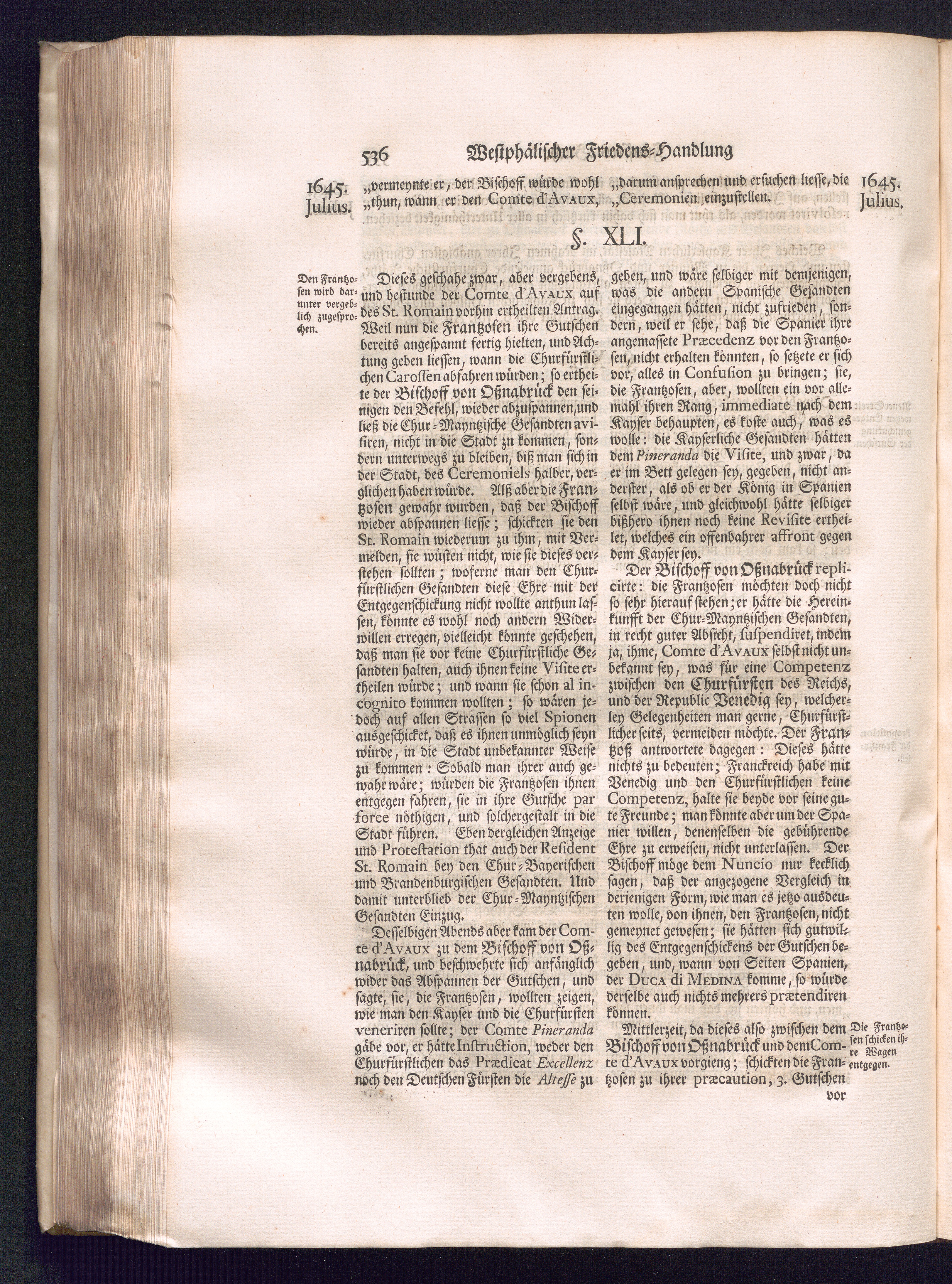 Erster Theil (1734) Worinnen enthalten, was vom Jahr 1643. biß in den Monath October Anno 1645. zwischen Jhro Römisch-Käyserlichen Majestät, dann den Beyden Cronen Franckreich und Schweden, ingleichen des Heiligen Römischen Reichs Chur-Fürsten, Fürsten und Ständen, zu Oßnabrück und Münster gehandelt worden