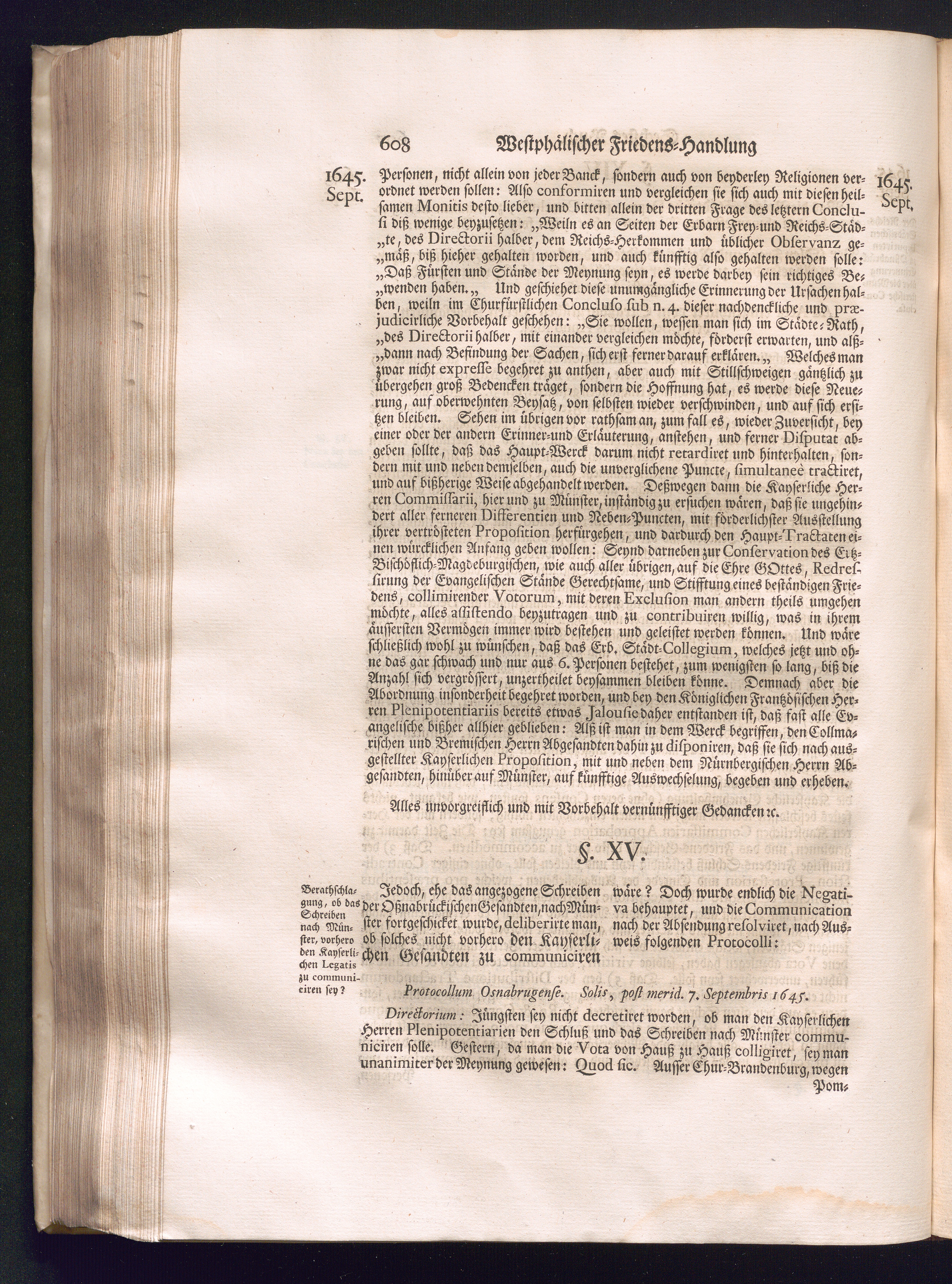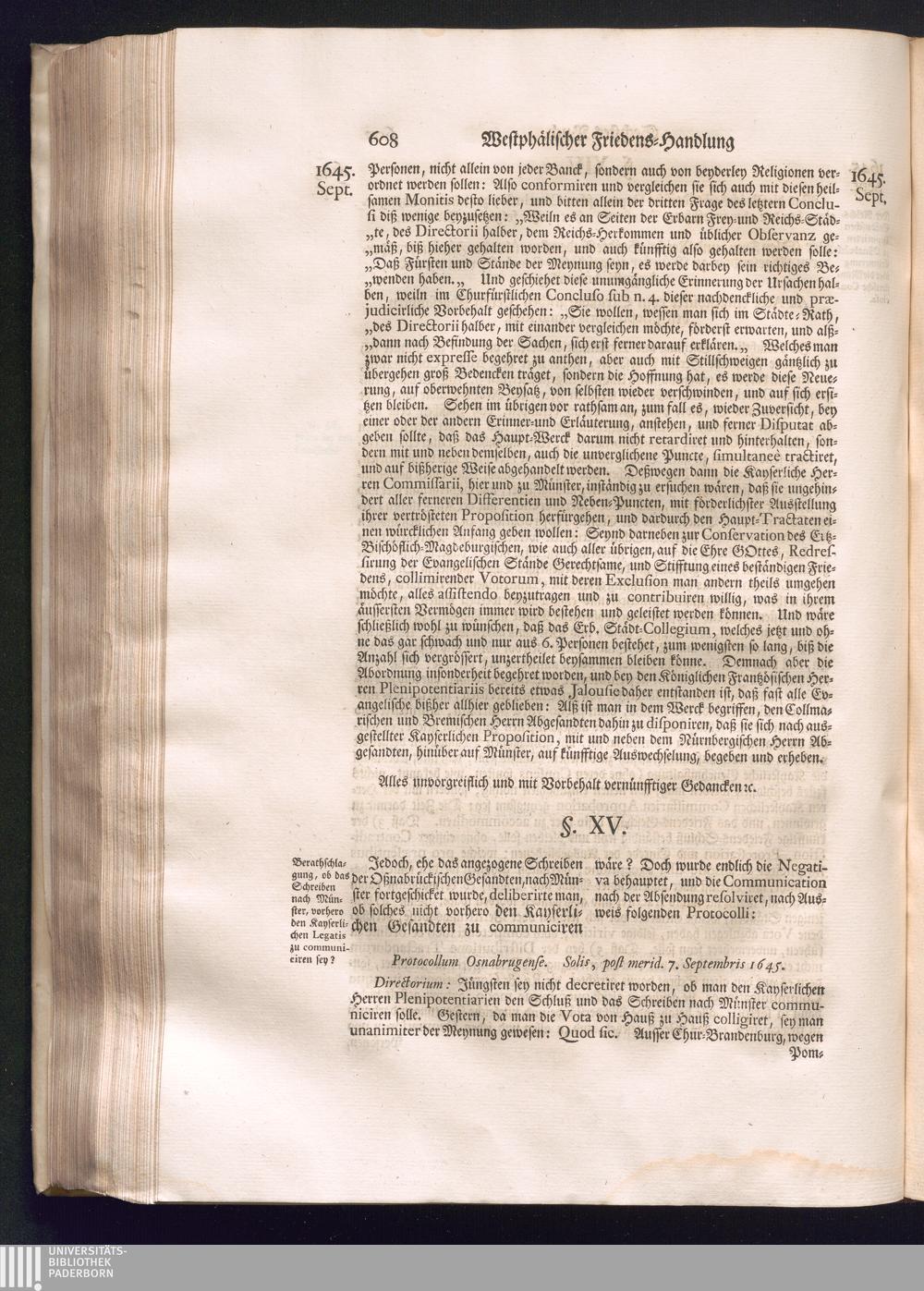 Erster Theil (1734) Worinnen enthalten, was vom Jahr 1643. biß in den Monath October Anno 1645. zwischen Jhro Römisch-Käyserlichen Majestät, dann den Beyden Cronen Franckreich und Schweden, ingleichen des Heiligen Römischen Reichs Chur-Fürsten, Fürsten und Ständen, zu Oßnabrück und Münster gehandelt worden
