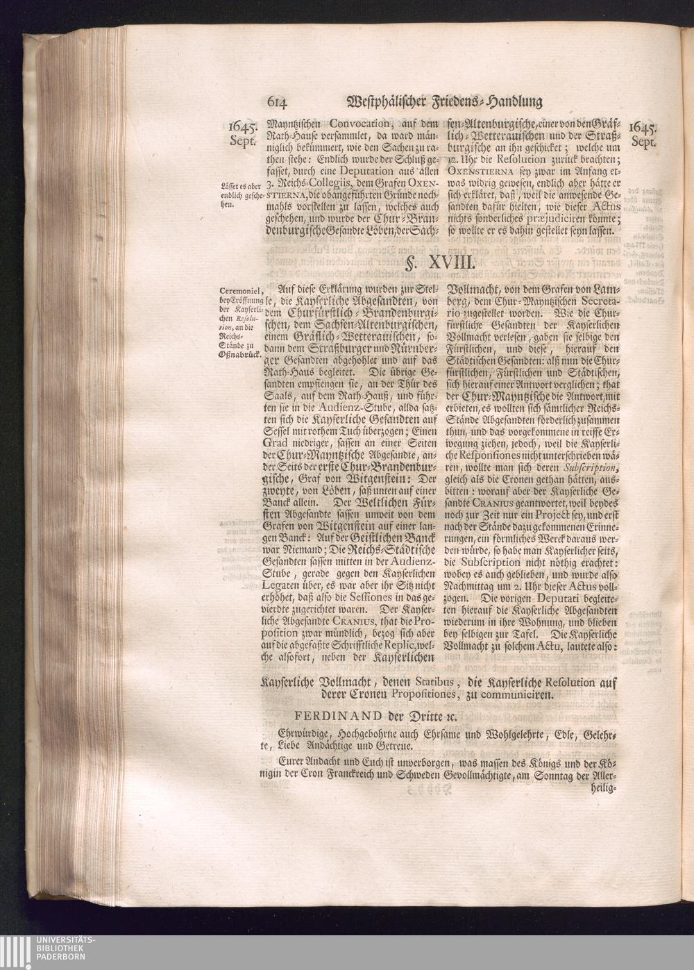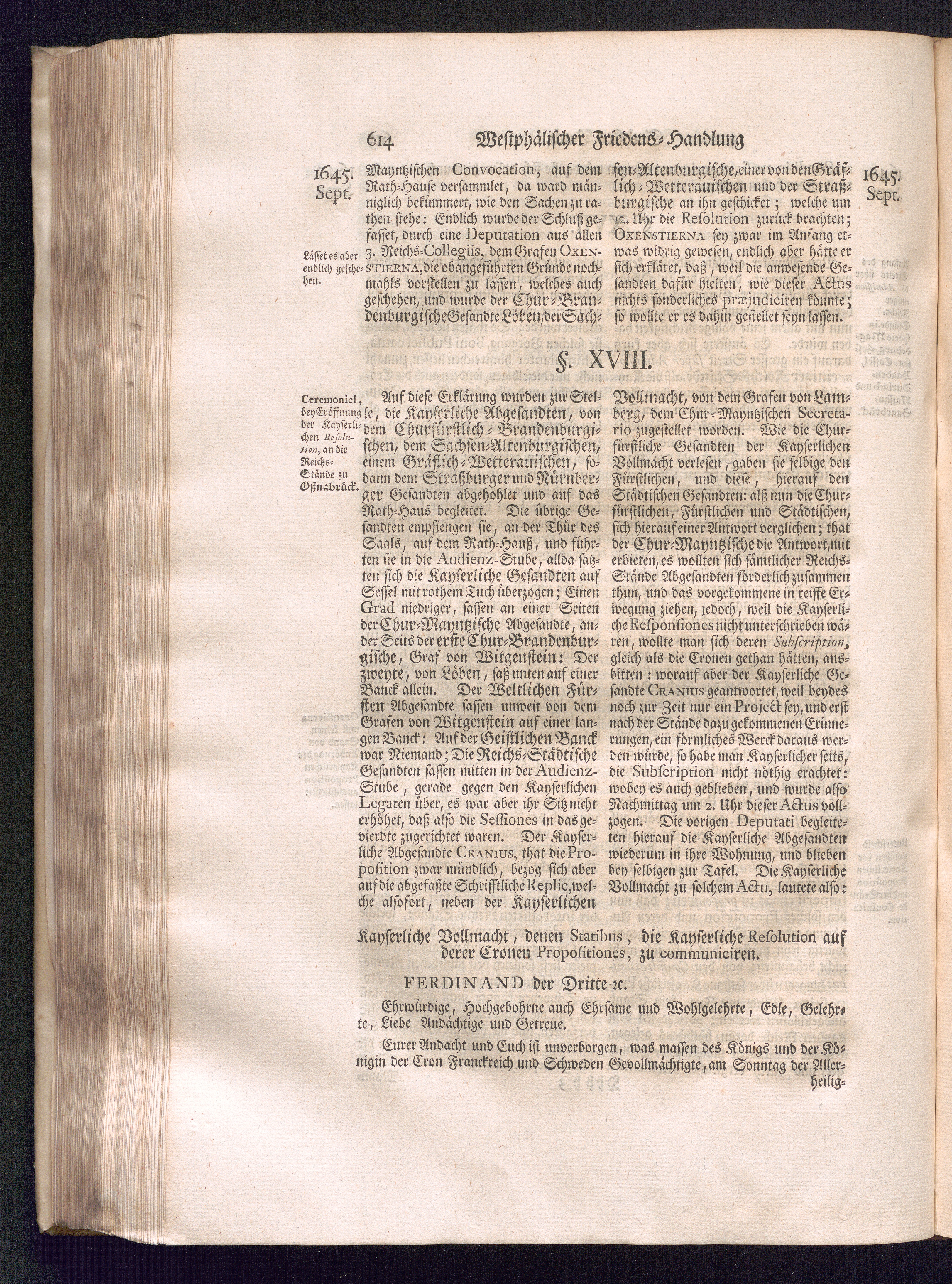 Erster Theil (1734) Worinnen enthalten, was vom Jahr 1643. biß in den Monath October Anno 1645. zwischen Jhro Römisch-Käyserlichen Majestät, dann den Beyden Cronen Franckreich und Schweden, ingleichen des Heiligen Römischen Reichs Chur-Fürsten, Fürsten und Ständen, zu Oßnabrück und Münster gehandelt worden