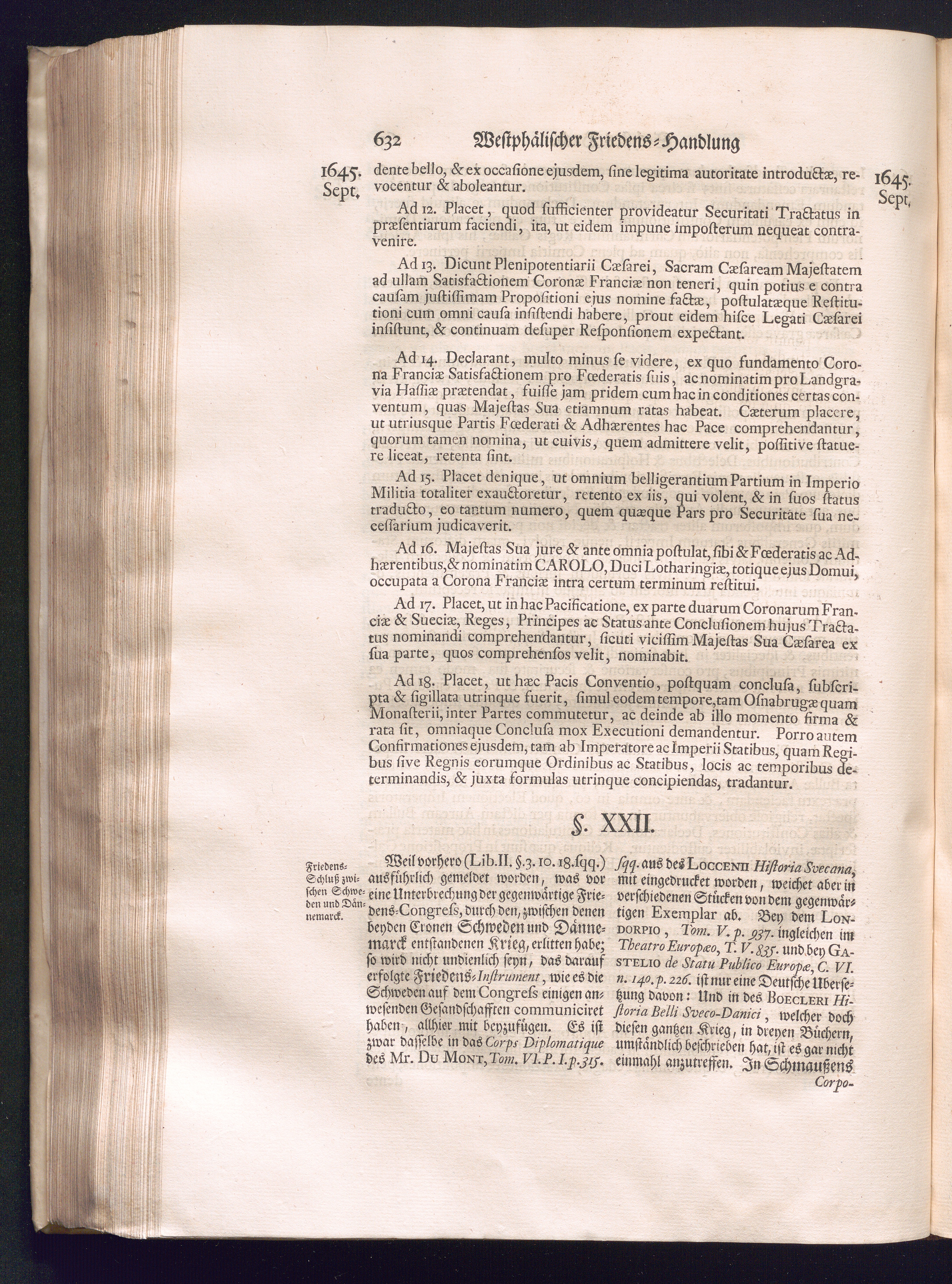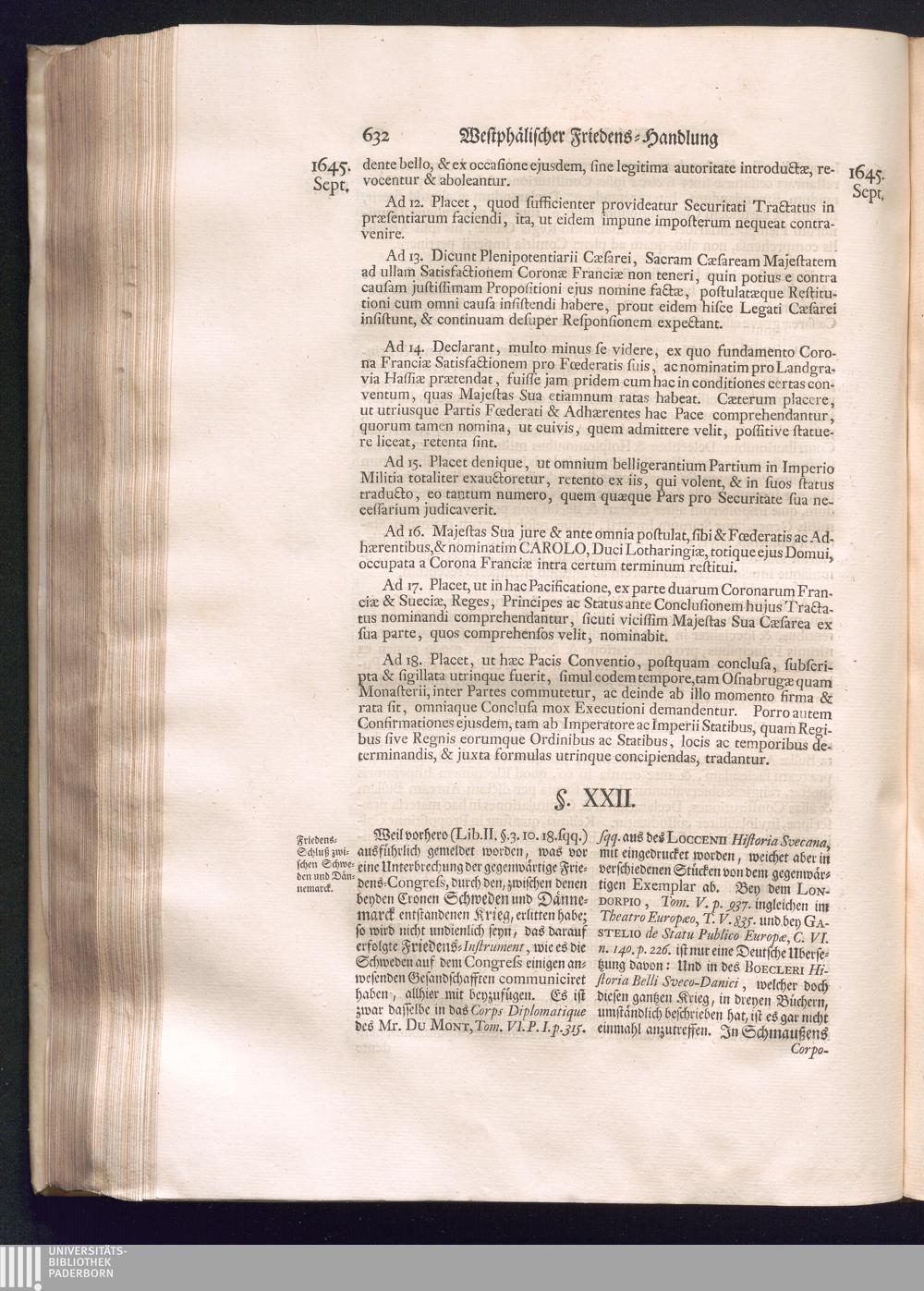 Erster Theil (1734) Worinnen enthalten, was vom Jahr 1643. biß in den Monath October Anno 1645. zwischen Jhro Römisch-Käyserlichen Majestät, dann den Beyden Cronen Franckreich und Schweden, ingleichen des Heiligen Römischen Reichs Chur-Fürsten, Fürsten und Ständen, zu Oßnabrück und Münster gehandelt worden