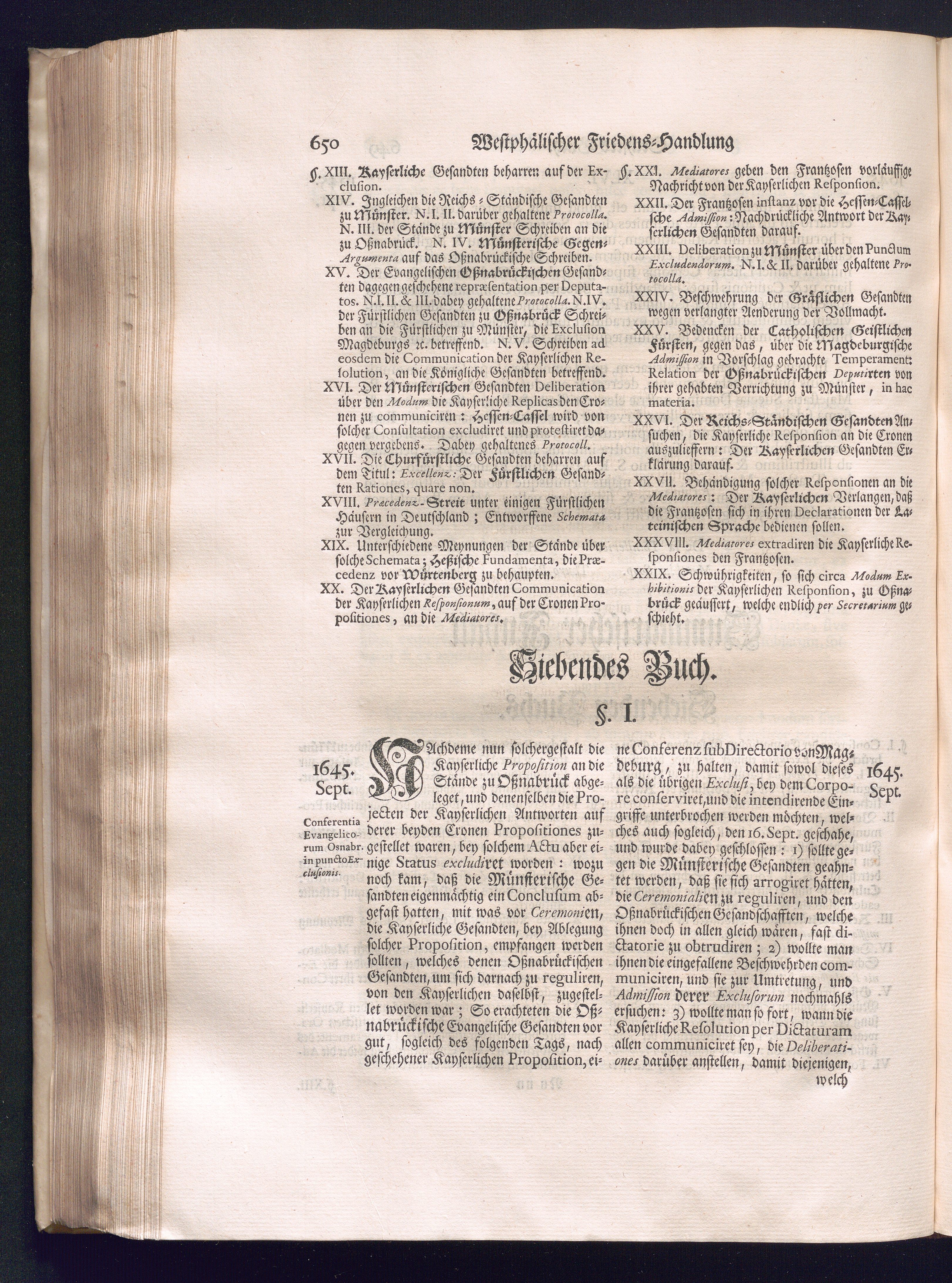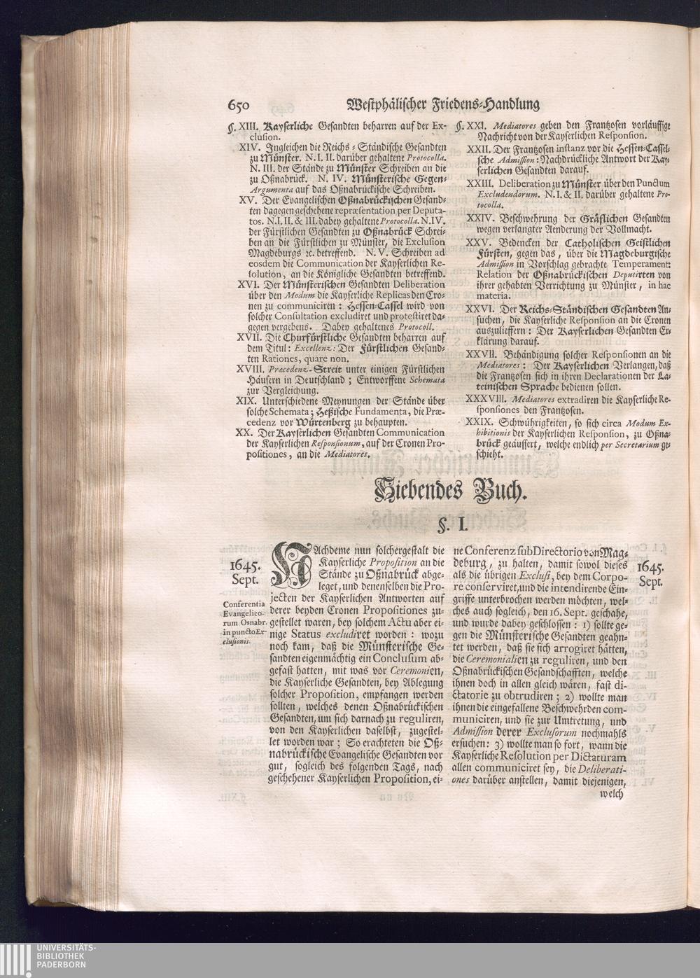 Erster Theil (1734) Worinnen enthalten, was vom Jahr 1643. biß in den Monath October Anno 1645. zwischen Jhro Römisch-Käyserlichen Majestät, dann den Beyden Cronen Franckreich und Schweden, ingleichen des Heiligen Römischen Reichs Chur-Fürsten, Fürsten und Ständen, zu Oßnabrück und Münster gehandelt worden