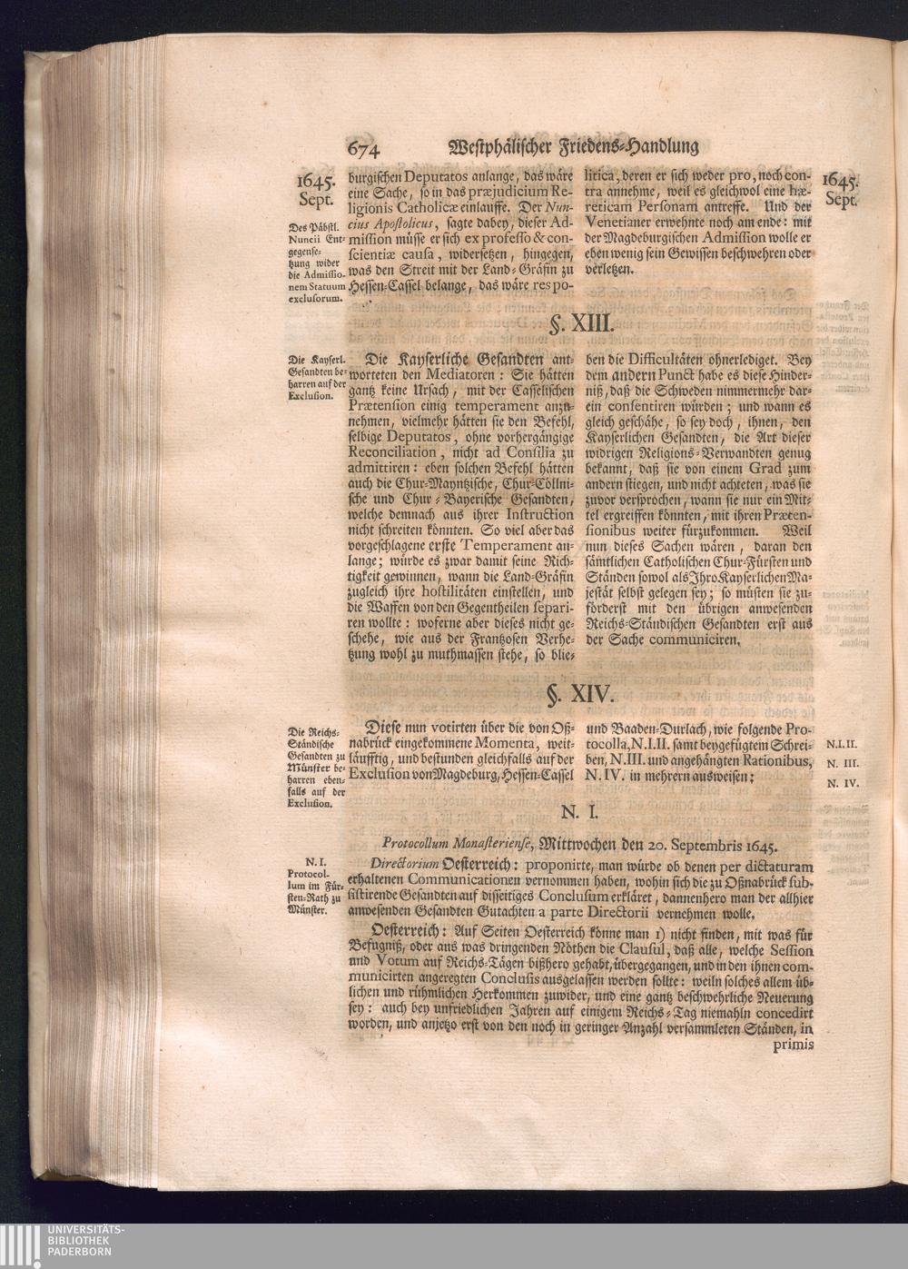 Erster Theil (1734) Worinnen enthalten, was vom Jahr 1643. biß in den Monath October Anno 1645. zwischen Jhro Römisch-Käyserlichen Majestät, dann den Beyden Cronen Franckreich und Schweden, ingleichen des Heiligen Römischen Reichs Chur-Fürsten, Fürsten und Ständen, zu Oßnabrück und Münster gehandelt worden