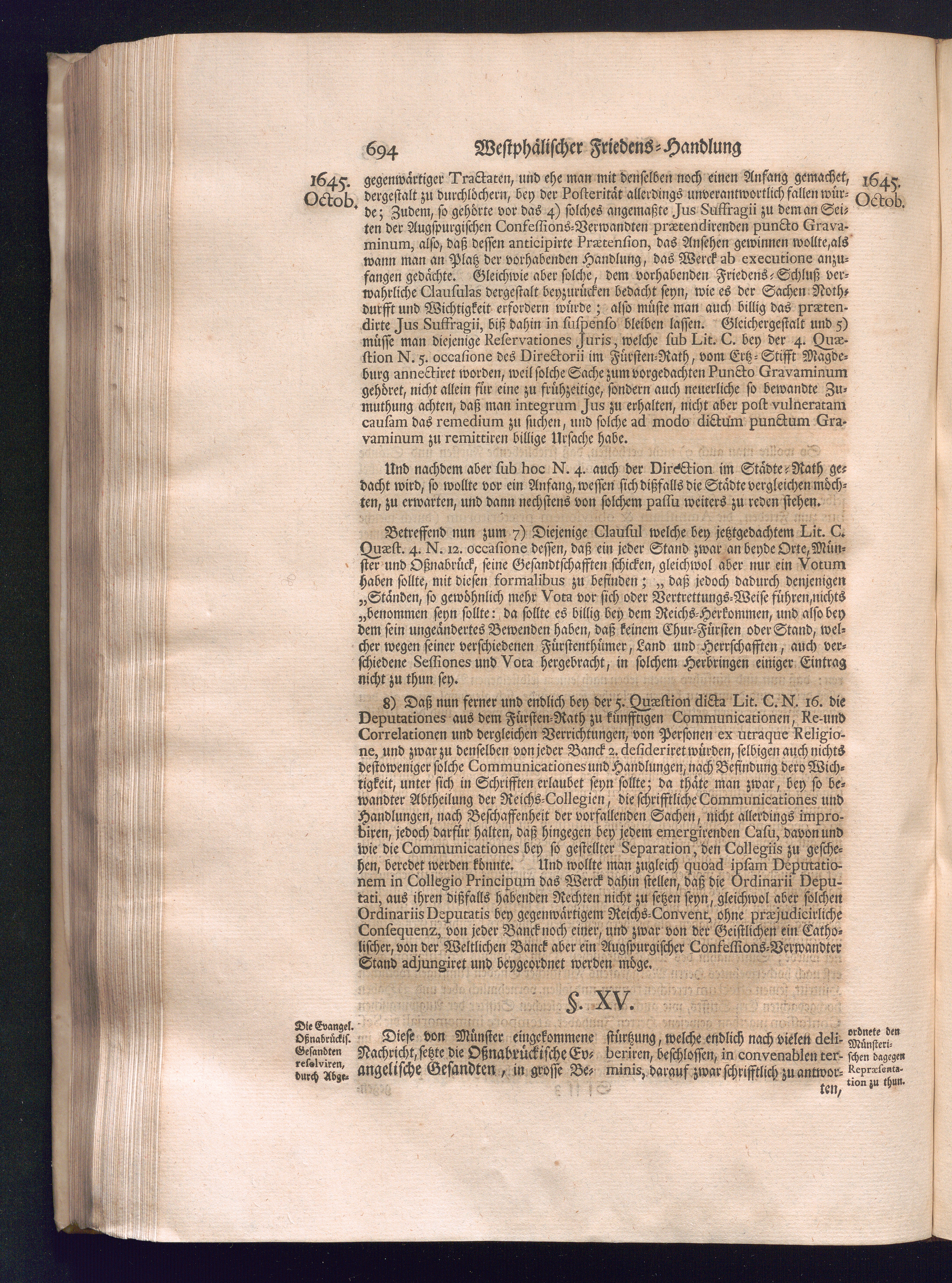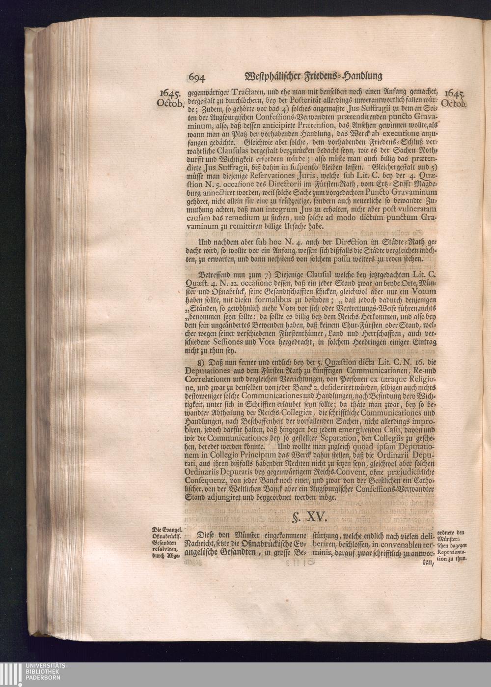 Erster Theil (1734) Worinnen enthalten, was vom Jahr 1643. biß in den Monath October Anno 1645. zwischen Jhro Römisch-Käyserlichen Majestät, dann den Beyden Cronen Franckreich und Schweden, ingleichen des Heiligen Römischen Reichs Chur-Fürsten, Fürsten und Ständen, zu Oßnabrück und Münster gehandelt worden