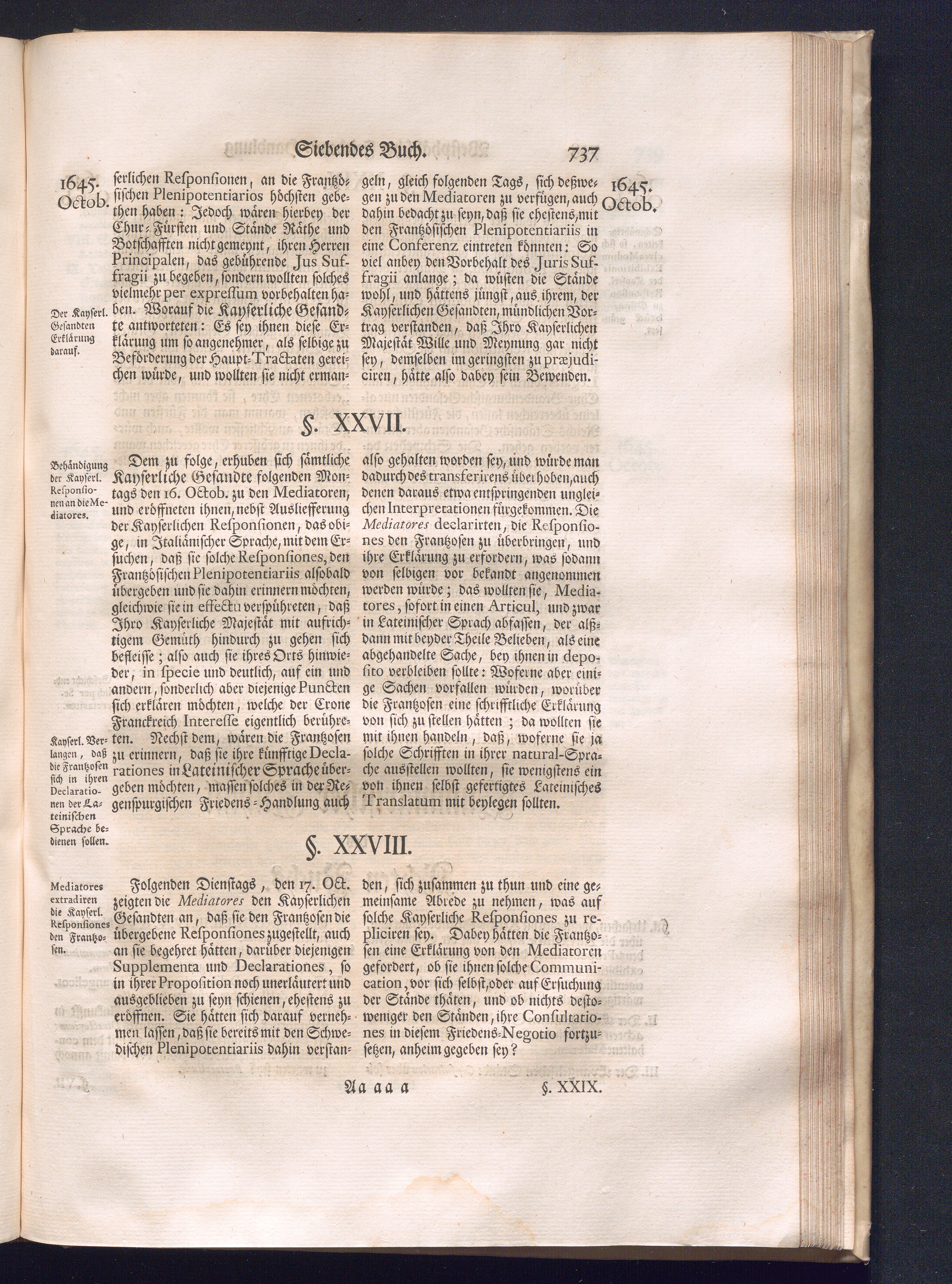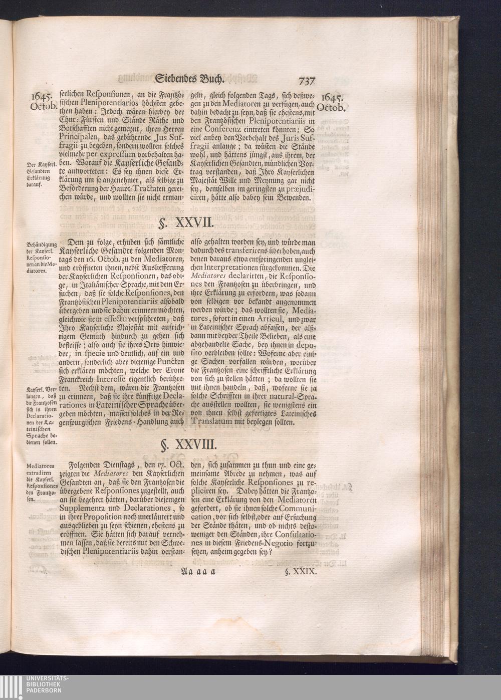 Erster Theil (1734) Worinnen enthalten, was vom Jahr 1643. biß in den Monath October Anno 1645. zwischen Jhro Römisch-Käyserlichen Majestät, dann den Beyden Cronen Franckreich und Schweden, ingleichen des Heiligen Römischen Reichs Chur-Fürsten, Fürsten und Ständen, zu Oßnabrück und Münster gehandelt worden