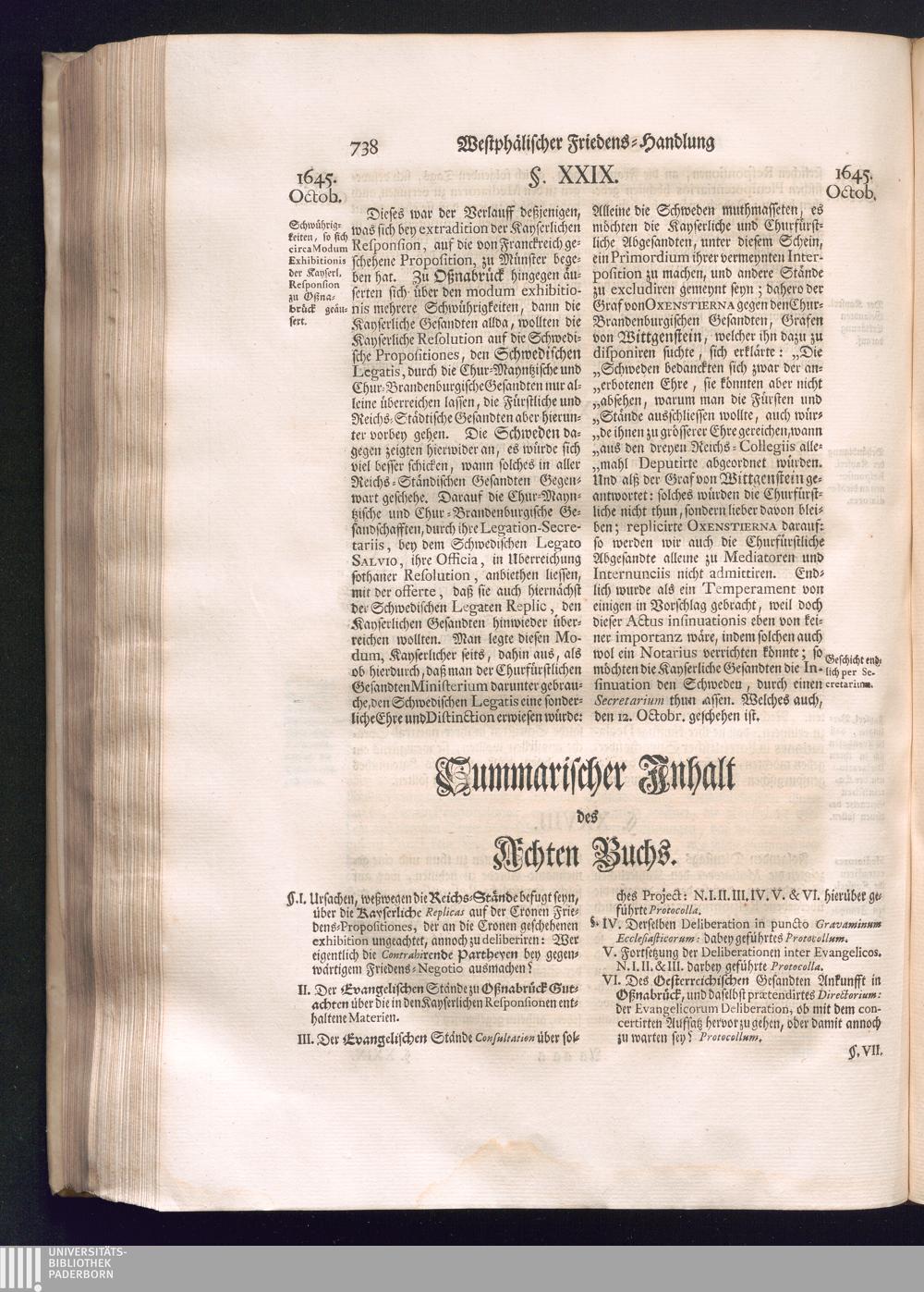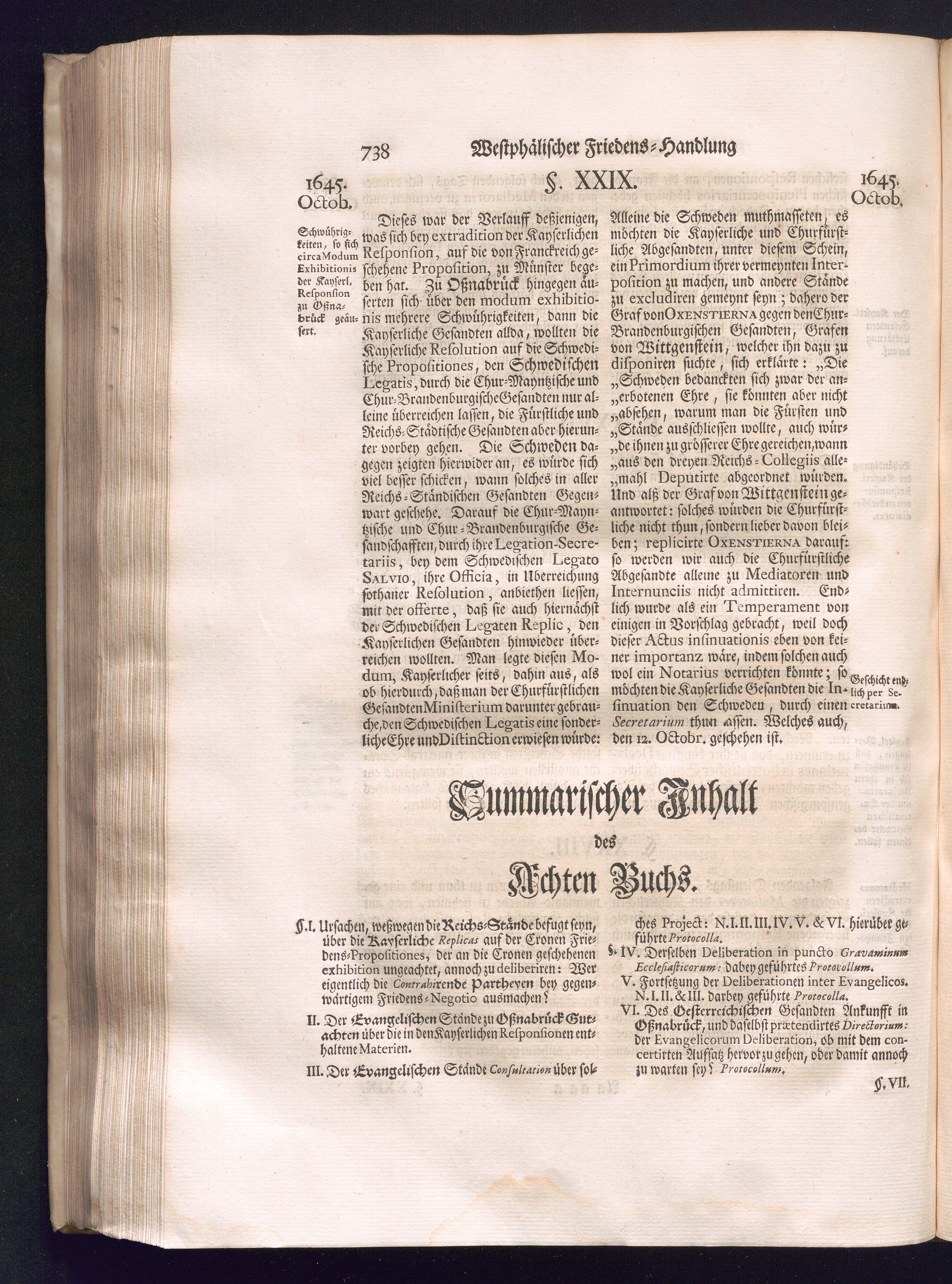 Erster Theil (1734) Worinnen enthalten, was vom Jahr 1643. biß in den Monath October Anno 1645. zwischen Jhro Römisch-Käyserlichen Majestät, dann den Beyden Cronen Franckreich und Schweden, ingleichen des Heiligen Römischen Reichs Chur-Fürsten, Fürsten und Ständen, zu Oßnabrück und Münster gehandelt worden