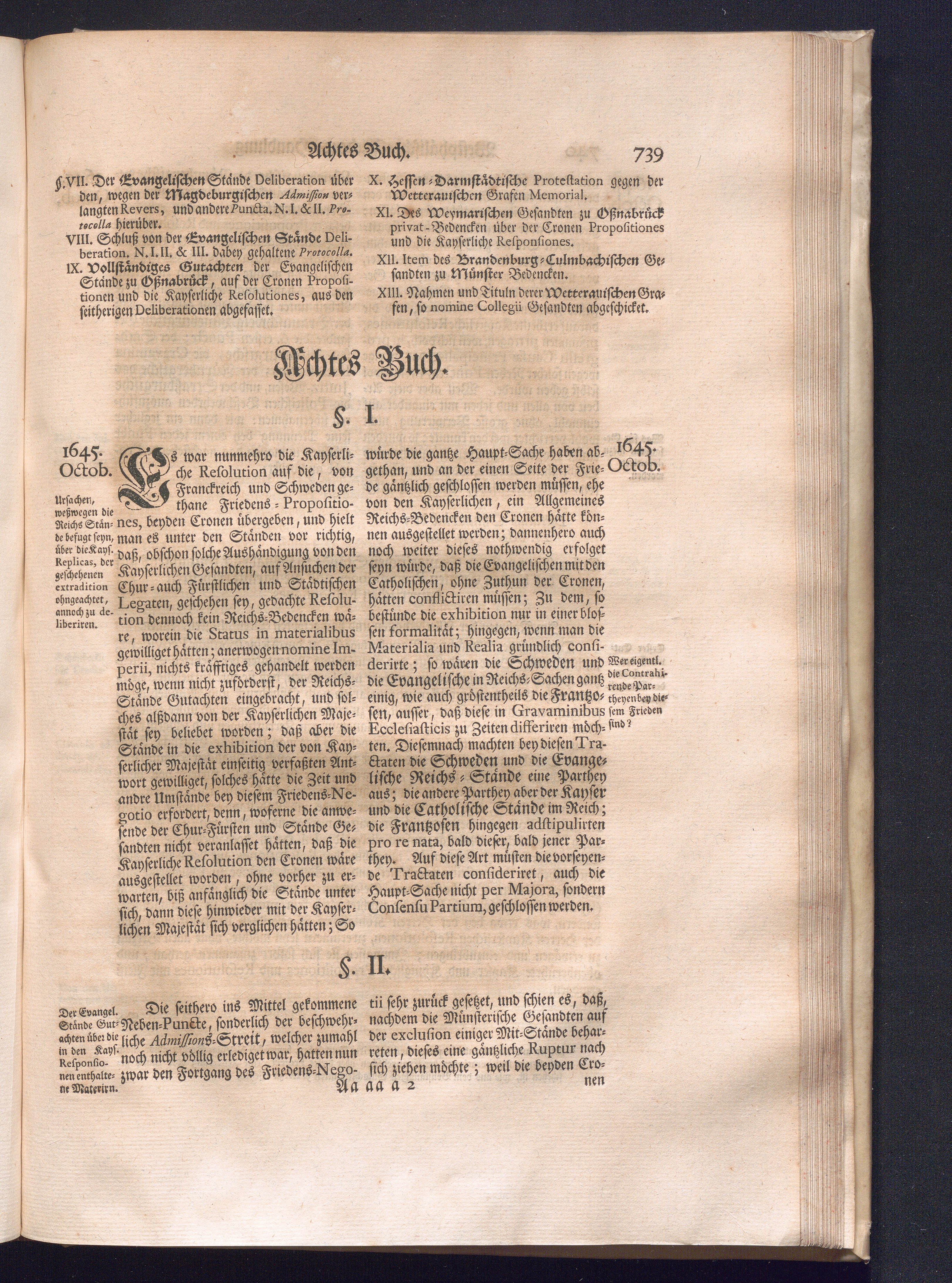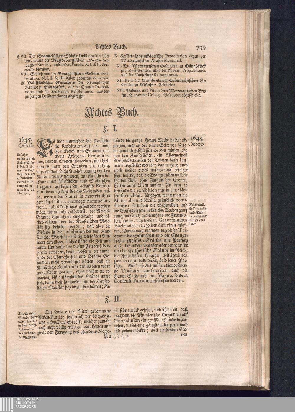 Erster Theil (1734) Worinnen enthalten, was vom Jahr 1643. biß in den Monath October Anno 1645. zwischen Jhro Römisch-Käyserlichen Majestät, dann den Beyden Cronen Franckreich und Schweden, ingleichen des Heiligen Römischen Reichs Chur-Fürsten, Fürsten und Ständen, zu Oßnabrück und Münster gehandelt worden