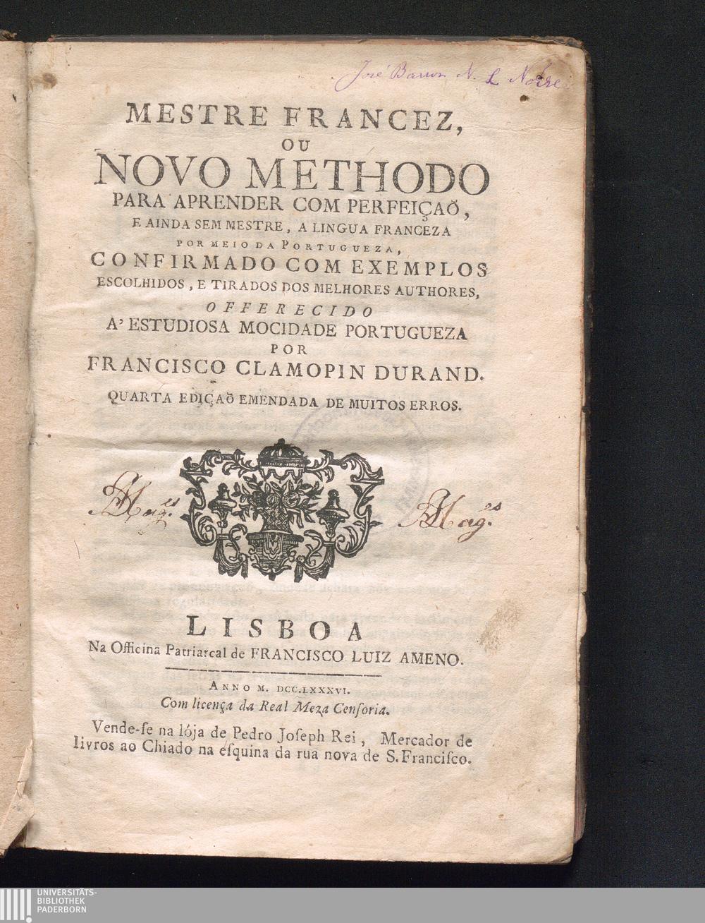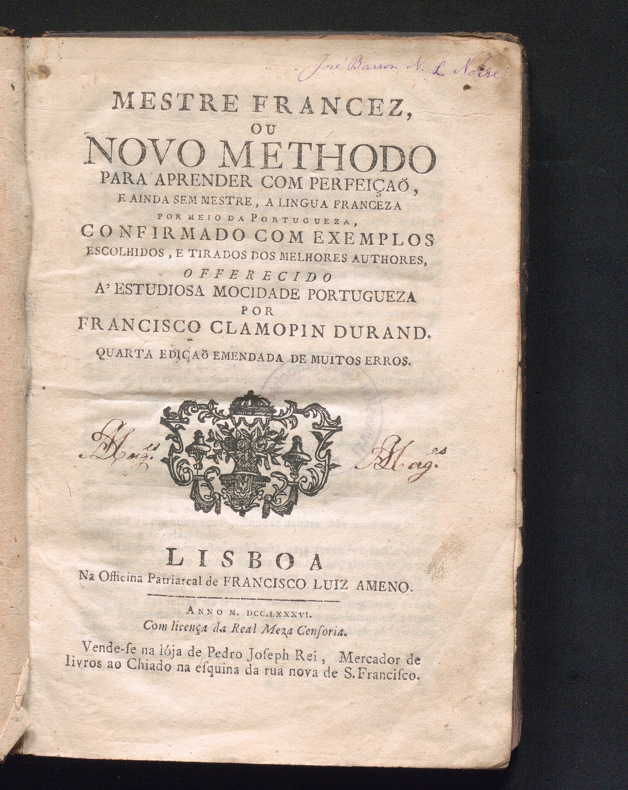 Mestre Francez, Ou Novo Methodo Para Aprender Com Perfeiçaó, E Ainda Sem Mestre, A Lingua Franceza Por Meio Da Portugueza, Confirmado Com Exemplos Escolhidos, E Tirados Dos Melhores Authores / Offerecido A' Estudiosa Mocidade Portugueza Por Francisco Clamopin Durand