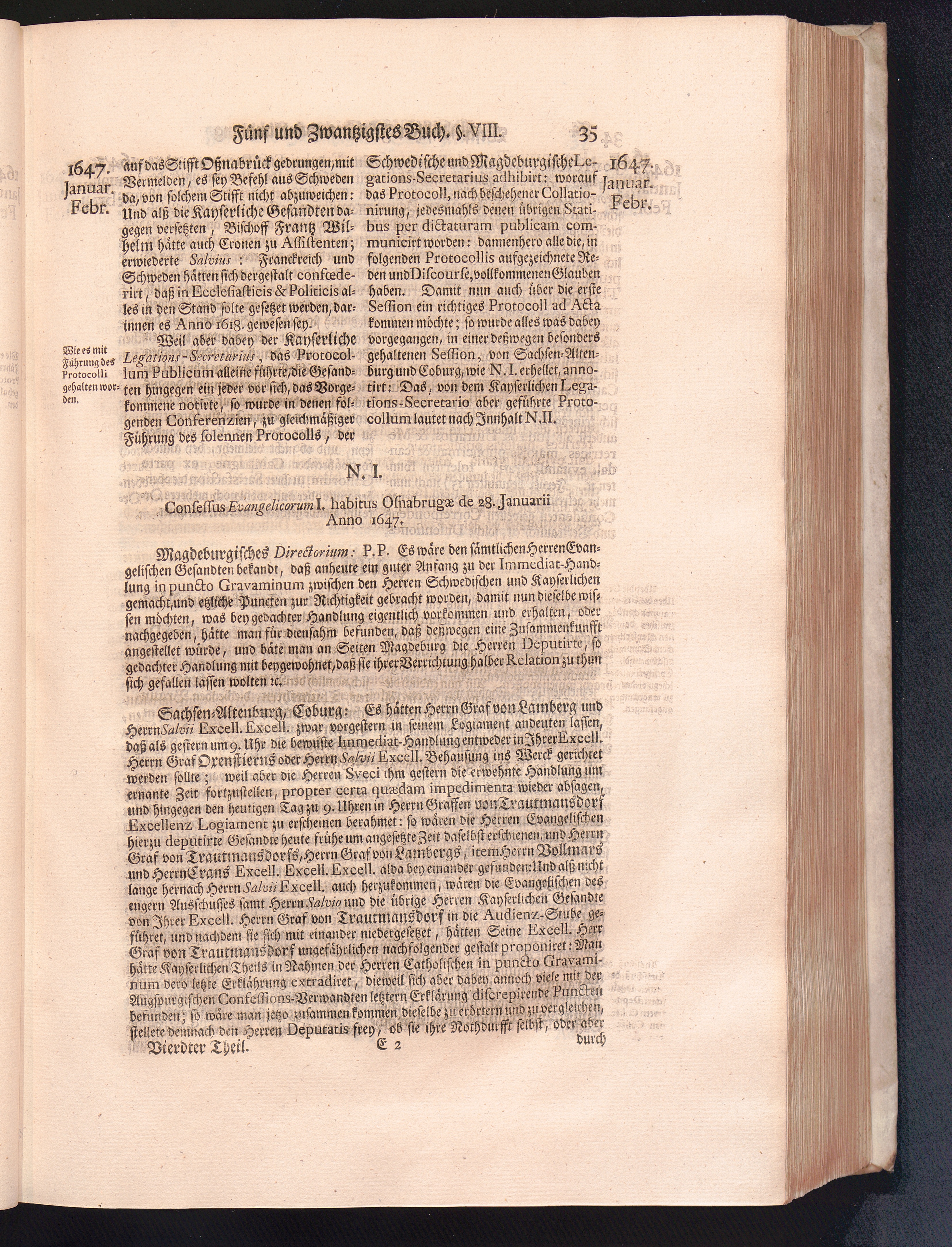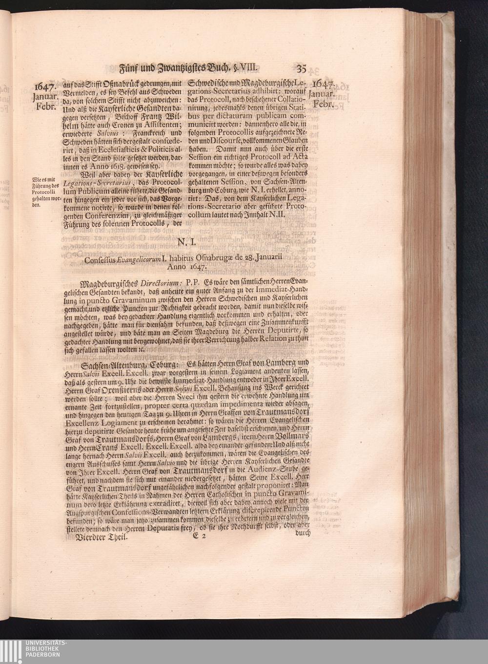 Vierdter Theil (1735) Worinnen enthalten, was vom Anfang des Jahrs 1647. biß gegen Ende desselben zwischen Jhro Römisch-Kayserlichen Majestät, dann den Beyden Cronen Franckreich und Schweden, ingleichen des Heiligen Römischen Reichs Chur-Fürsten, Fürsten und Ständen, zu Oßnabrück und Münster gehandelt worden