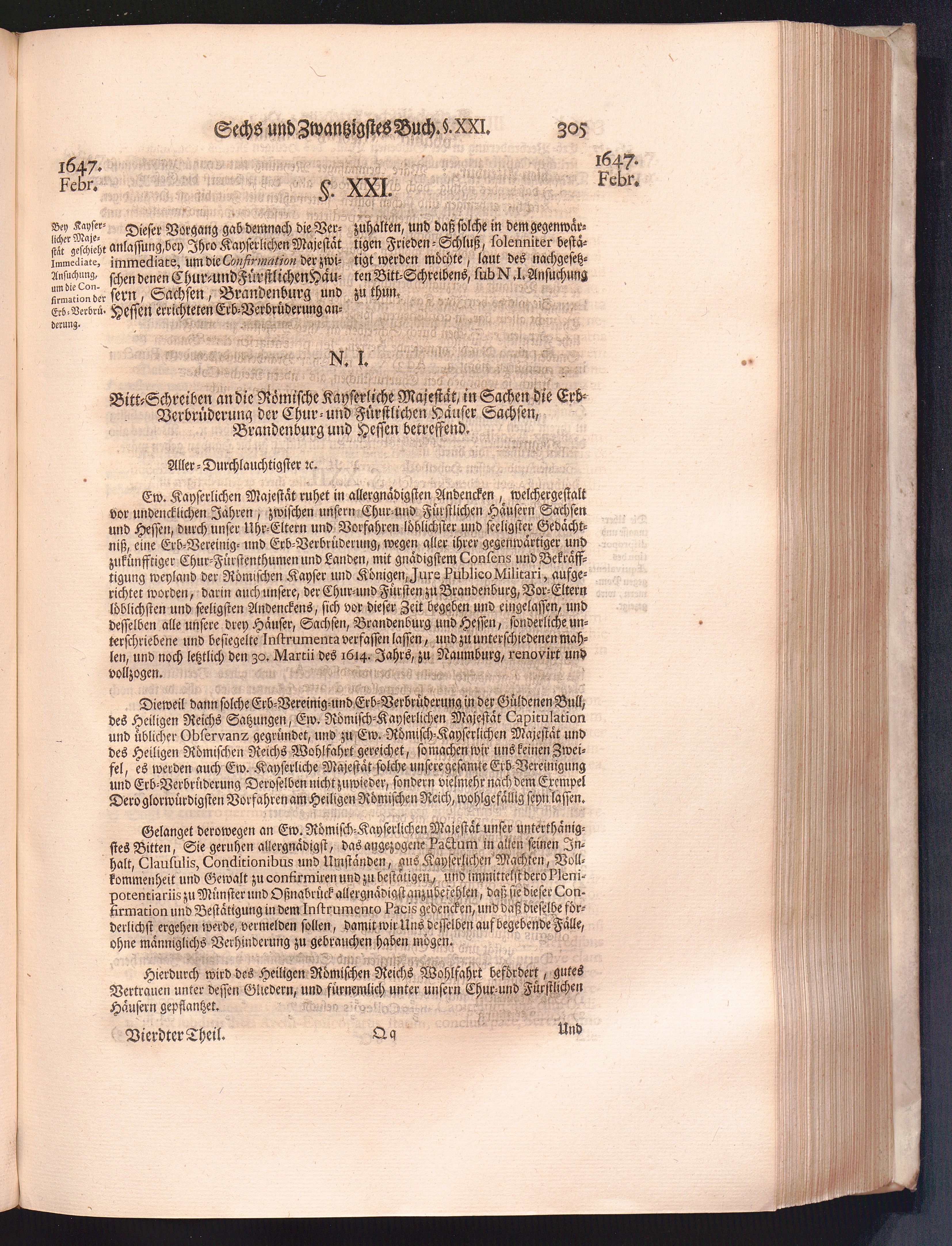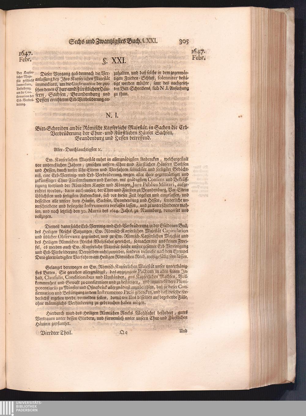 Vierdter Theil (1735) Worinnen enthalten, was vom Anfang des Jahrs 1647. biß gegen Ende desselben zwischen Jhro Römisch-Kayserlichen Majestät, dann den Beyden Cronen Franckreich und Schweden, ingleichen des Heiligen Römischen Reichs Chur-Fürsten, Fürsten und Ständen, zu Oßnabrück und Münster gehandelt worden