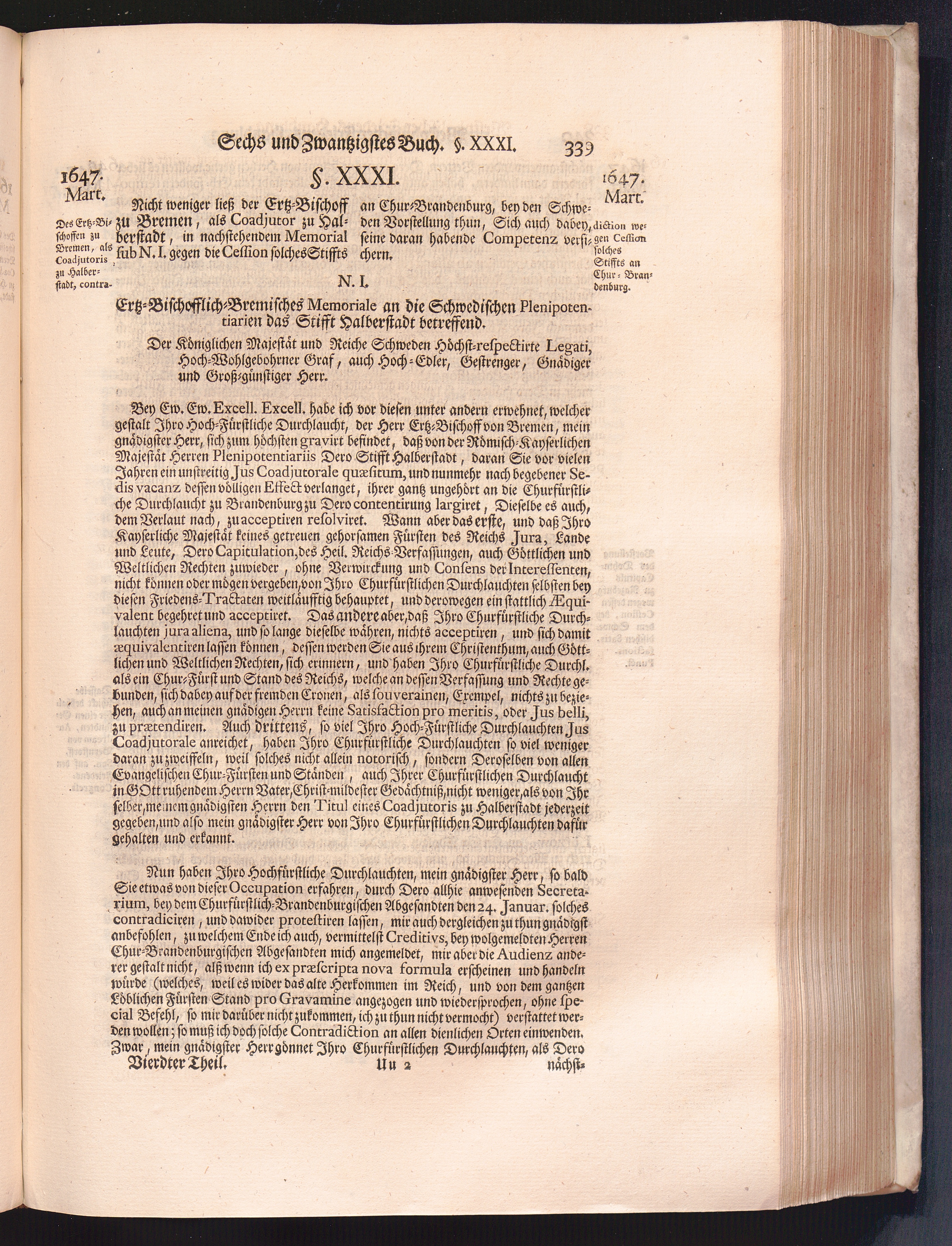 Vierdter Theil (1735) Worinnen enthalten, was vom Anfang des Jahrs 1647. biß gegen Ende desselben zwischen Jhro Römisch-Kayserlichen Majestät, dann den Beyden Cronen Franckreich und Schweden, ingleichen des Heiligen Römischen Reichs Chur-Fürsten, Fürsten und Ständen, zu Oßnabrück und Münster gehandelt worden