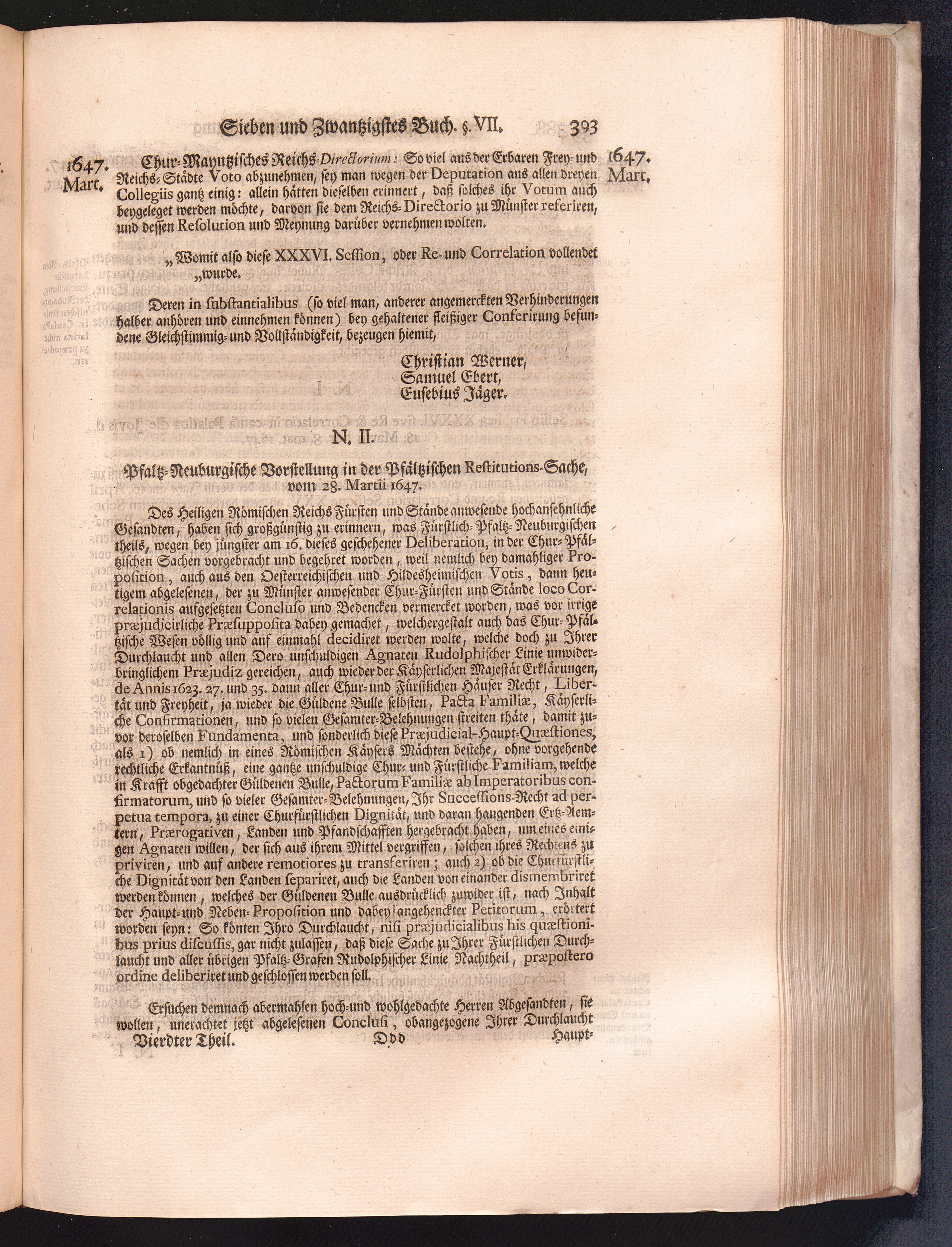 Vierdter Theil (1735) Worinnen enthalten, was vom Anfang des Jahrs 1647. biß gegen Ende desselben zwischen Jhro Römisch-Kayserlichen Majestät, dann den Beyden Cronen Franckreich und Schweden, ingleichen des Heiligen Römischen Reichs Chur-Fürsten, Fürsten und Ständen, zu Oßnabrück und Münster gehandelt worden