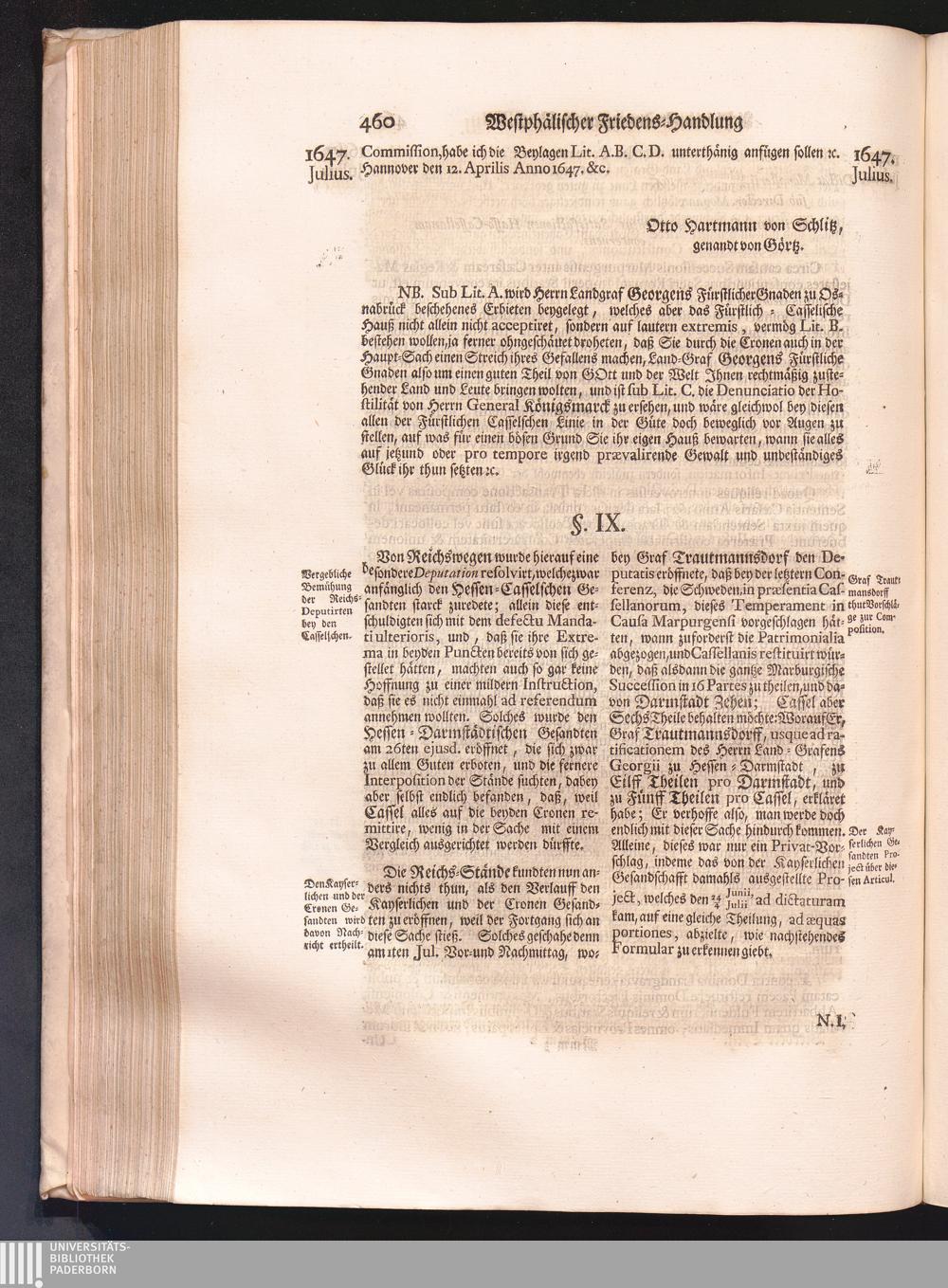 Vierdter Theil (1735) Worinnen enthalten, was vom Anfang des Jahrs 1647. biß gegen Ende desselben zwischen Jhro Römisch-Kayserlichen Majestät, dann den Beyden Cronen Franckreich und Schweden, ingleichen des Heiligen Römischen Reichs Chur-Fürsten, Fürsten und Ständen, zu Oßnabrück und Münster gehandelt worden