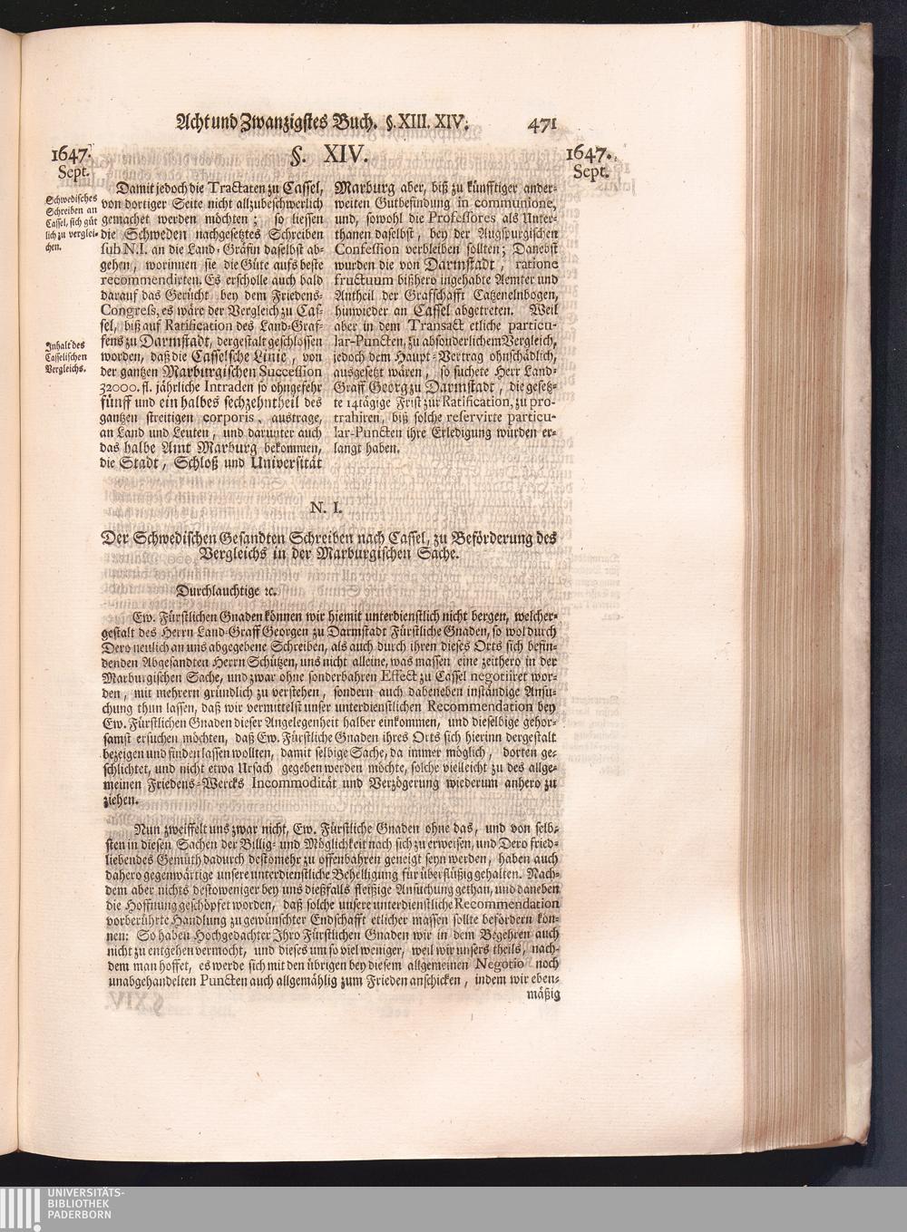 Vierdter Theil (1735) Worinnen enthalten, was vom Anfang des Jahrs 1647. biß gegen Ende desselben zwischen Jhro Römisch-Kayserlichen Majestät, dann den Beyden Cronen Franckreich und Schweden, ingleichen des Heiligen Römischen Reichs Chur-Fürsten, Fürsten und Ständen, zu Oßnabrück und Münster gehandelt worden