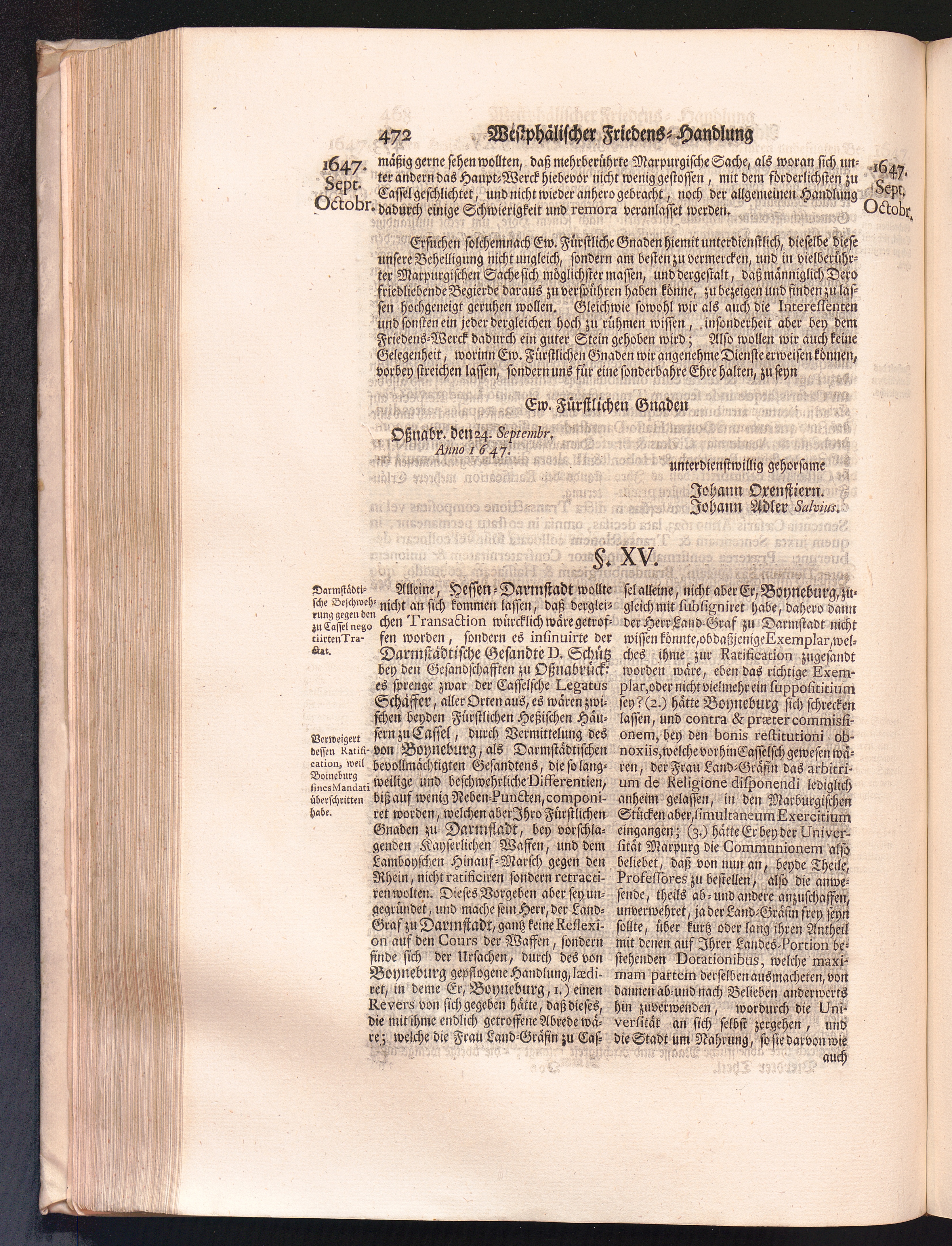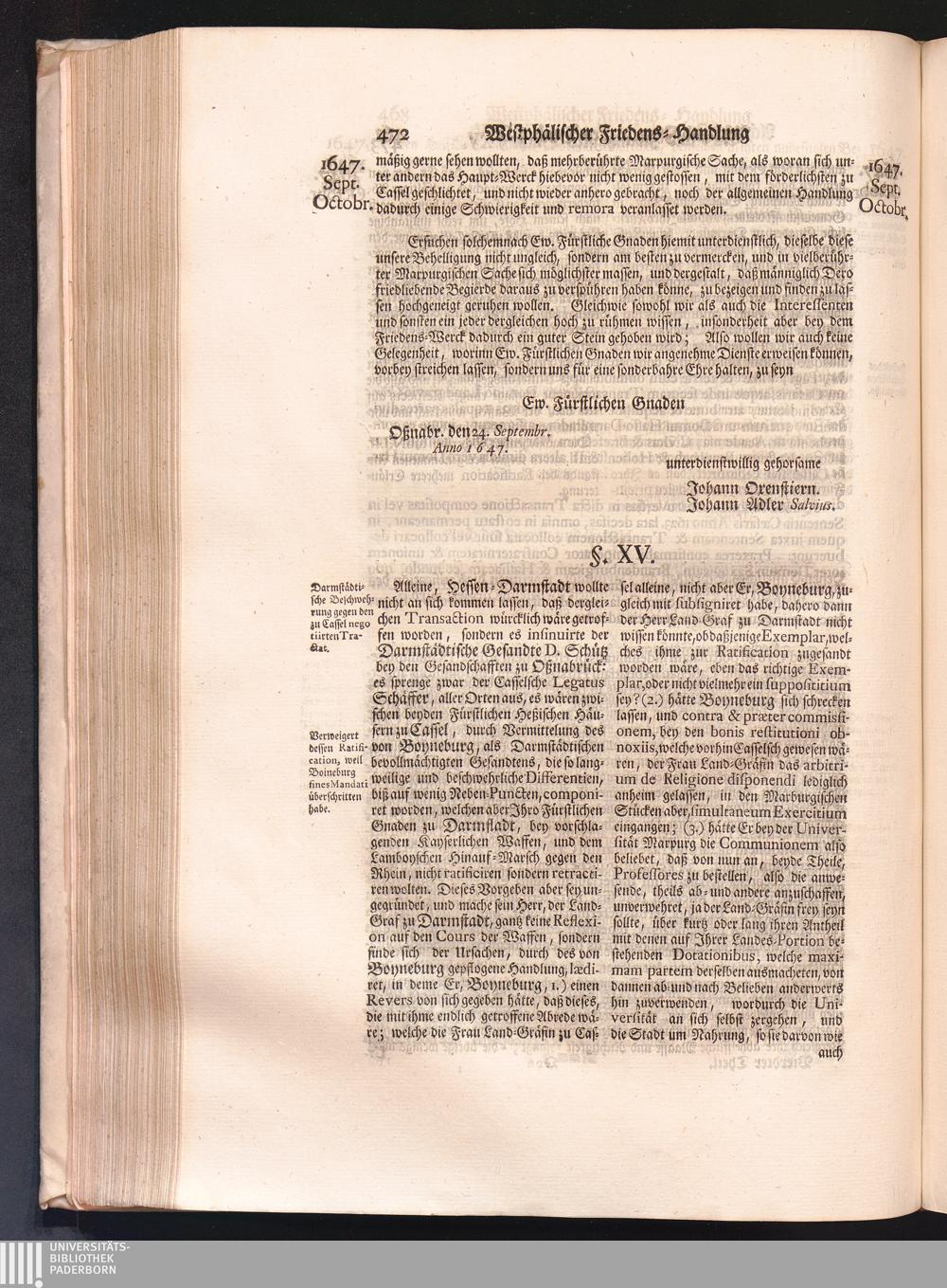 Vierdter Theil (1735) Worinnen enthalten, was vom Anfang des Jahrs 1647. biß gegen Ende desselben zwischen Jhro Römisch-Kayserlichen Majestät, dann den Beyden Cronen Franckreich und Schweden, ingleichen des Heiligen Römischen Reichs Chur-Fürsten, Fürsten und Ständen, zu Oßnabrück und Münster gehandelt worden