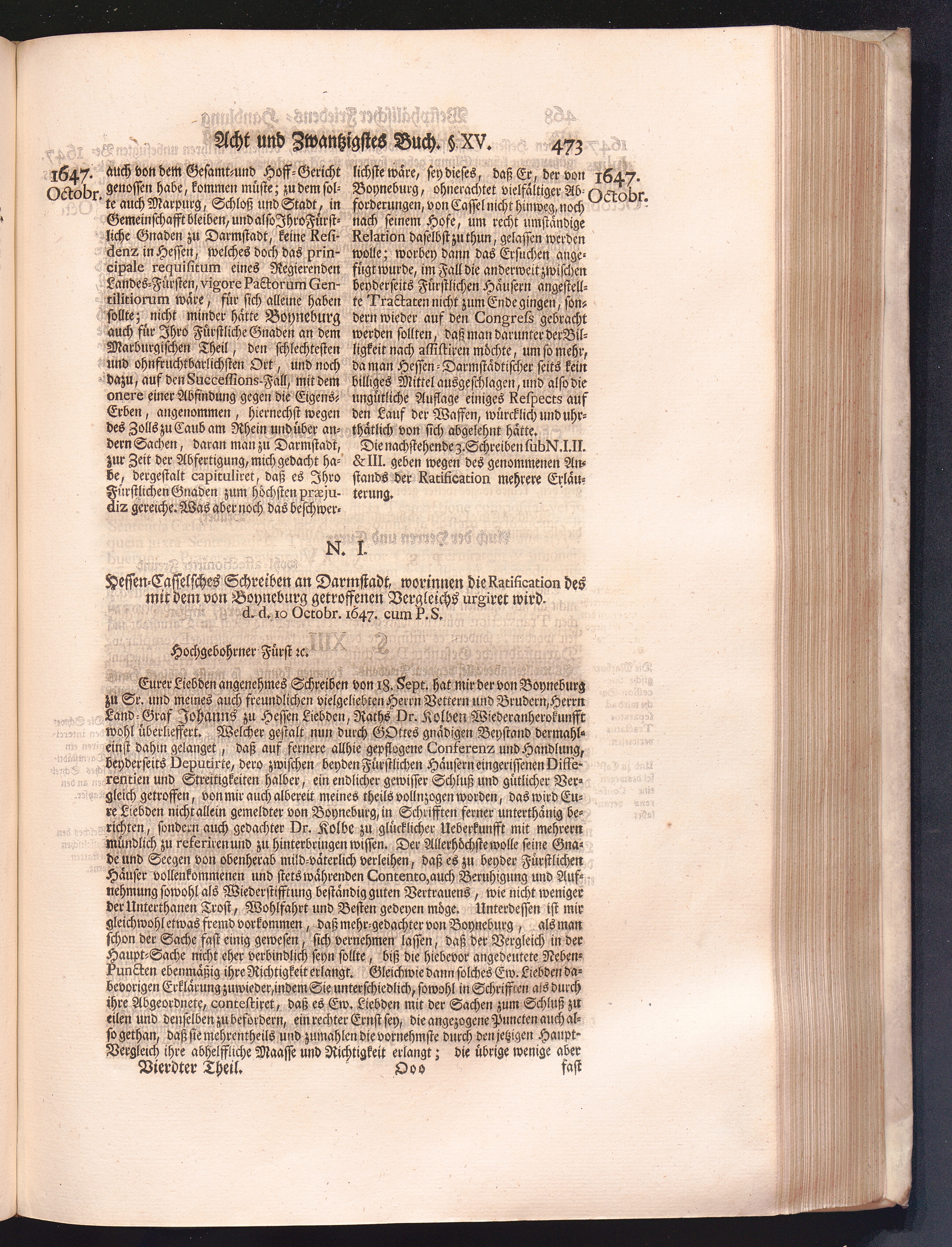 Vierdter Theil (1735) Worinnen enthalten, was vom Anfang des Jahrs 1647. biß gegen Ende desselben zwischen Jhro Römisch-Kayserlichen Majestät, dann den Beyden Cronen Franckreich und Schweden, ingleichen des Heiligen Römischen Reichs Chur-Fürsten, Fürsten und Ständen, zu Oßnabrück und Münster gehandelt worden