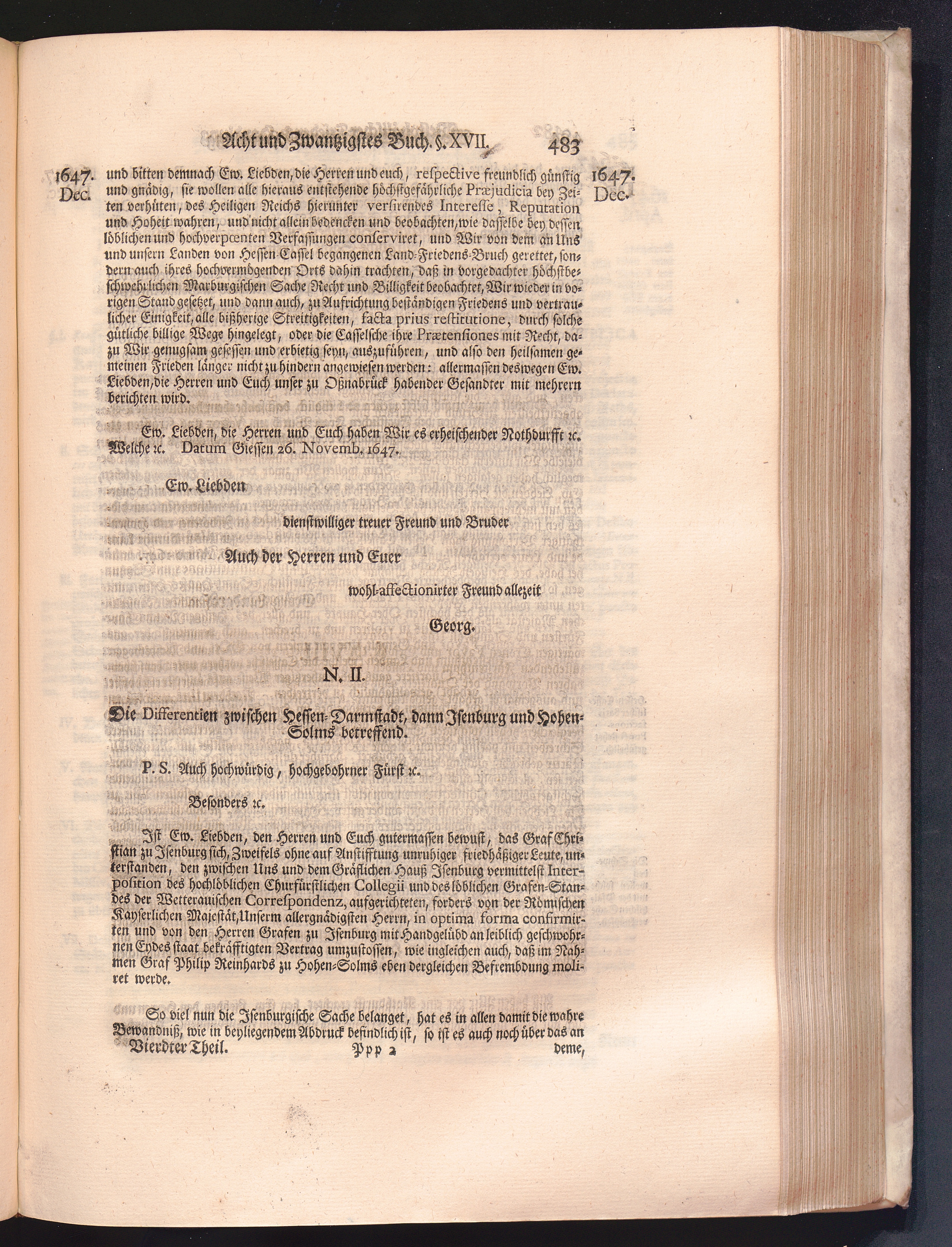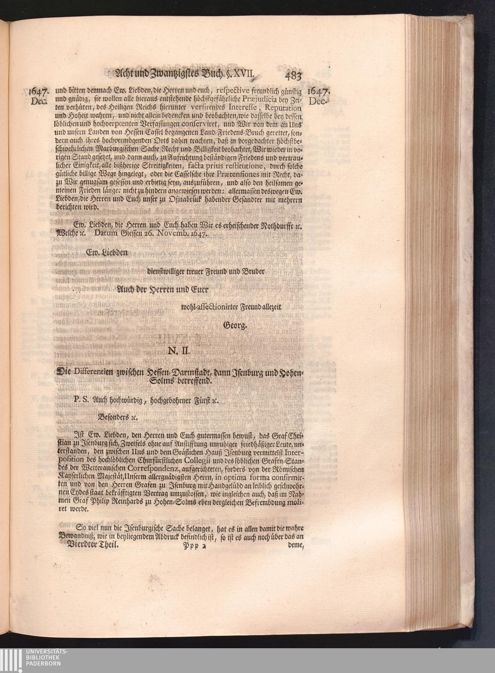 Vierdter Theil (1735) Worinnen enthalten, was vom Anfang des Jahrs 1647. biß gegen Ende desselben zwischen Jhro Römisch-Kayserlichen Majestät, dann den Beyden Cronen Franckreich und Schweden, ingleichen des Heiligen Römischen Reichs Chur-Fürsten, Fürsten und Ständen, zu Oßnabrück und Münster gehandelt worden
