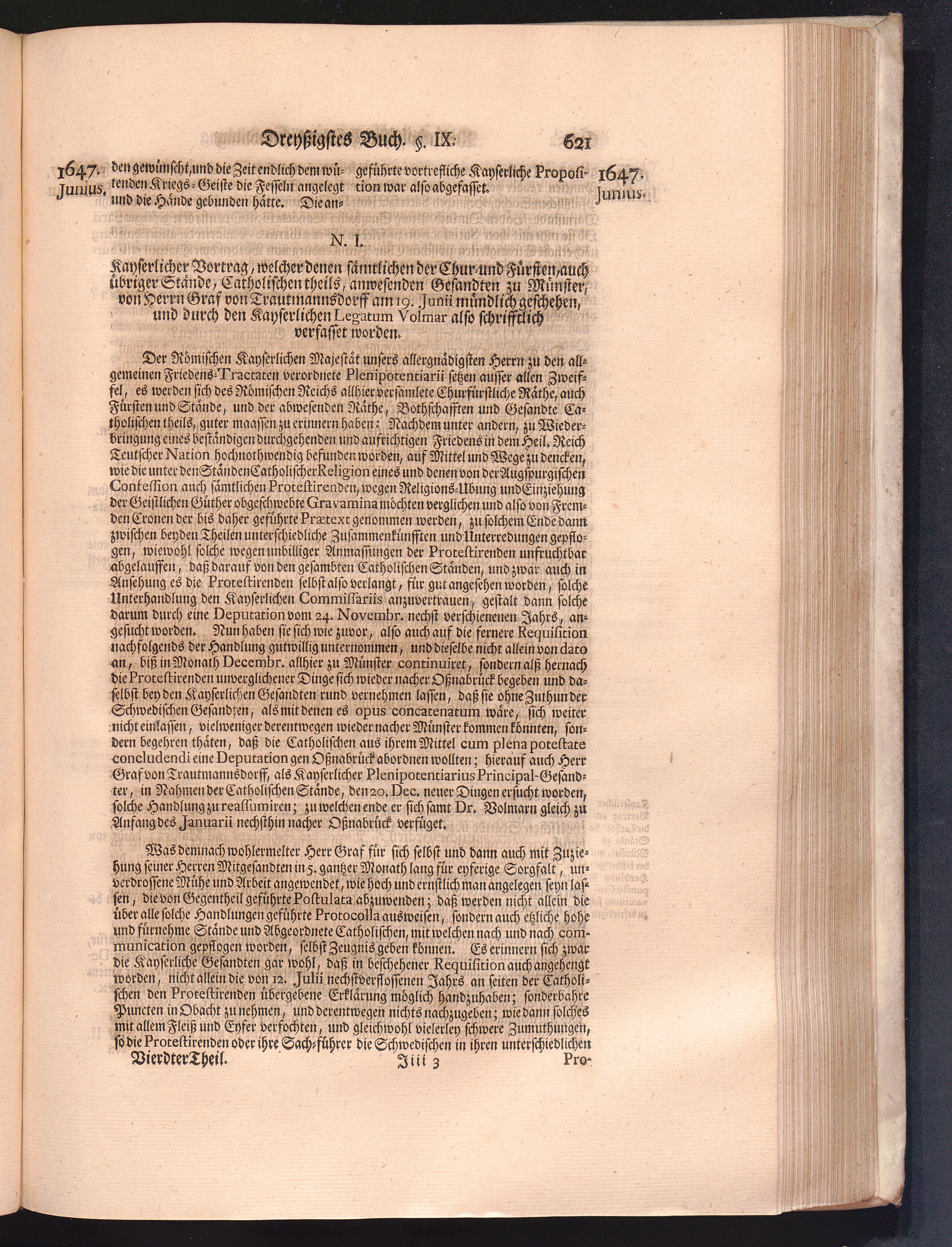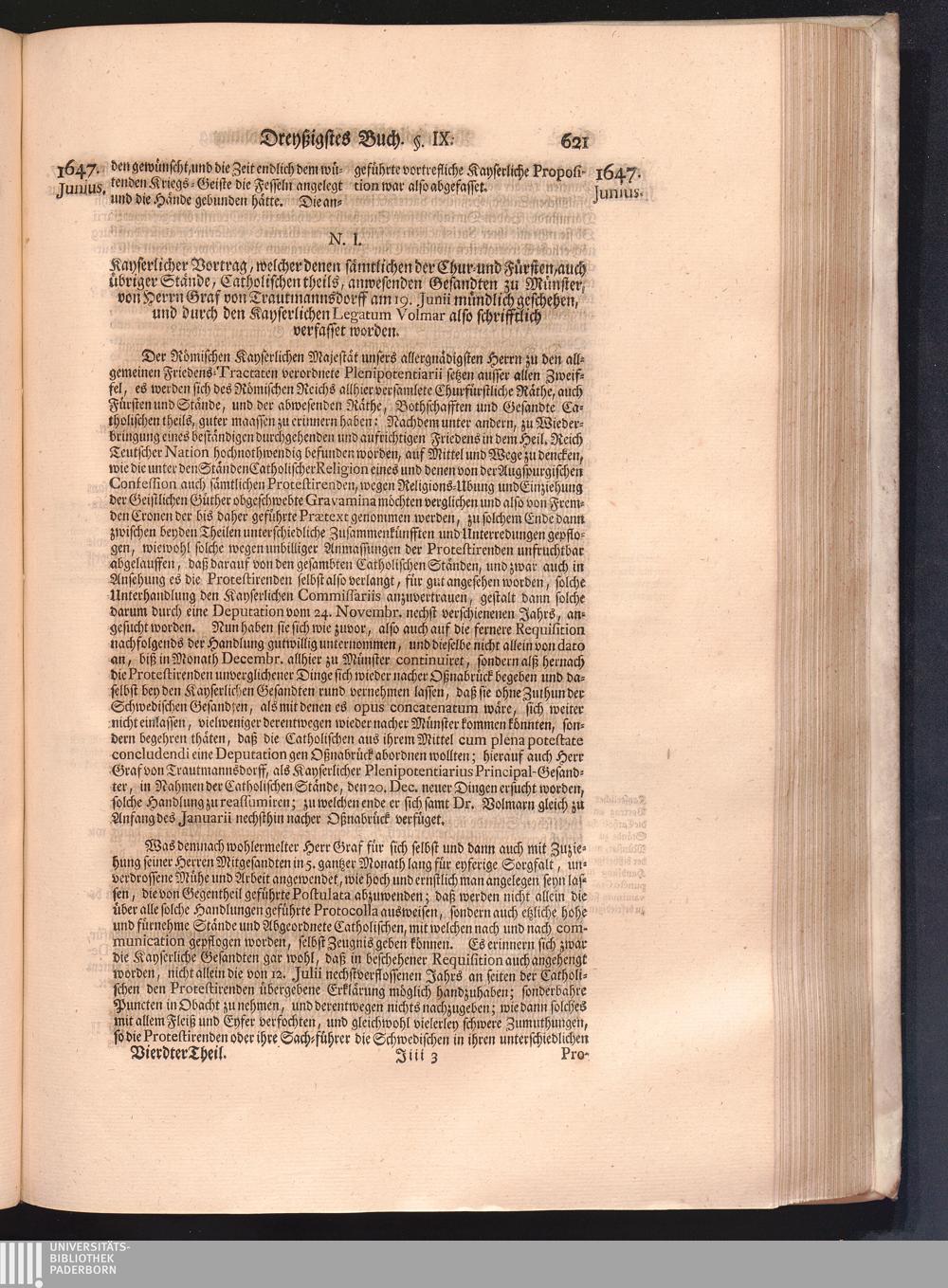 Vierdter Theil (1735) Worinnen enthalten, was vom Anfang des Jahrs 1647. biß gegen Ende desselben zwischen Jhro Römisch-Kayserlichen Majestät, dann den Beyden Cronen Franckreich und Schweden, ingleichen des Heiligen Römischen Reichs Chur-Fürsten, Fürsten und Ständen, zu Oßnabrück und Münster gehandelt worden
