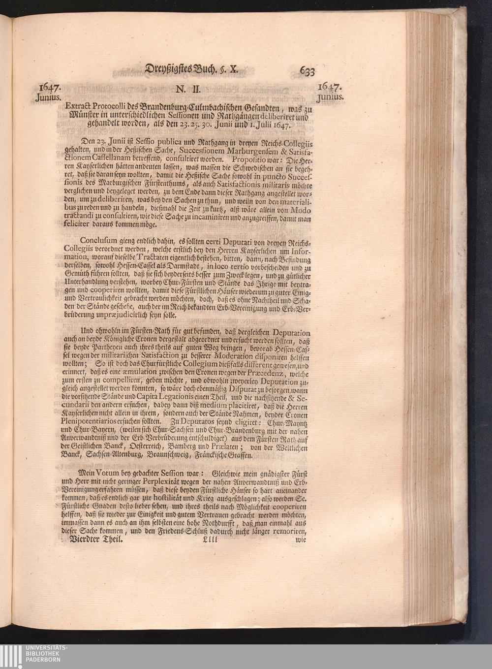 Vierdter Theil (1735) Worinnen enthalten, was vom Anfang des Jahrs 1647. biß gegen Ende desselben zwischen Jhro Römisch-Kayserlichen Majestät, dann den Beyden Cronen Franckreich und Schweden, ingleichen des Heiligen Römischen Reichs Chur-Fürsten, Fürsten und Ständen, zu Oßnabrück und Münster gehandelt worden