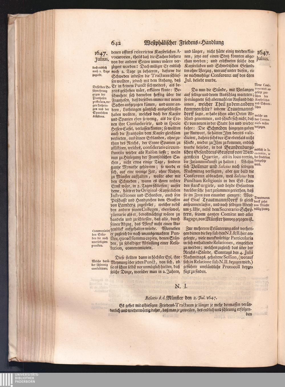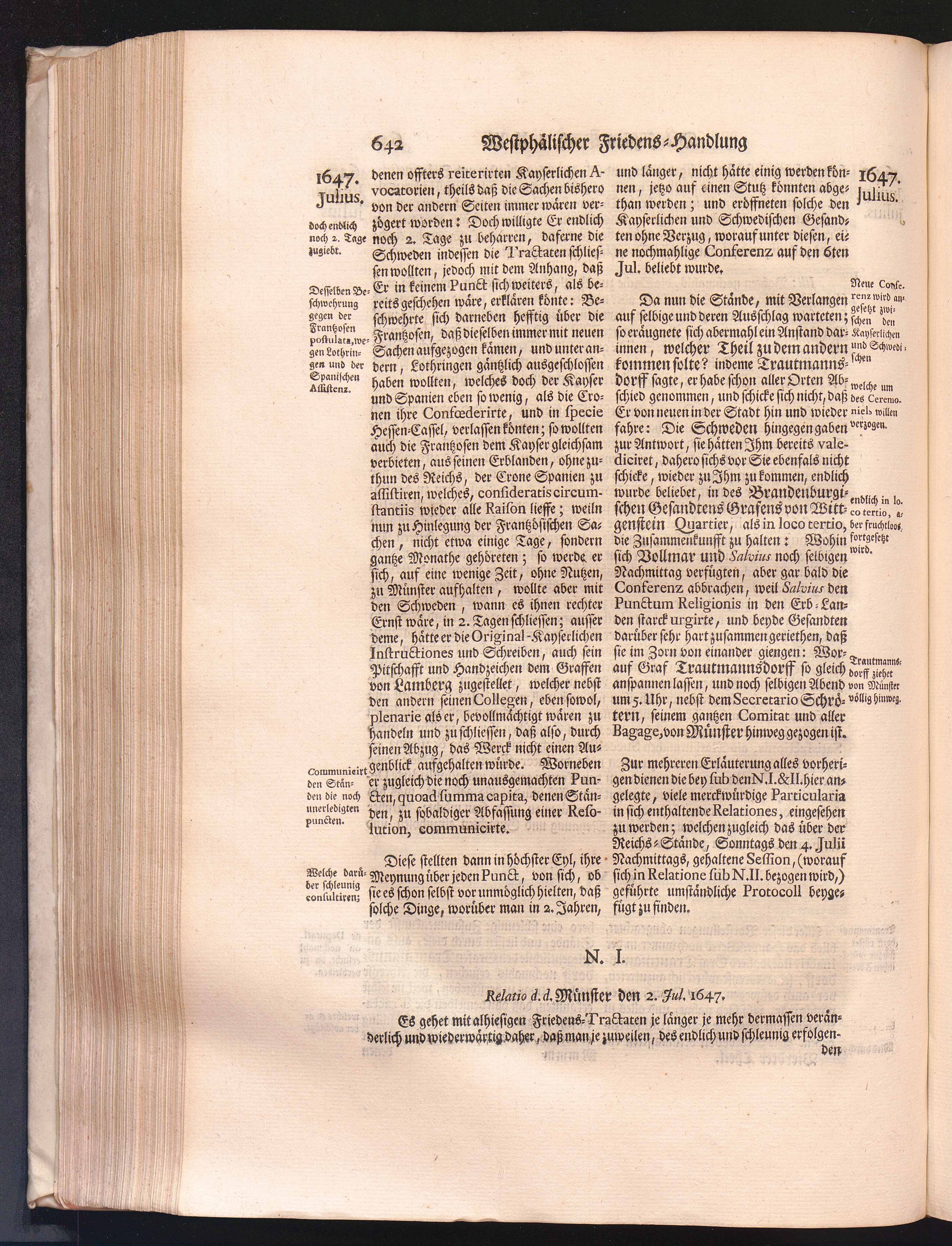 Vierdter Theil (1735) Worinnen enthalten, was vom Anfang des Jahrs 1647. biß gegen Ende desselben zwischen Jhro Römisch-Kayserlichen Majestät, dann den Beyden Cronen Franckreich und Schweden, ingleichen des Heiligen Römischen Reichs Chur-Fürsten, Fürsten und Ständen, zu Oßnabrück und Münster gehandelt worden