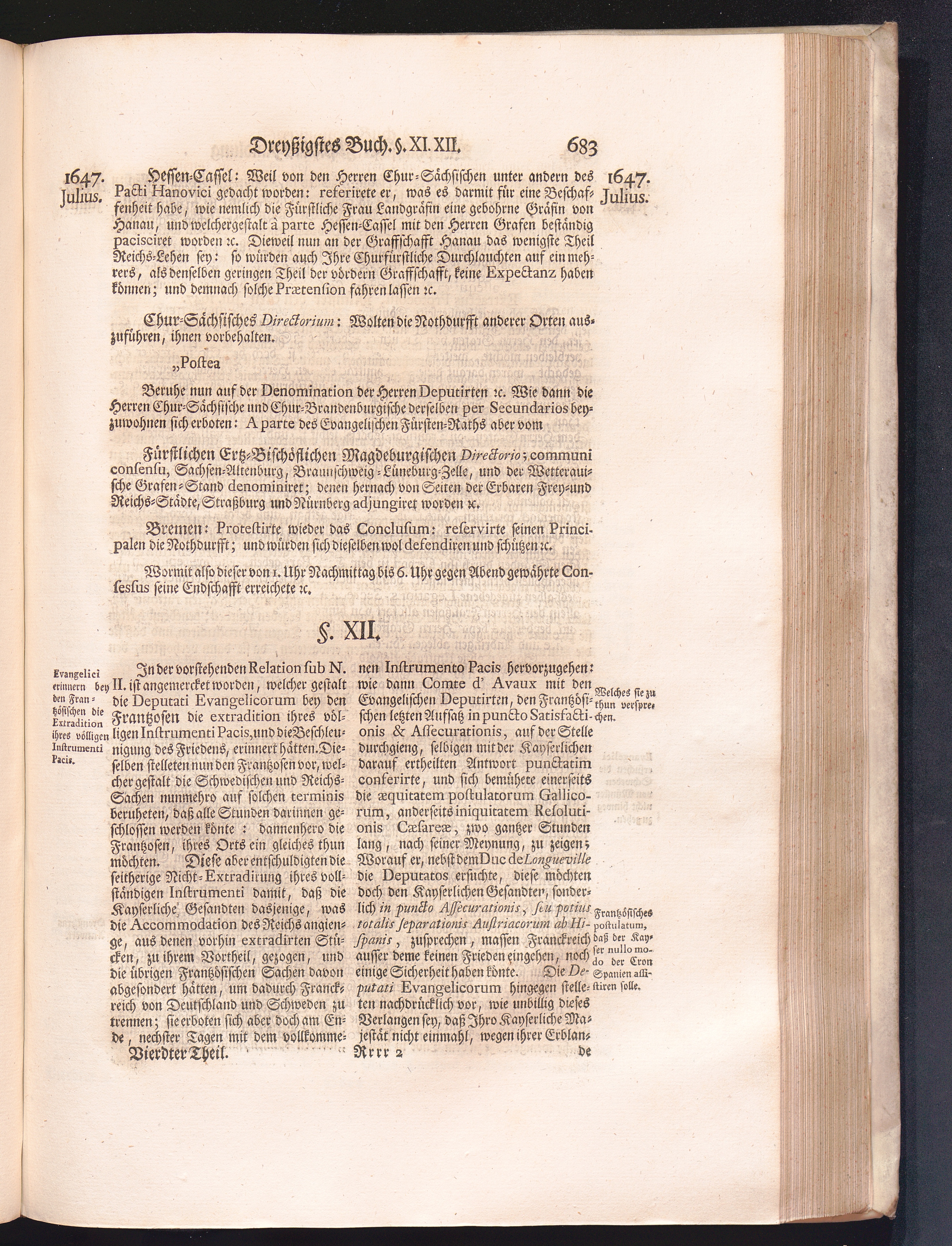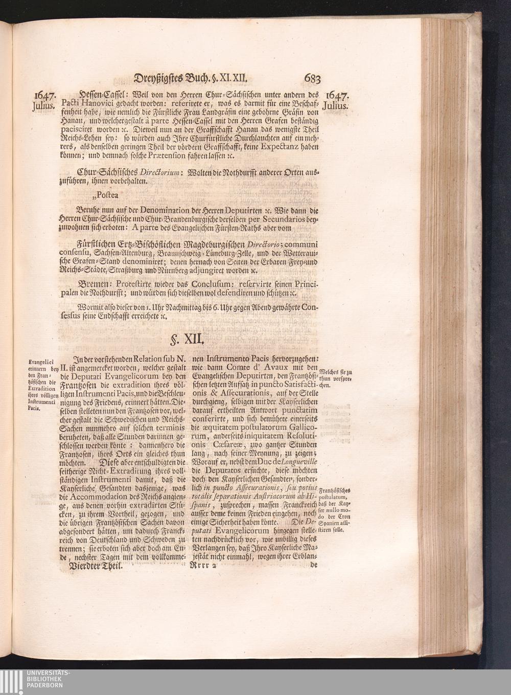 Vierdter Theil (1735) Worinnen enthalten, was vom Anfang des Jahrs 1647. biß gegen Ende desselben zwischen Jhro Römisch-Kayserlichen Majestät, dann den Beyden Cronen Franckreich und Schweden, ingleichen des Heiligen Römischen Reichs Chur-Fürsten, Fürsten und Ständen, zu Oßnabrück und Münster gehandelt worden