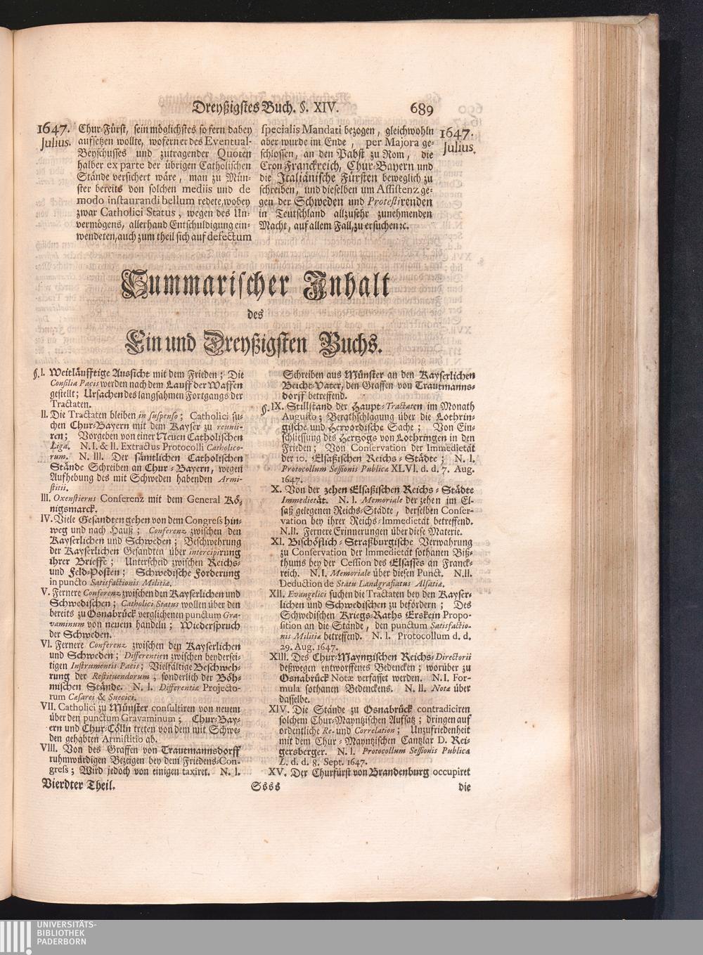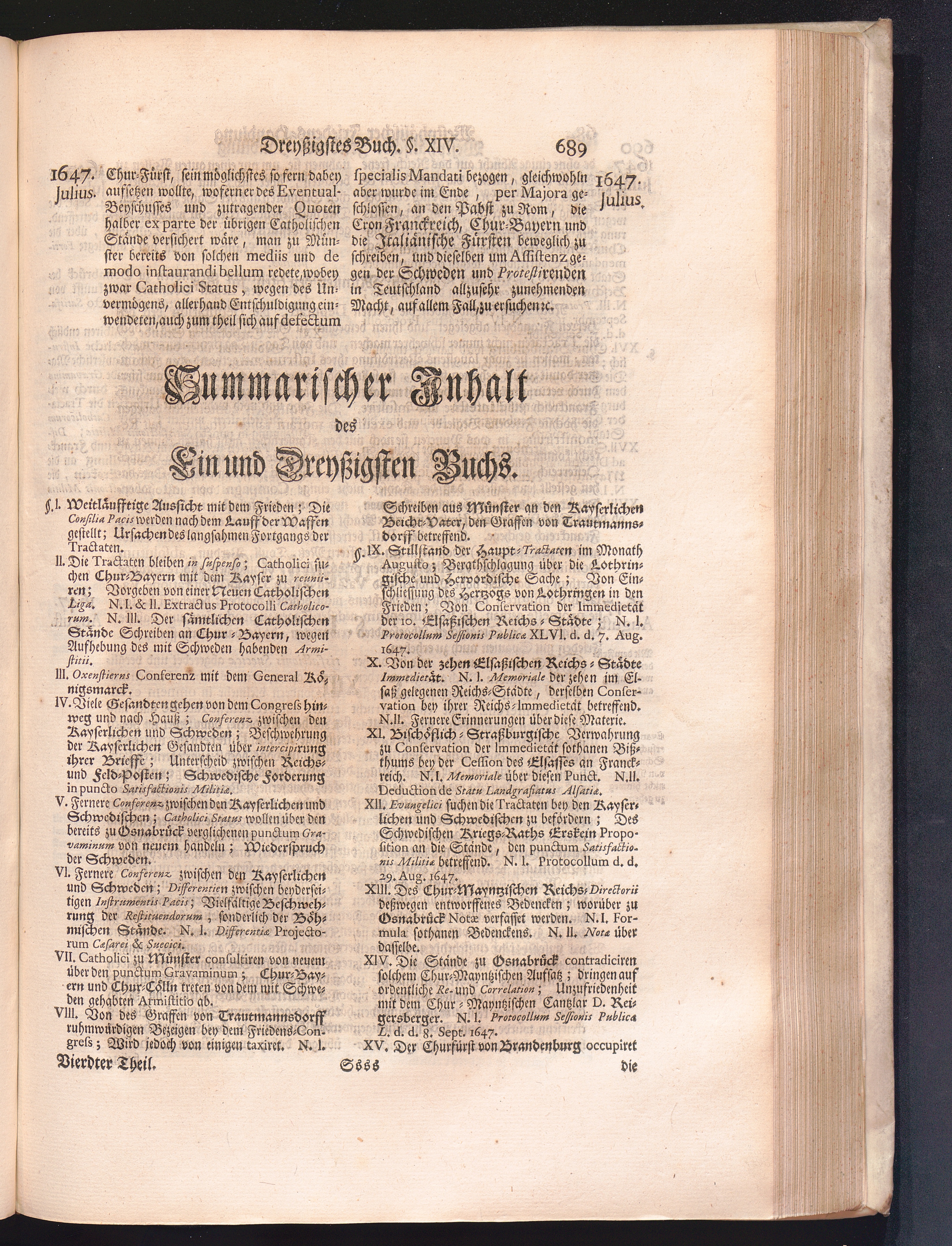 Vierdter Theil (1735) Worinnen enthalten, was vom Anfang des Jahrs 1647. biß gegen Ende desselben zwischen Jhro Römisch-Kayserlichen Majestät, dann den Beyden Cronen Franckreich und Schweden, ingleichen des Heiligen Römischen Reichs Chur-Fürsten, Fürsten und Ständen, zu Oßnabrück und Münster gehandelt worden