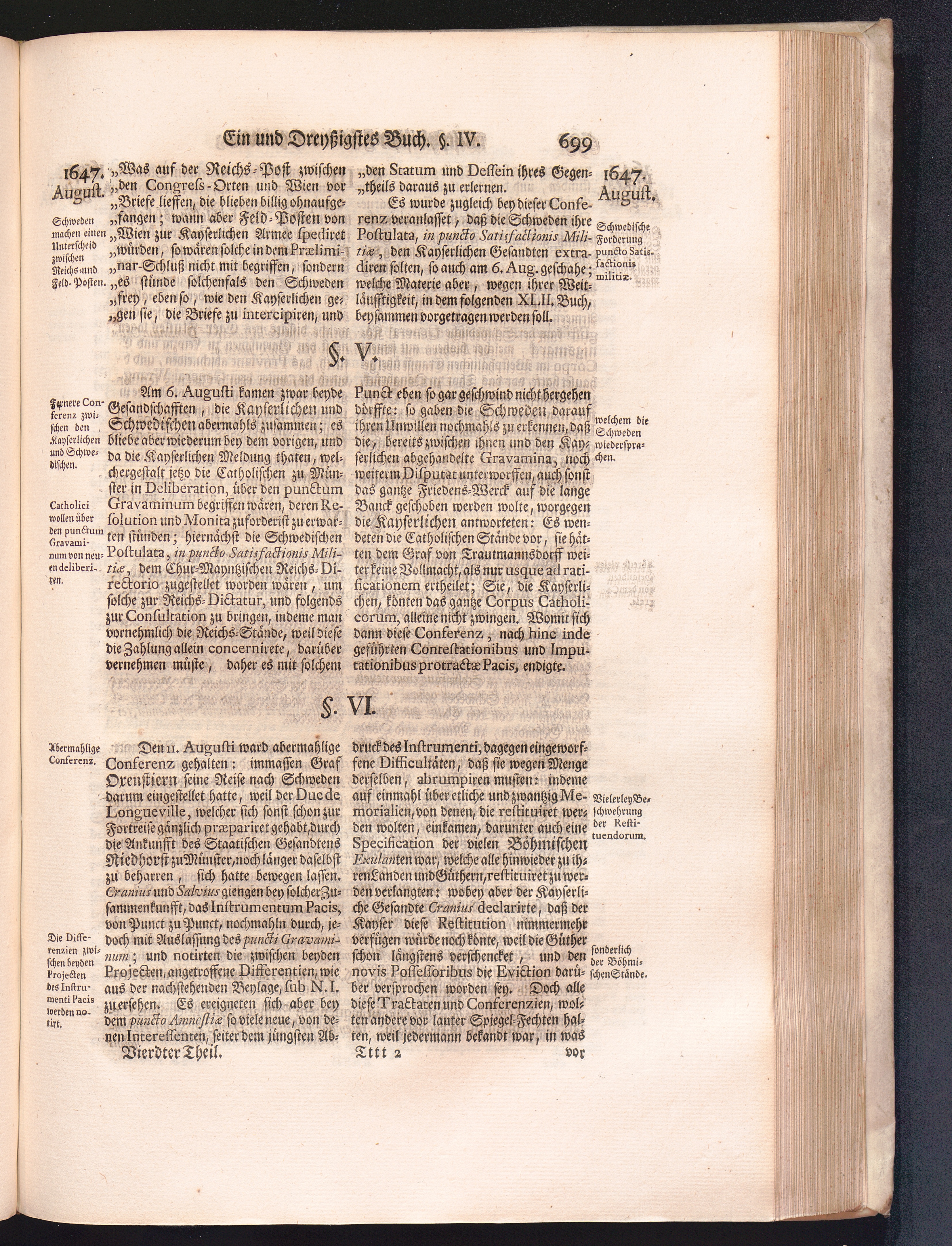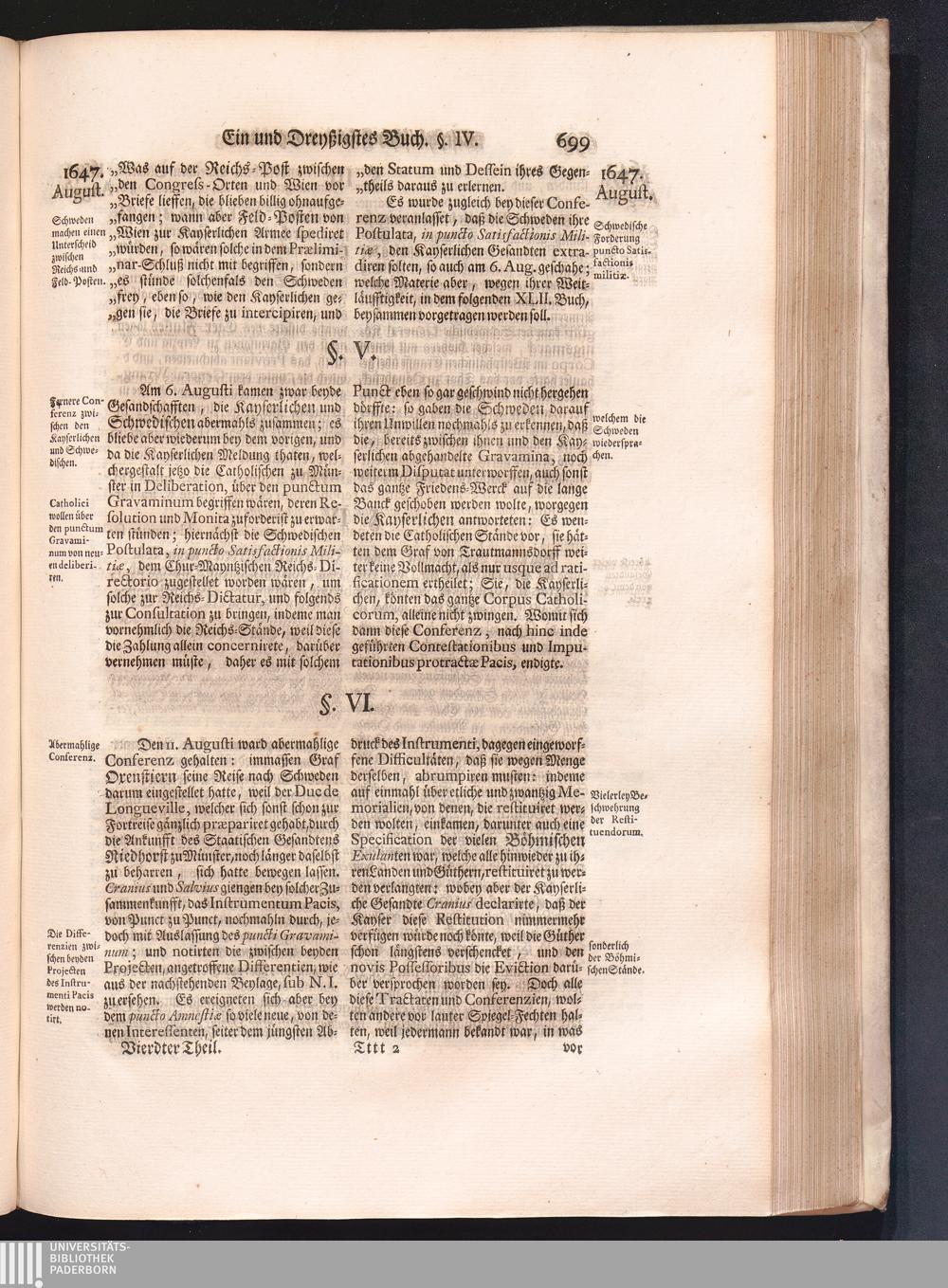 Vierdter Theil (1735) Worinnen enthalten, was vom Anfang des Jahrs 1647. biß gegen Ende desselben zwischen Jhro Römisch-Kayserlichen Majestät, dann den Beyden Cronen Franckreich und Schweden, ingleichen des Heiligen Römischen Reichs Chur-Fürsten, Fürsten und Ständen, zu Oßnabrück und Münster gehandelt worden