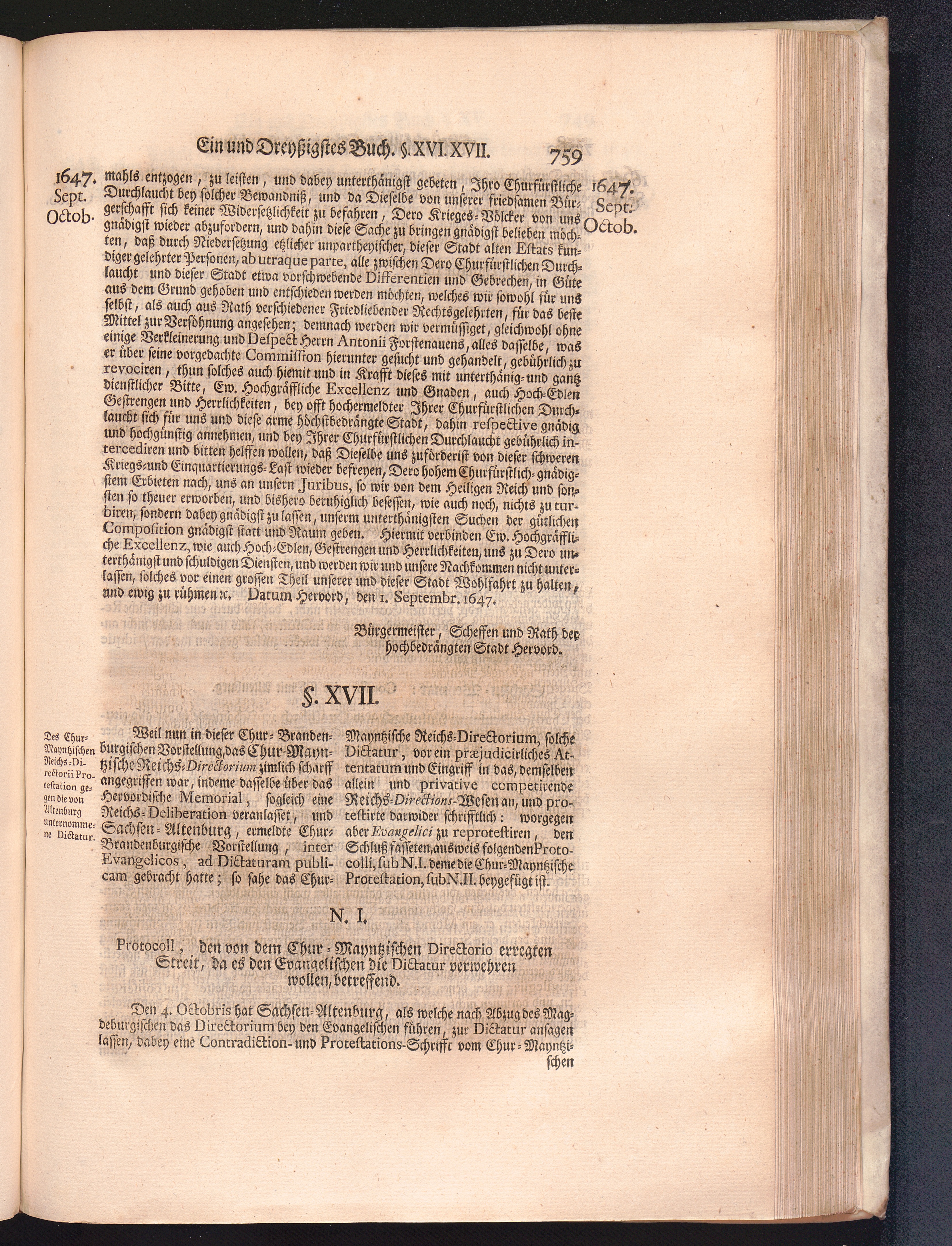 Vierdter Theil (1735) Worinnen enthalten, was vom Anfang des Jahrs 1647. biß gegen Ende desselben zwischen Jhro Römisch-Kayserlichen Majestät, dann den Beyden Cronen Franckreich und Schweden, ingleichen des Heiligen Römischen Reichs Chur-Fürsten, Fürsten und Ständen, zu Oßnabrück und Münster gehandelt worden