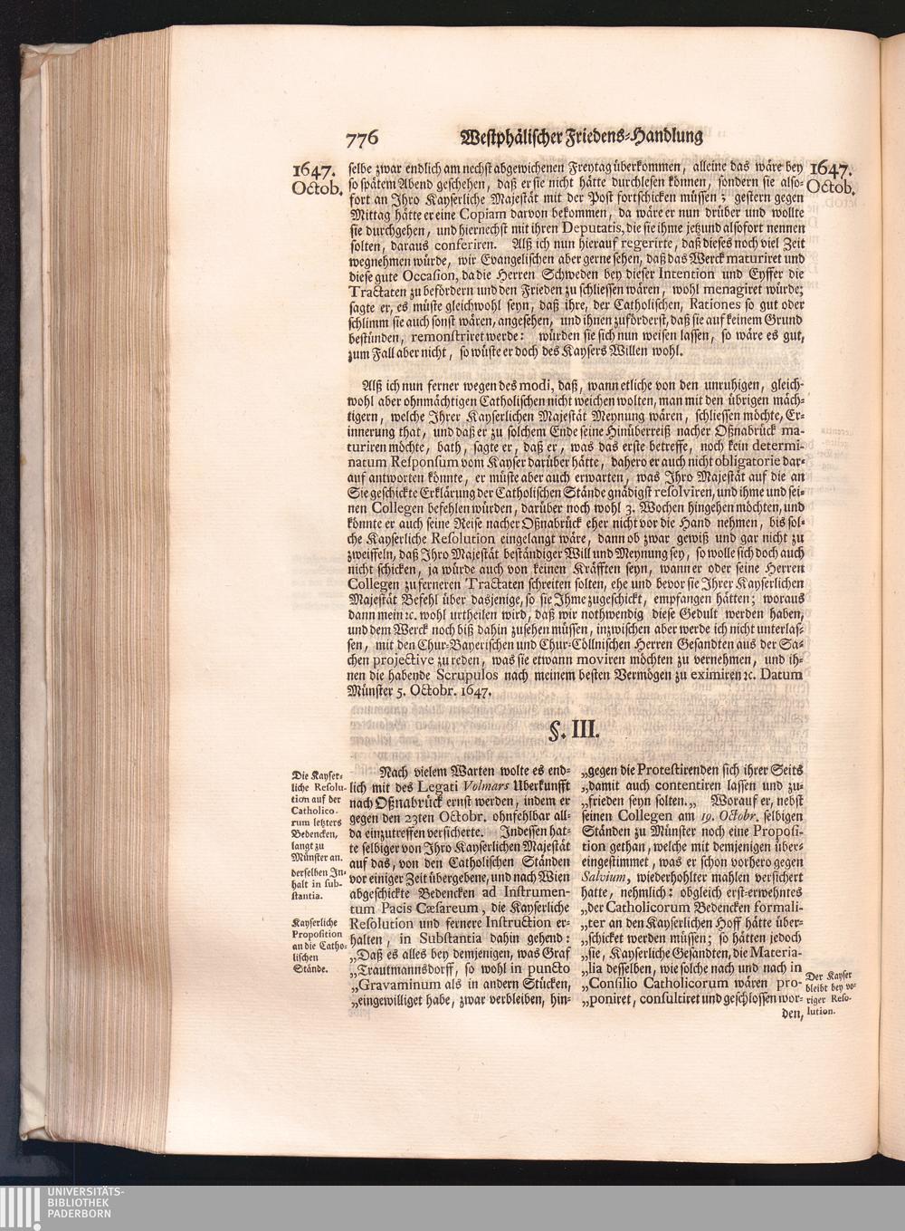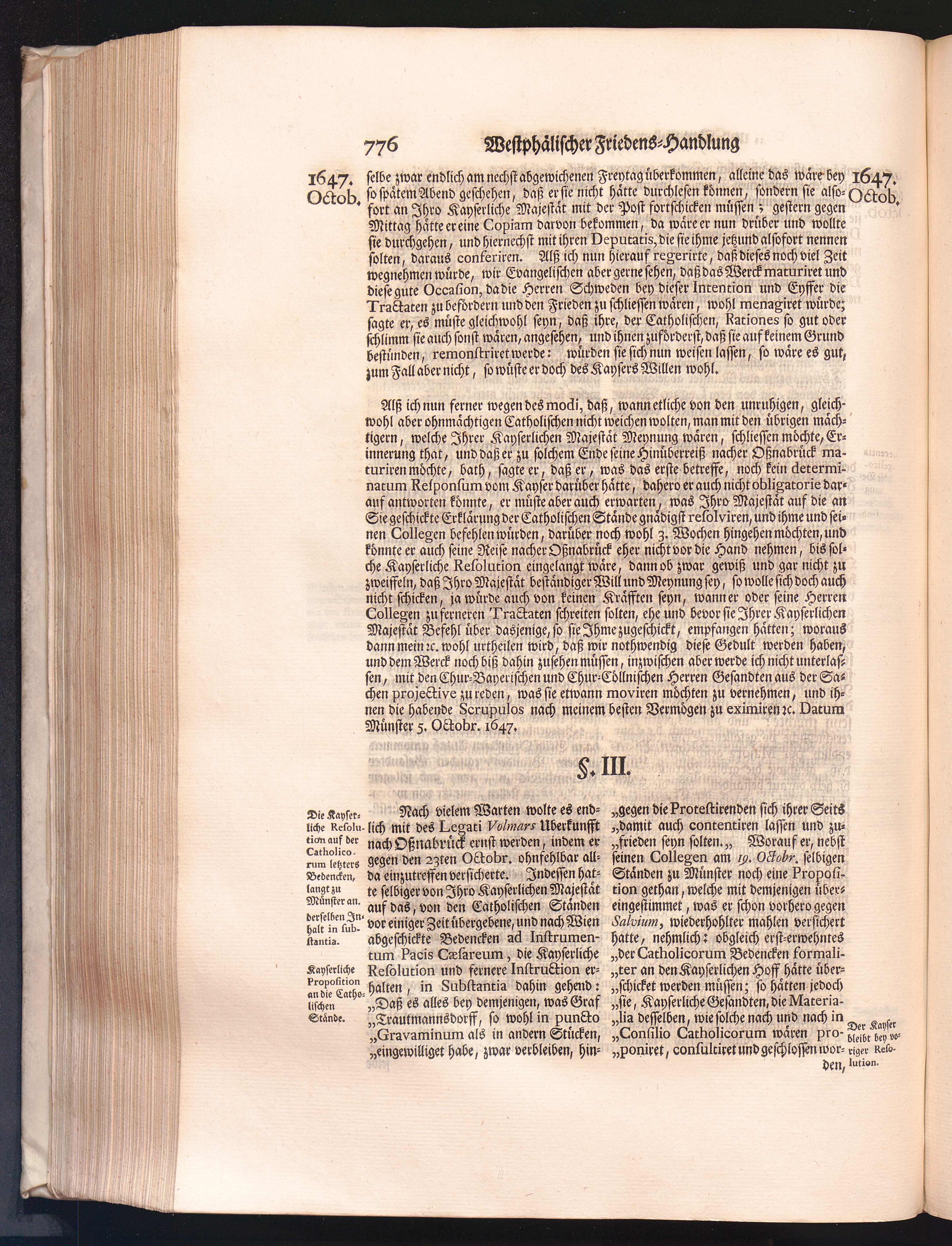 Vierdter Theil (1735) Worinnen enthalten, was vom Anfang des Jahrs 1647. biß gegen Ende desselben zwischen Jhro Römisch-Kayserlichen Majestät, dann den Beyden Cronen Franckreich und Schweden, ingleichen des Heiligen Römischen Reichs Chur-Fürsten, Fürsten und Ständen, zu Oßnabrück und Münster gehandelt worden