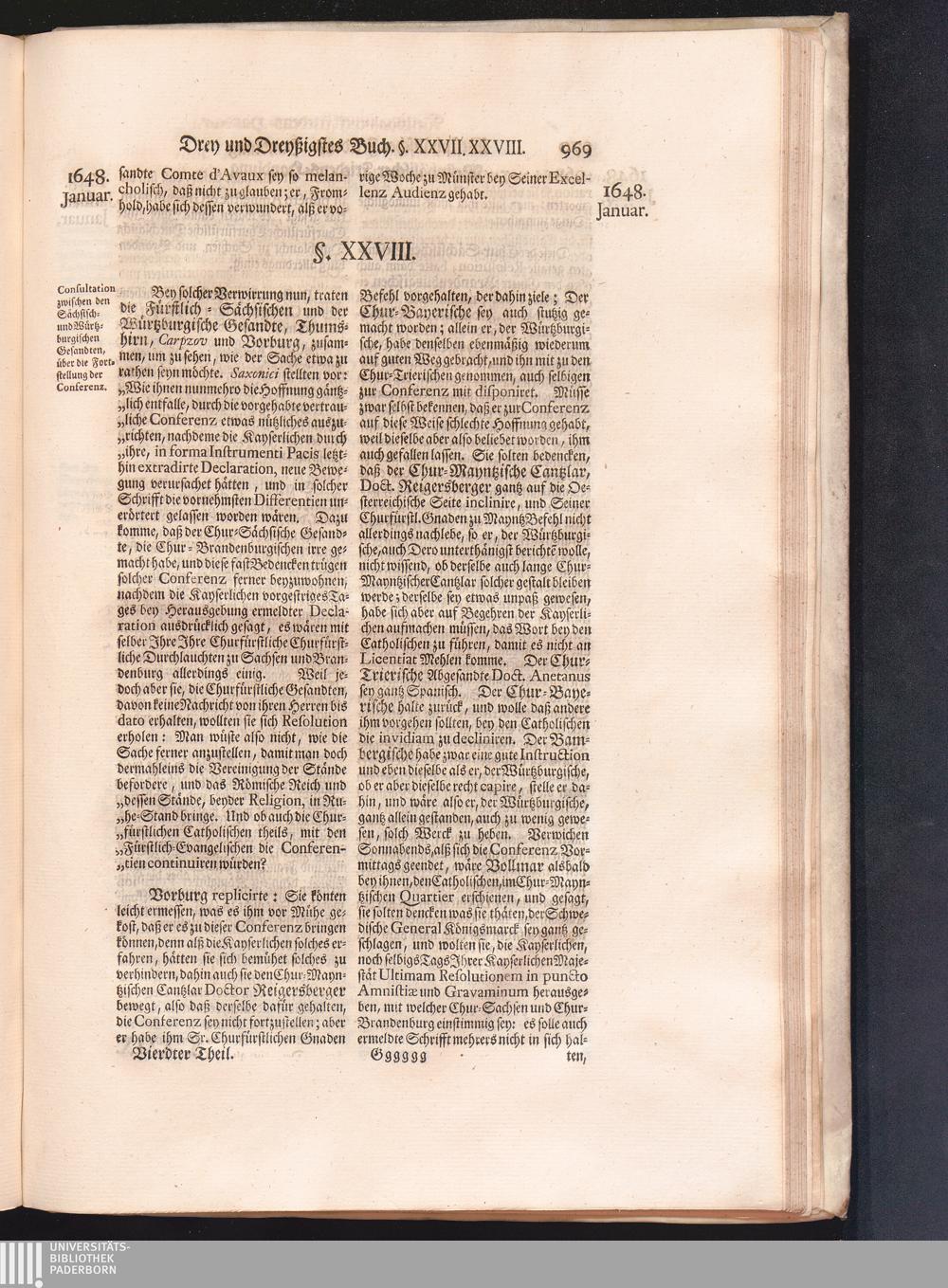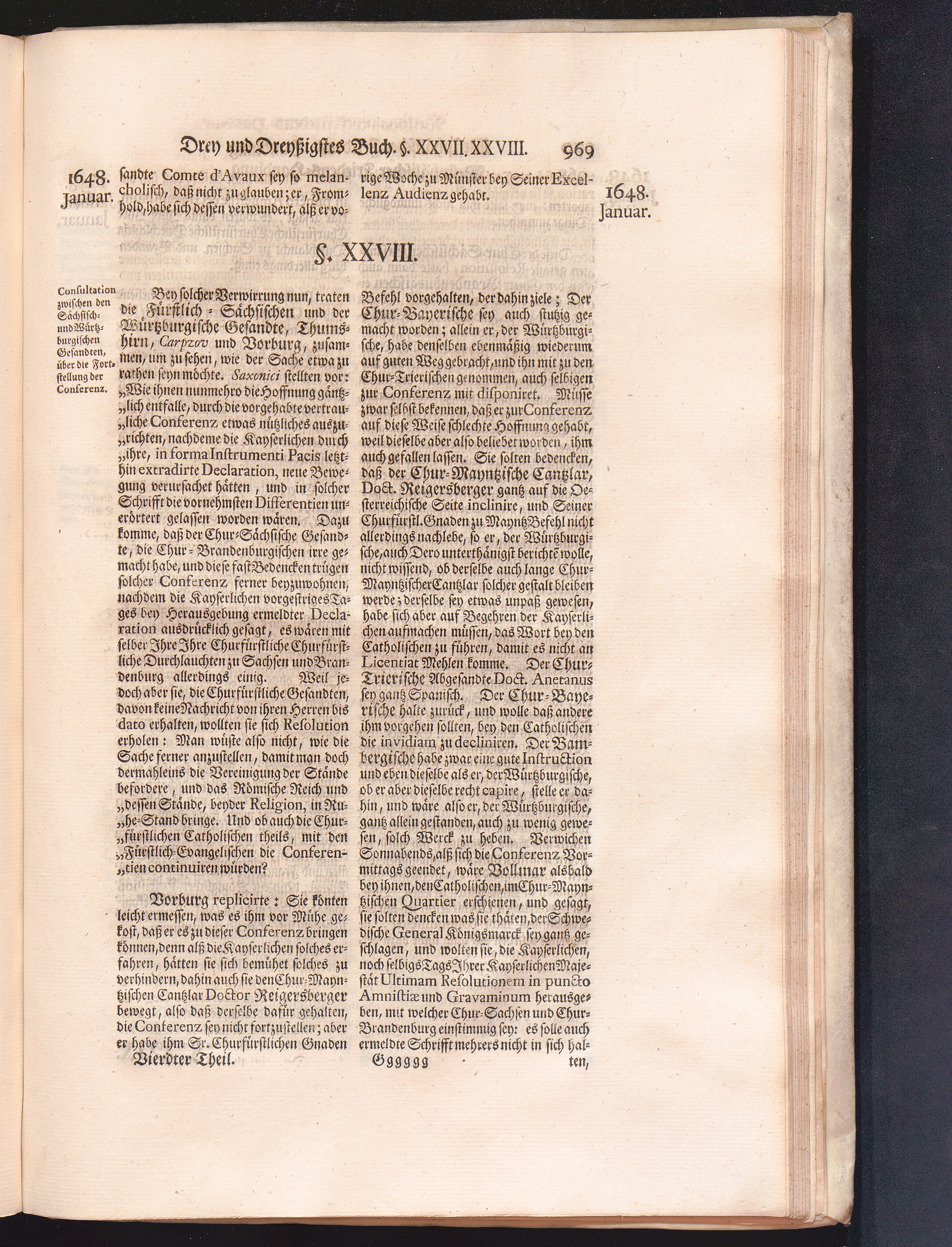 Vierdter Theil (1735) Worinnen enthalten, was vom Anfang des Jahrs 1647. biß gegen Ende desselben zwischen Jhro Römisch-Kayserlichen Majestät, dann den Beyden Cronen Franckreich und Schweden, ingleichen des Heiligen Römischen Reichs Chur-Fürsten, Fürsten und Ständen, zu Oßnabrück und Münster gehandelt worden