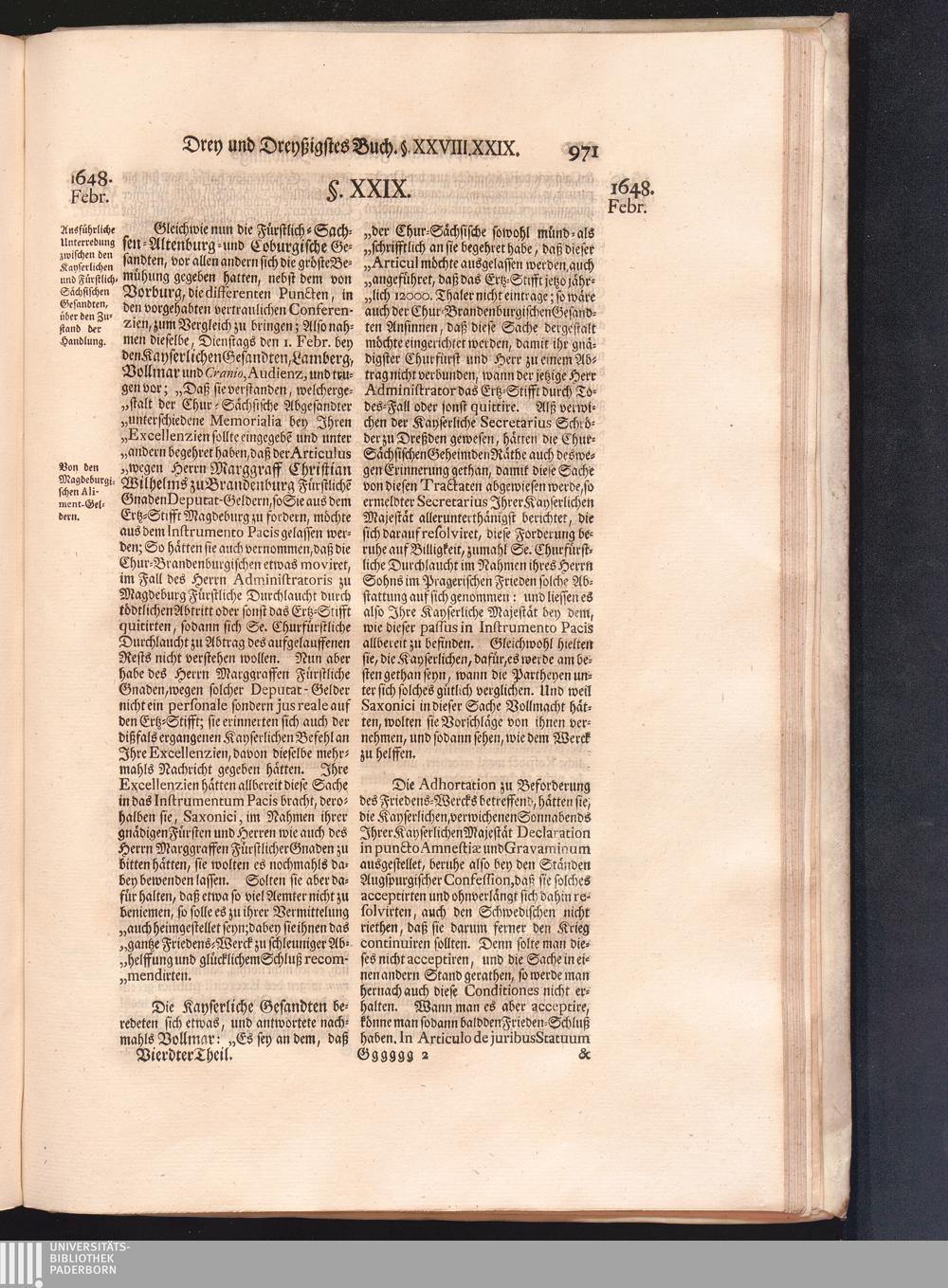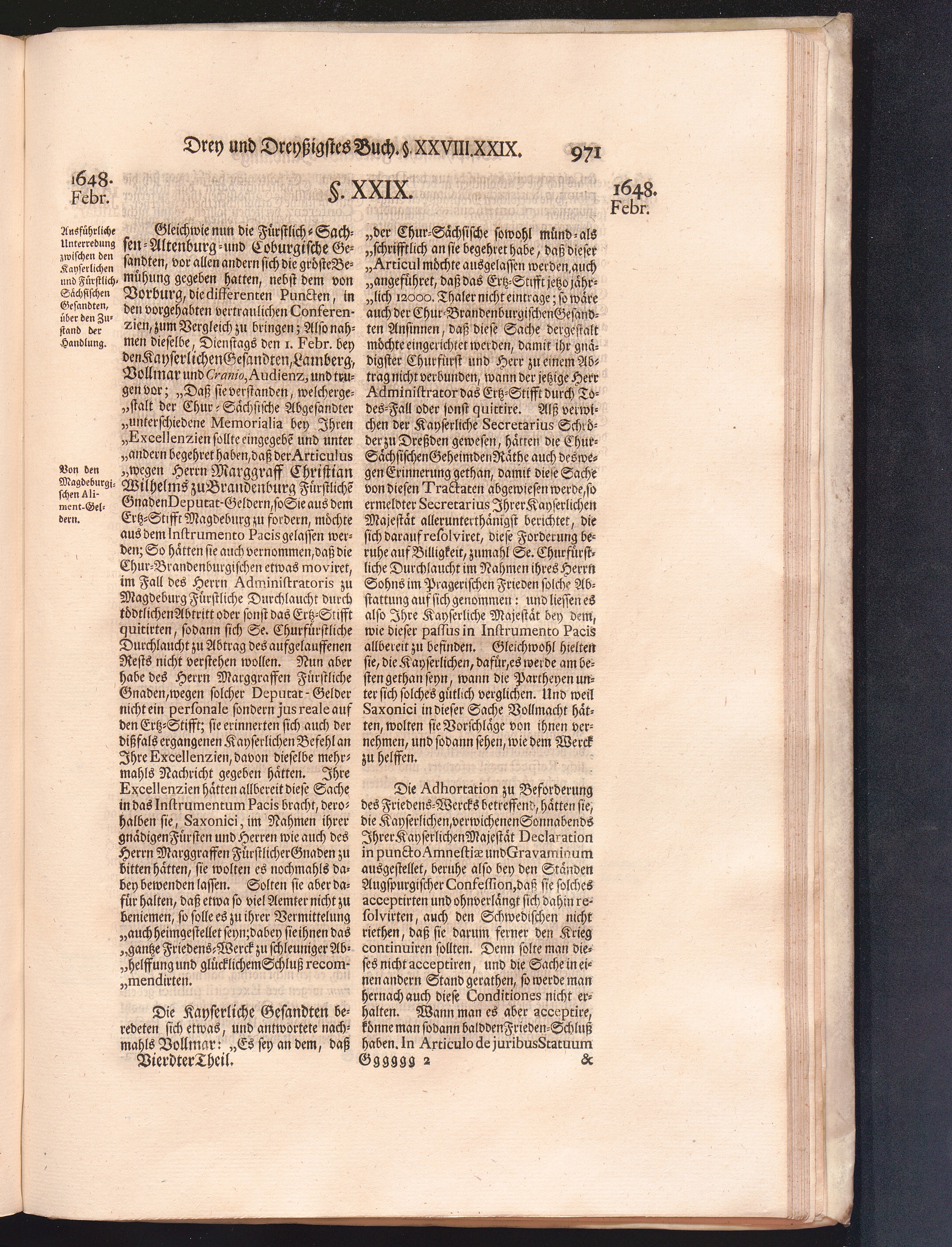 Vierdter Theil (1735) Worinnen enthalten, was vom Anfang des Jahrs 1647. biß gegen Ende desselben zwischen Jhro Römisch-Kayserlichen Majestät, dann den Beyden Cronen Franckreich und Schweden, ingleichen des Heiligen Römischen Reichs Chur-Fürsten, Fürsten und Ständen, zu Oßnabrück und Münster gehandelt worden