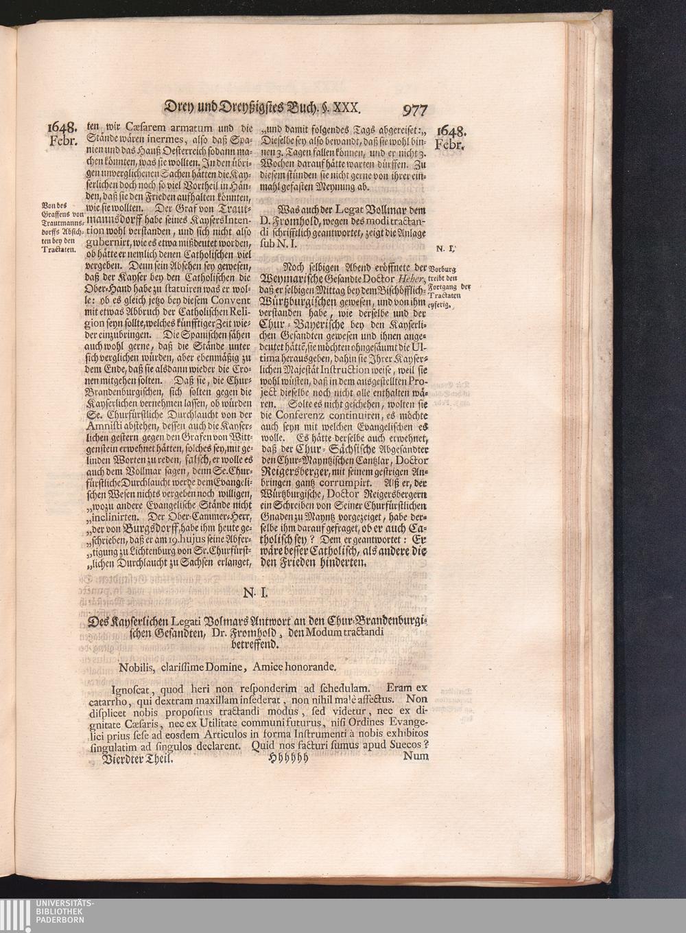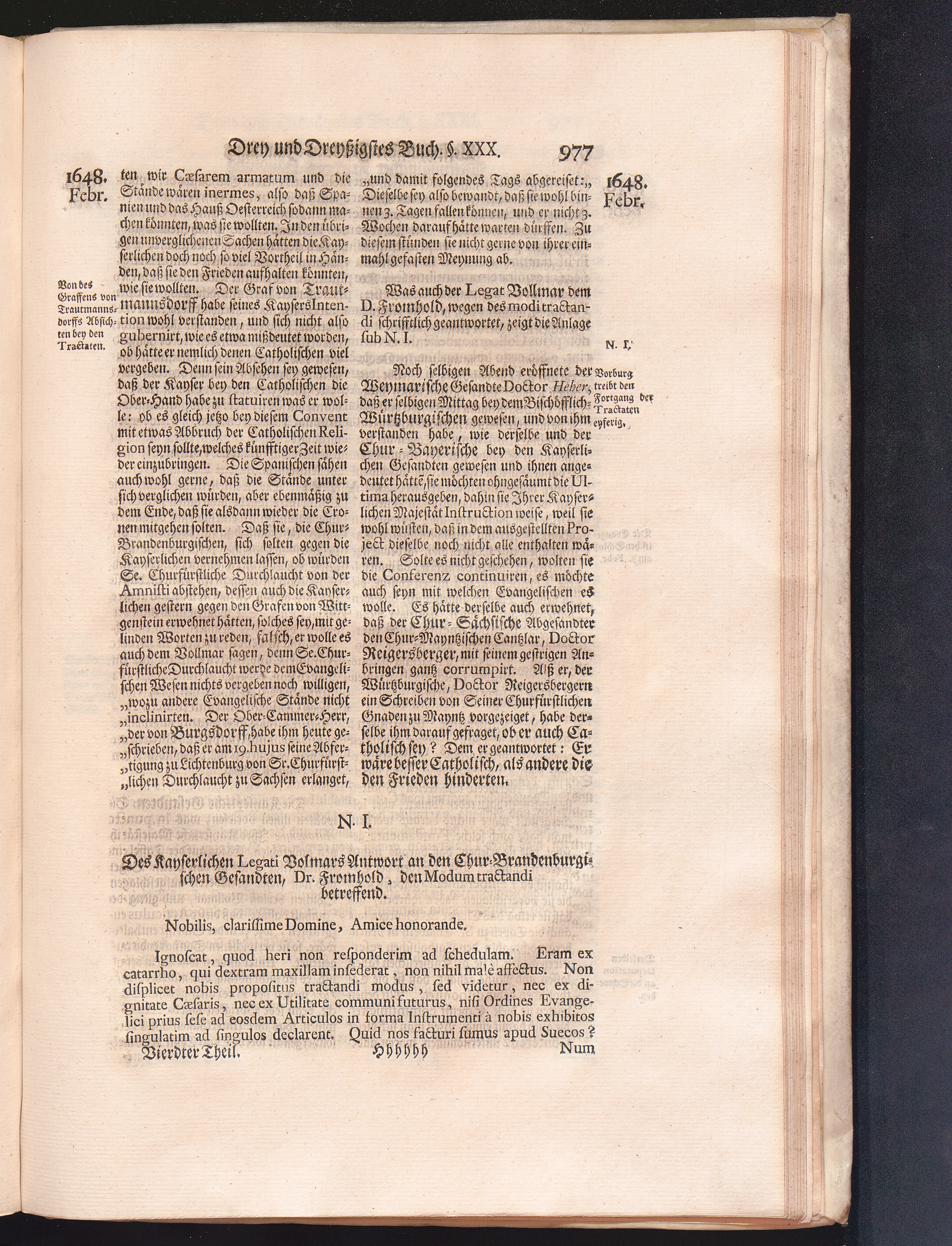 Vierdter Theil (1735) Worinnen enthalten, was vom Anfang des Jahrs 1647. biß gegen Ende desselben zwischen Jhro Römisch-Kayserlichen Majestät, dann den Beyden Cronen Franckreich und Schweden, ingleichen des Heiligen Römischen Reichs Chur-Fürsten, Fürsten und Ständen, zu Oßnabrück und Münster gehandelt worden