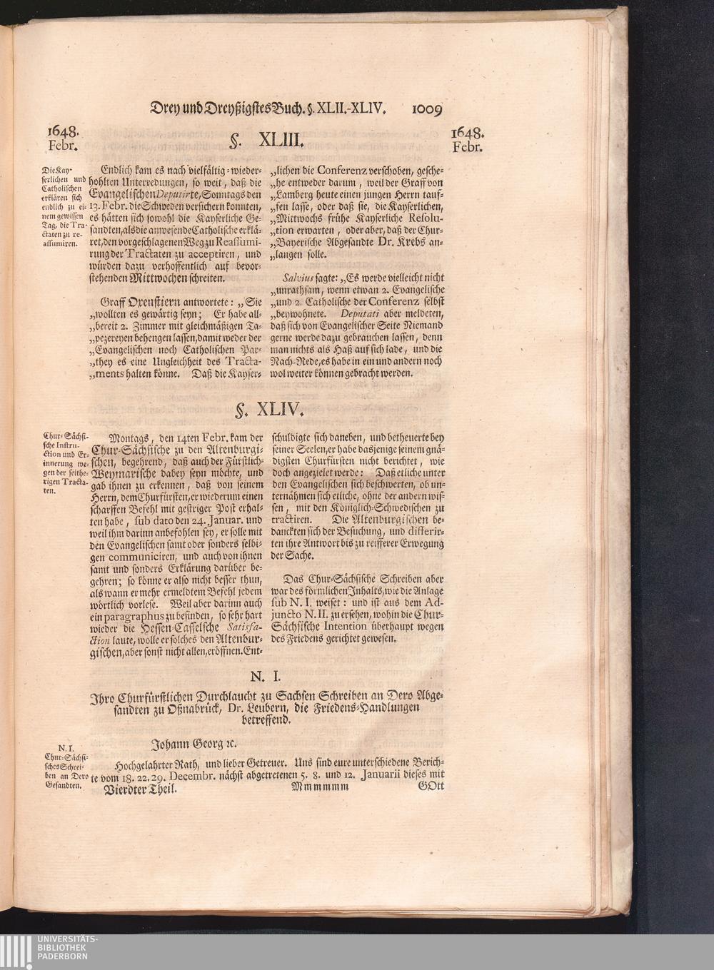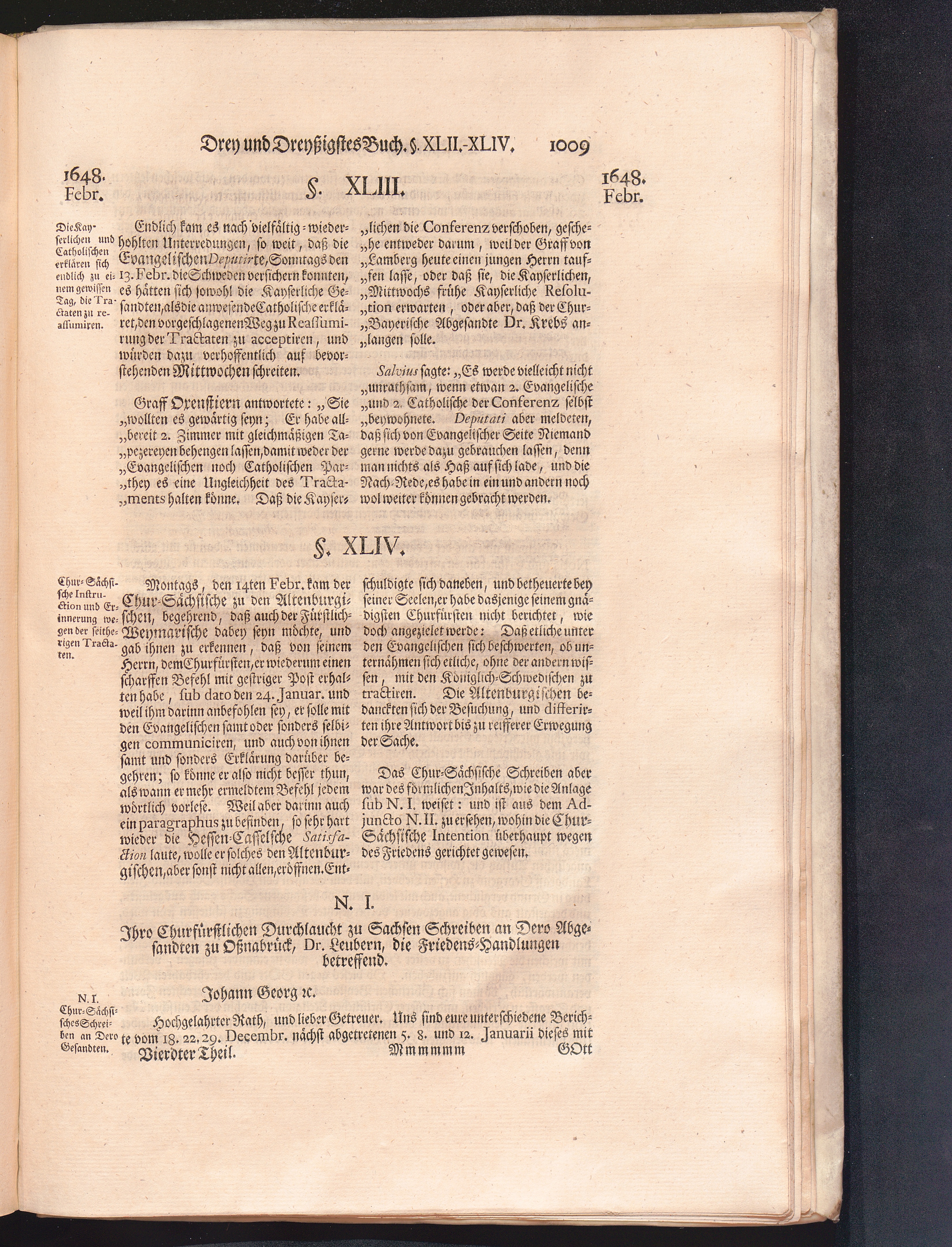 Vierdter Theil (1735) Worinnen enthalten, was vom Anfang des Jahrs 1647. biß gegen Ende desselben zwischen Jhro Römisch-Kayserlichen Majestät, dann den Beyden Cronen Franckreich und Schweden, ingleichen des Heiligen Römischen Reichs Chur-Fürsten, Fürsten und Ständen, zu Oßnabrück und Münster gehandelt worden