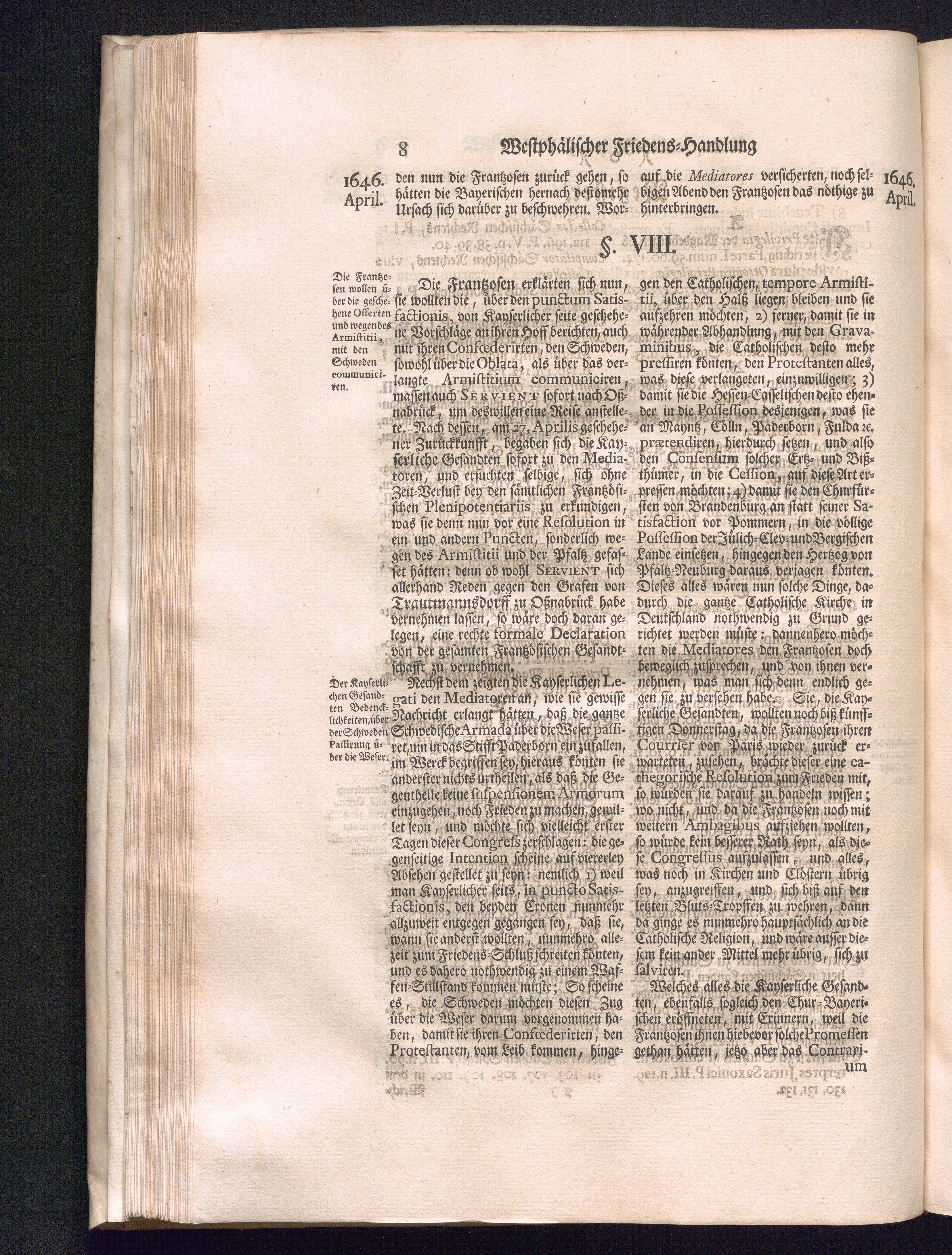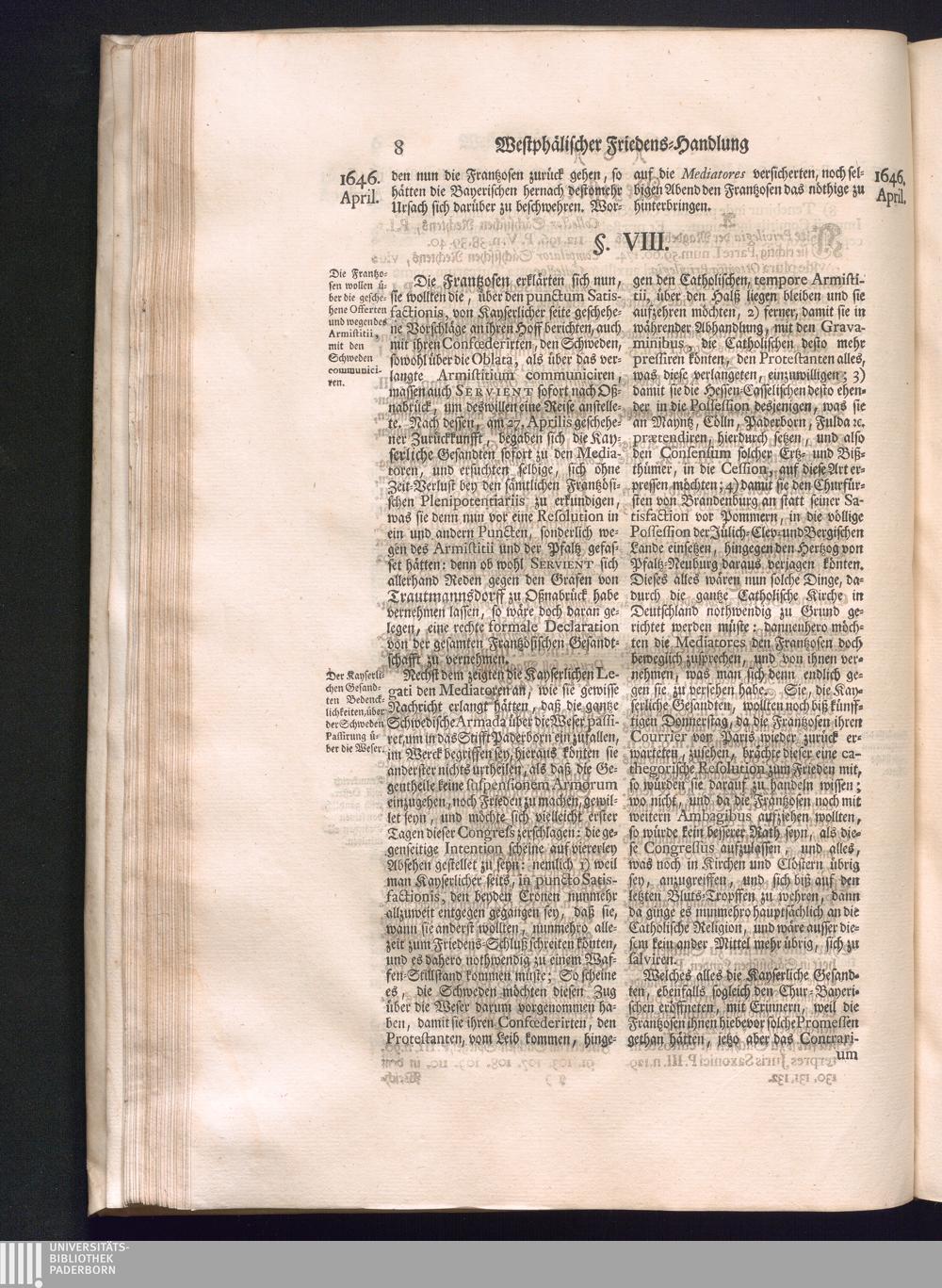 Dritter Theil (1735) Worinnen enthalten, was vom Monath April, biß zu Ende des Jahrs 1646. zwischen Jhro Römisch-Kayserlichen Majestät, dann den Beyden Cronen Franckreich und Schweden, ingleichen des Heiligen Römischen Reichs Chur Fürsten, Fürsten und Ständen, zu Oßnabrück und Münster gehandelt worden