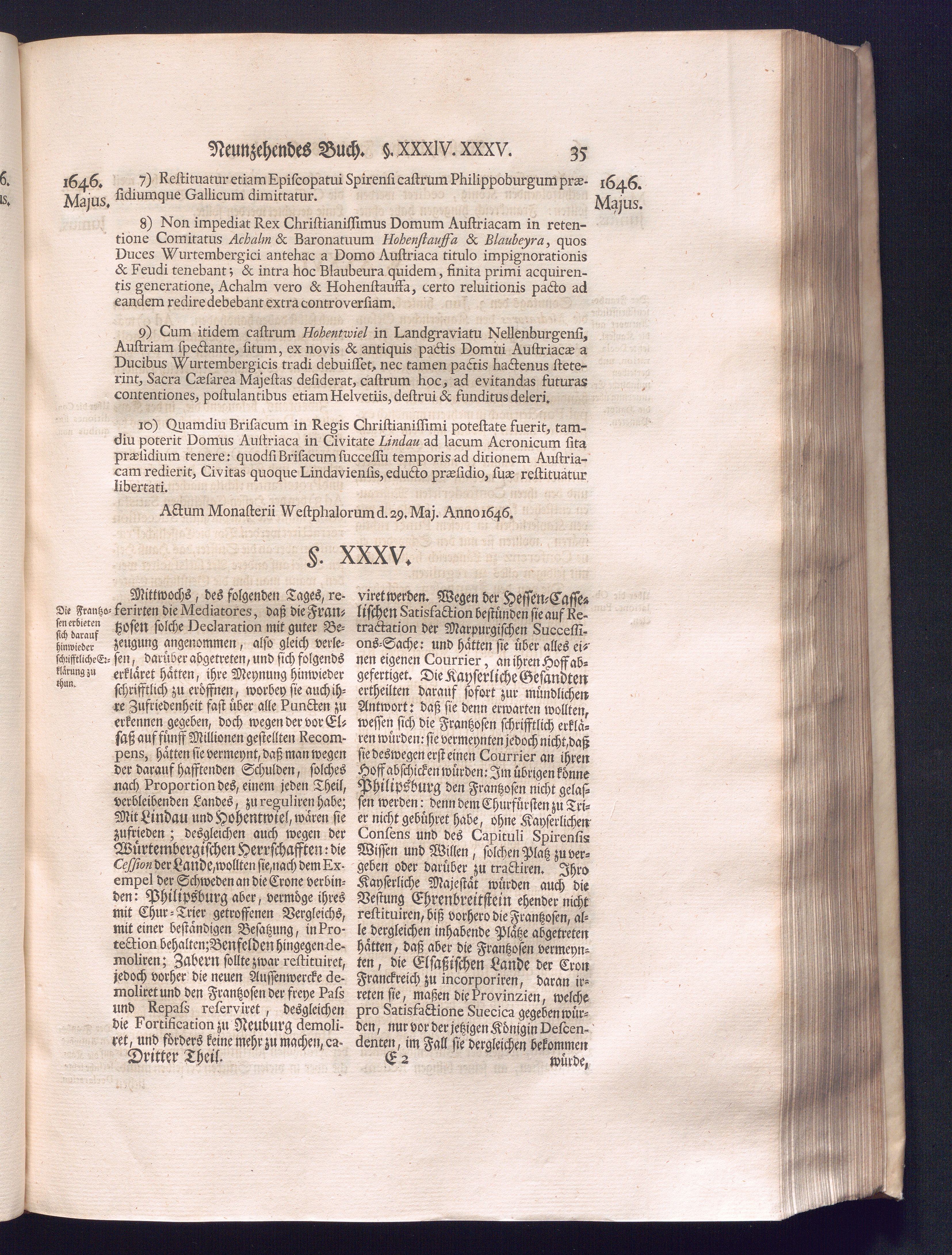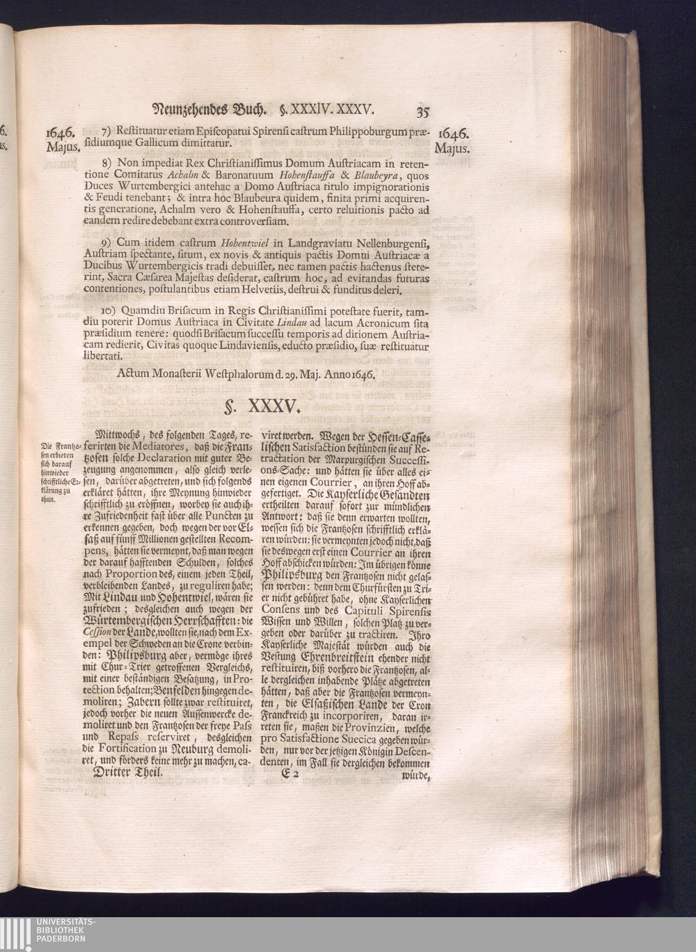 Dritter Theil (1735) Worinnen enthalten, was vom Monath April, biß zu Ende des Jahrs 1646. zwischen Jhro Römisch-Kayserlichen Majestät, dann den Beyden Cronen Franckreich und Schweden, ingleichen des Heiligen Römischen Reichs Chur Fürsten, Fürsten und Ständen, zu Oßnabrück und Münster gehandelt worden