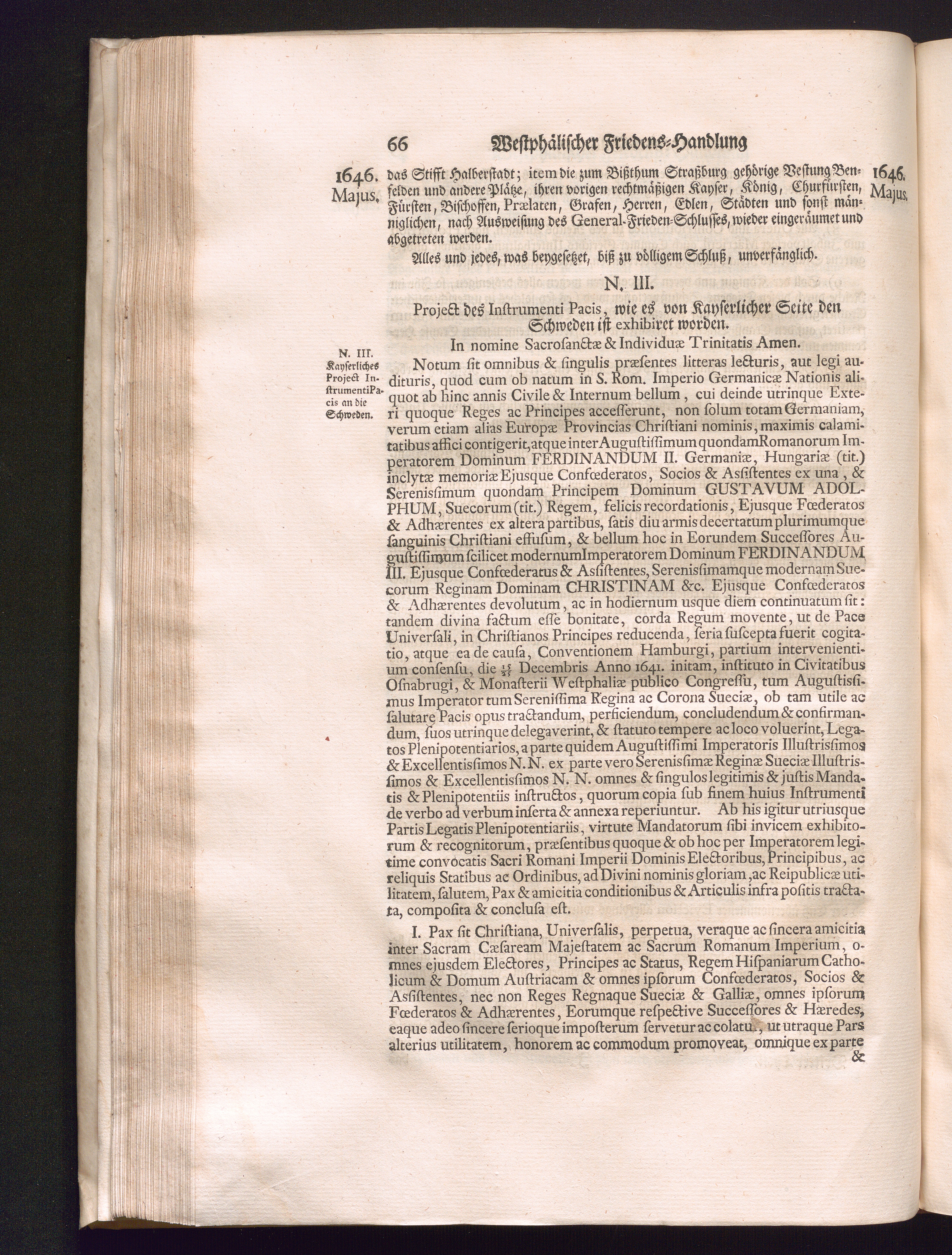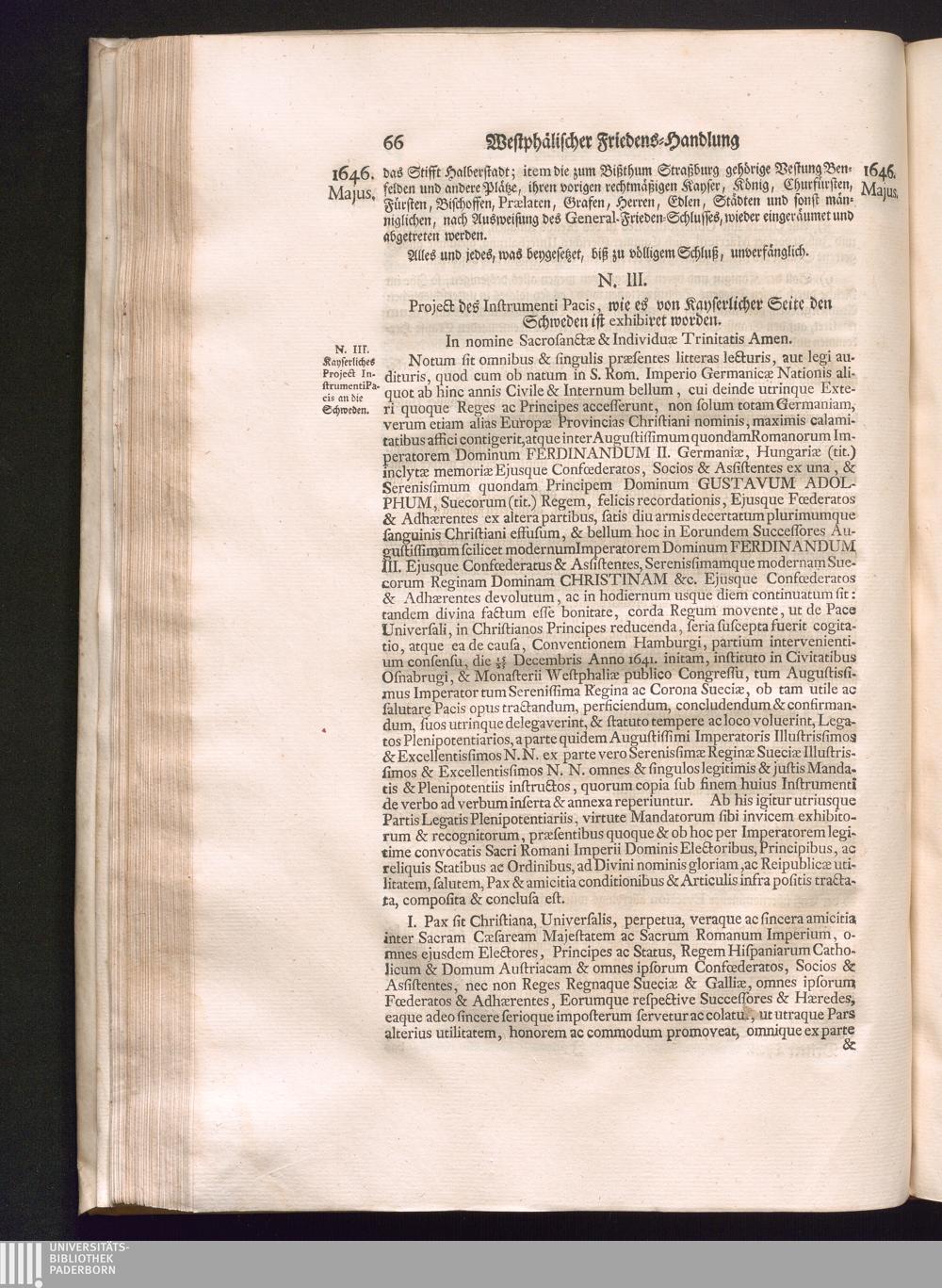 Dritter Theil (1735) Worinnen enthalten, was vom Monath April, biß zu Ende des Jahrs 1646. zwischen Jhro Römisch-Kayserlichen Majestät, dann den Beyden Cronen Franckreich und Schweden, ingleichen des Heiligen Römischen Reichs Chur Fürsten, Fürsten und Ständen, zu Oßnabrück und Münster gehandelt worden